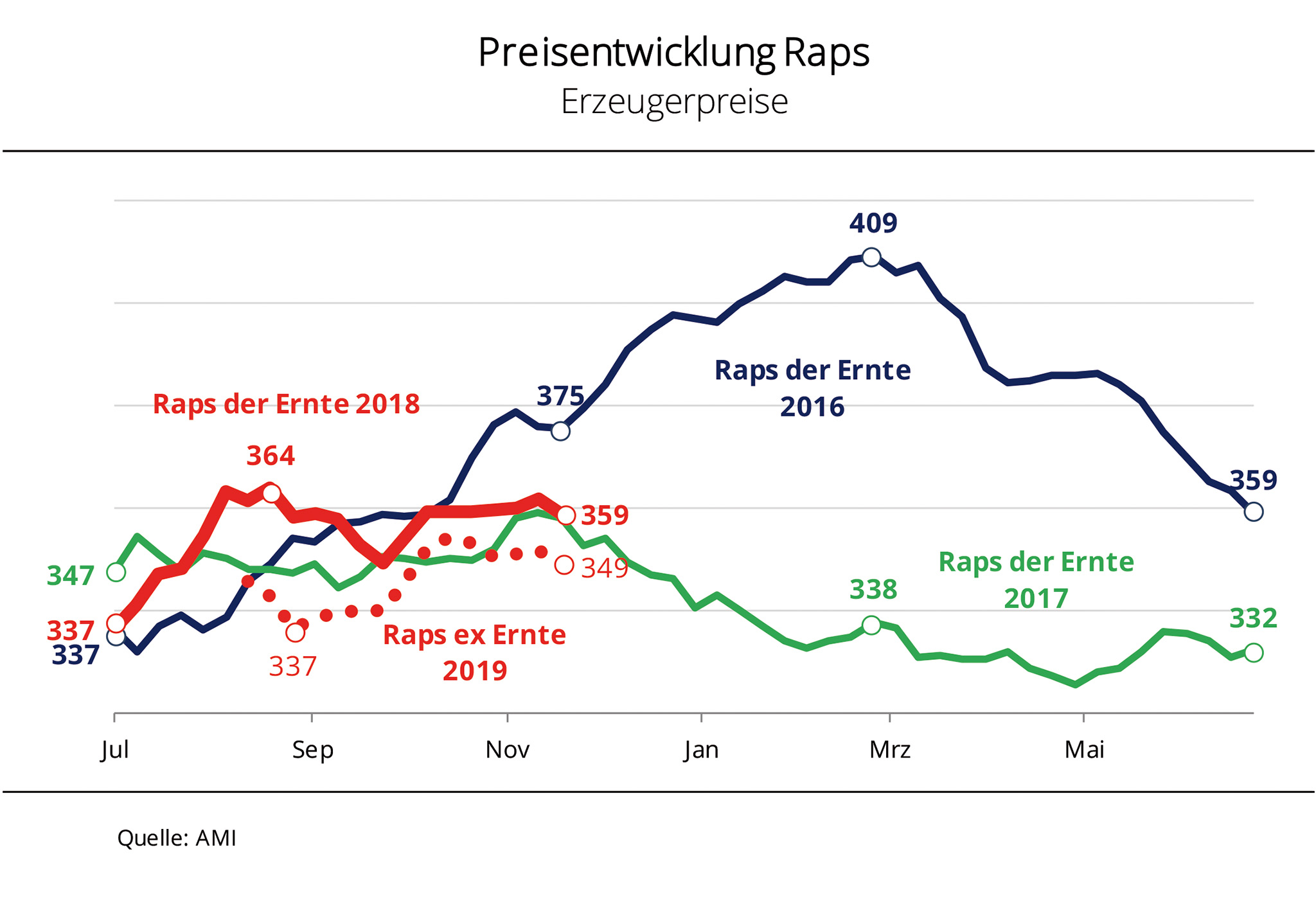 Nach dem kräftigen Anstieg im Sommer haben sich die Rapspreise nur noch wenig bewegt, allerdings wurde auch wenig verkauft.Seit dem starken Preisanstieg im Sommer aufgrund der kleinen Rapsernte, entwickelten sich die Rapspreise in sehr kleinen Schritten leicht nach oben. Damit konnten sie sich von den rückläufigen Sojanotierungen absetzen, allerdings nicht auf das Niveau der Rapspreise der letzten Jahre. Die zuletzt genannten 359 EUR/t lagen auf Vorjahreslinie. Damit war Raps 26 EUR/t preisgünstiger als vor 2 Jahren bei einer damals deutlich größeren deutschen Rapsernte. Die aktuelle Preisentwicklung und vergleichsweise geringen Vorräte veranlassen die Erzeuger, ihren Raps vorerst nicht zu verkaufen. Nach Angaben der Agrarmarkt Informationsgesellschaft mbH (AMI) werden für das 2. Quartal 2019 bessere Absatzchancen erwartet, wo die Versorgung der Ölmühlen noch sehr lückig ist. Dennoch werden Rapserzeuger und Landhandel auch in diesem Vermarktungszeitraum nicht überstürzt Ware abgegeben, weil schon jetzt rege auf Preissteigerungen im Übergang auf die Ernte 2019 spekuliert wird. Die kleine EU-Rapsernte 2018, das absehbar geringe Exportpotenzial Australiens, traditionell wichtigster Lieferpartner der EU, sowie nicht zuletzt die problematische Winterrapsaussaat in Deutschland und Frankreich schüren die Hoffnung auf ein knappes Rapsangebot und infolgedessen steigende Preise. Mit einer Belebung des Rapsmarktes ist deshalb zu Beginn des neuen Jahres nicht zu rechnen, weil die Preisvorstellungen von Ölmühlen und Erzeugern dann noch zu weit auseinanderliegen dürften.