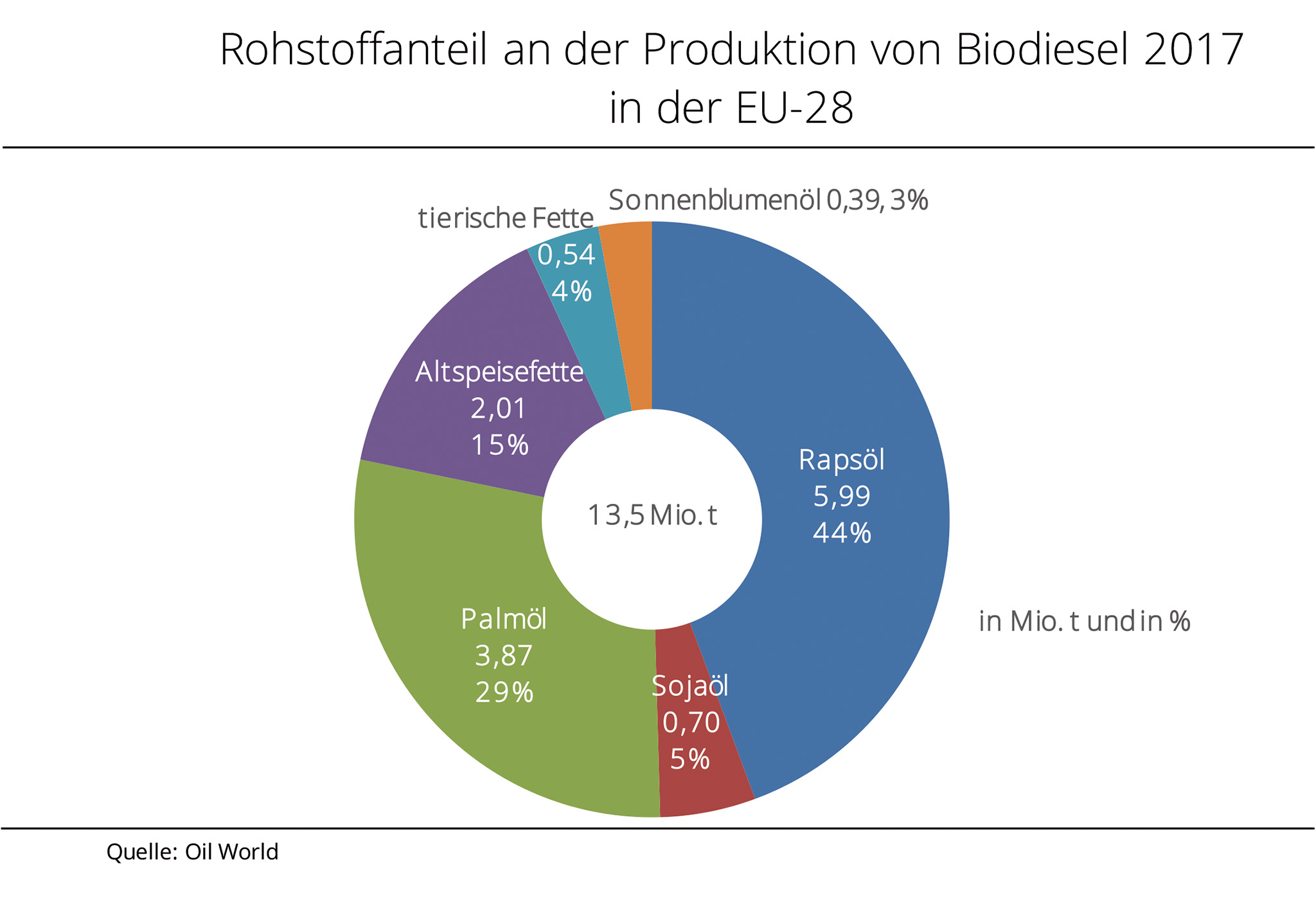 Auch in der Biodieselherstellung bestimmen maßgeblich Verfügbarkeit und Preis der pflanzlichen und tierischen Öle und Fette den Einsatz. In der Europäischen Union ist Rapsöl nach wie vor die wichtigste Rohstoffquelle für die Biodieselproduktion. Mit dem geringeren Angebot und der damit einhergehenden Verteuerung des Rohstoffes schrumpfte der Anteil jedoch leicht von 48% in 2016 auf 44% in 2017%. Die wachsende Konkurrenz billiger Rohstoffe aus Übersee bei gleichzeitig knappem und damit teurem Rapsöl drosselte die Chancen für die heimische Ölsaat. So wuchs der Anteil an Biodiesel und hydriertem Pflanzenöl (HVO) aus Südostasien an der EU-Biodieselerzeugung (einschließlich HVO) auf 29 %. In Ländern wie Italien, Spanien und den Niederlanden ist importiertes Palmöl Rohstoff Nr. 1 zur Biodieselherstellung, in Deutschland und Frankreich ist es Rapsöl. Die Verwendung von Altspeisefetten hat demgegenüber nur noch marginal zugenommen, obgleich die Politik dessen Einsatz besonders fördert. Biokraftstoffe aus Abfall- und Reststoffen werden, mit Ausnahme von Deutschland, doppelt auf nationale Quotenverpflichtungen (energetisch) angerechnet, um den für alle Mitgliedsstaaten verbindlichen Anteil erneuerbarer Energien im Transportsektor bis 2020 auf 10 % zu erhöhen.