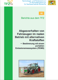 Das reale Emissionsverhalten (Real Driving Emissions - RDE) von Fahrzeugen und Maschinen gewinnt zunehmend an Bedeutung. Im Bereich der mobilen Arbeitsmaschinen des Non-Road-Sektors, z. B. Traktoren, wurden bisher nur sehr wenige Emissionsmessungen unter realen Bedingungen durchgeführt. Für die Nutzung von Biokraftstoffen liegen kaum Erkenntnisse vor. Daher wurden am TFZ Forschungsarbeiten zum realen Emissionsverhalten von Non-Road-Maschinen im Betrieb mit Rapsölkraftstoff, Dieselkraftstoff und Methan durchgeführt, bei denen ein portables Emissionsmesssystem (PEMS) verwendet wurde. Außerdem wurden im Rahmen der Arbeiten Untersuchungen an PKW durchgeführt, die mit Bioethanol und CNG betrieben werden. Die im TFZ Bericht 62 dokumentierten Ergebnisse zeigen, dass das Emissionsverhalten im realen Betrieb von zufälligen Ereignissen während der Fahrt deutlich stärker beeinflusst wird als von der Art des Kraftstoffs. Im Bericht werden zudem verschiedene Auswertevarianten gegenübergestellt und Ergebnisse von Vergleichsmessungen zwischen dem PEMS und stationären Gasanalysesystemen präsentiert.