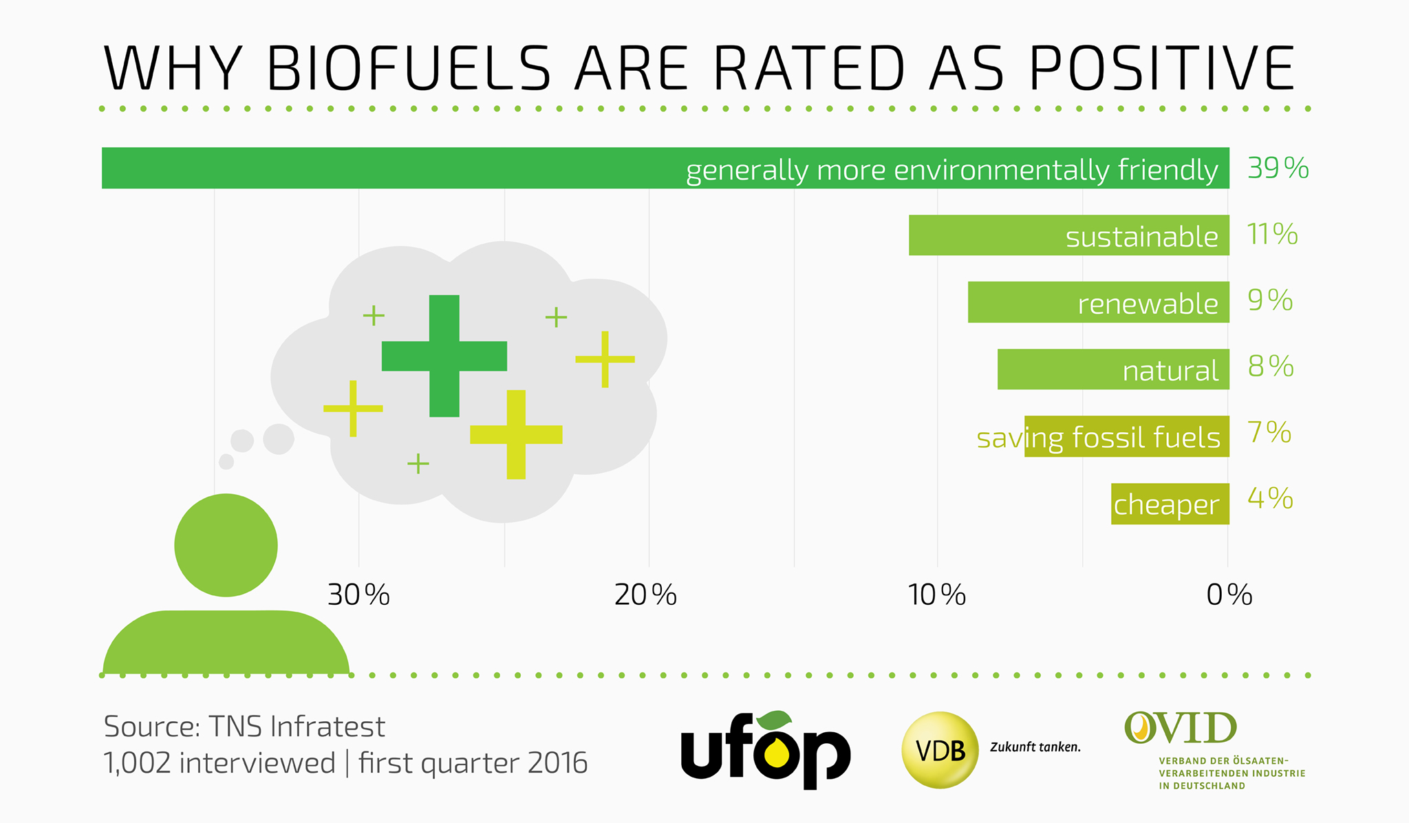 39 percent justify their positive attitude towards biofuels on the grounds that biofuel and bioethanol are more environmentally friendly than fossil fuels. “Biofuels reduce greenhouse gas emissions considerably. Depending on the raw materials, they cut down on between 60 and 90 percent of greenhouse gas emissions in comparison to fossil fuels”, states Stephan Arens, Manager of the Union for the Promotion of Oil and Protein Plants (UFOP). In order to achieve the highest possible reduction values, work is done at each step of the biofuels production chain to further optimise the processes. “The biofuels sector is a pioneer in the development of sustainable production processes - also in the agricultural sector. For this reason, biofuels are an important building block for the clean mobility of tomorrow”, said Arens.
