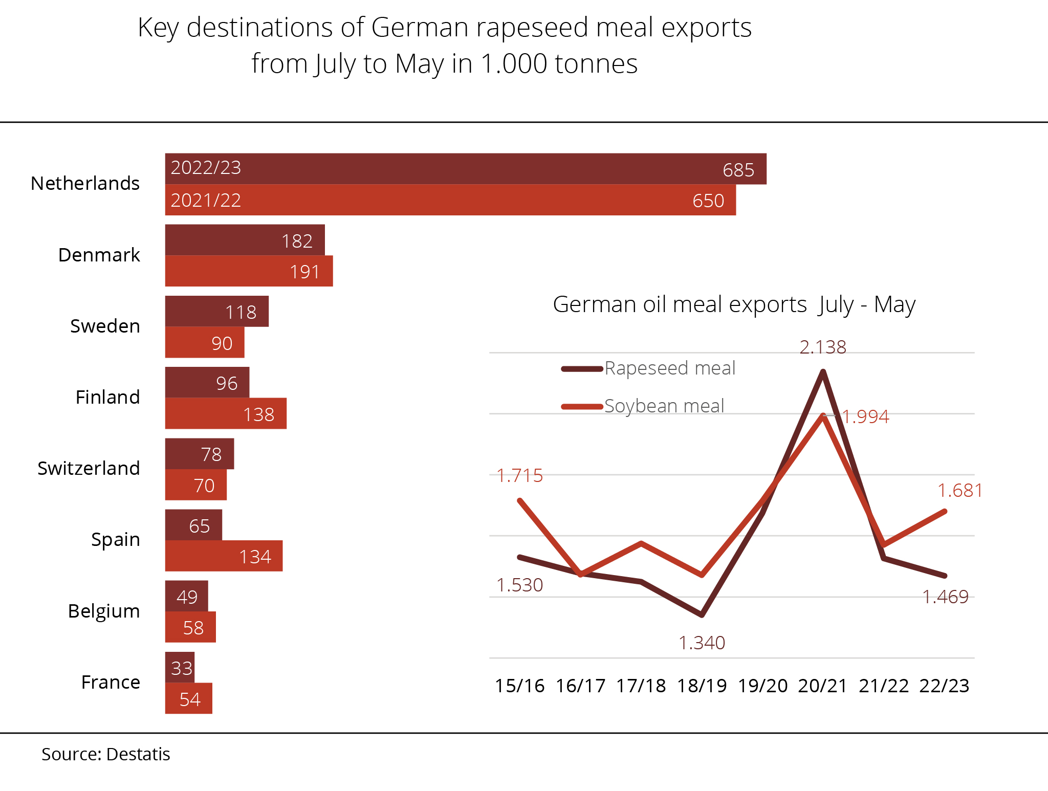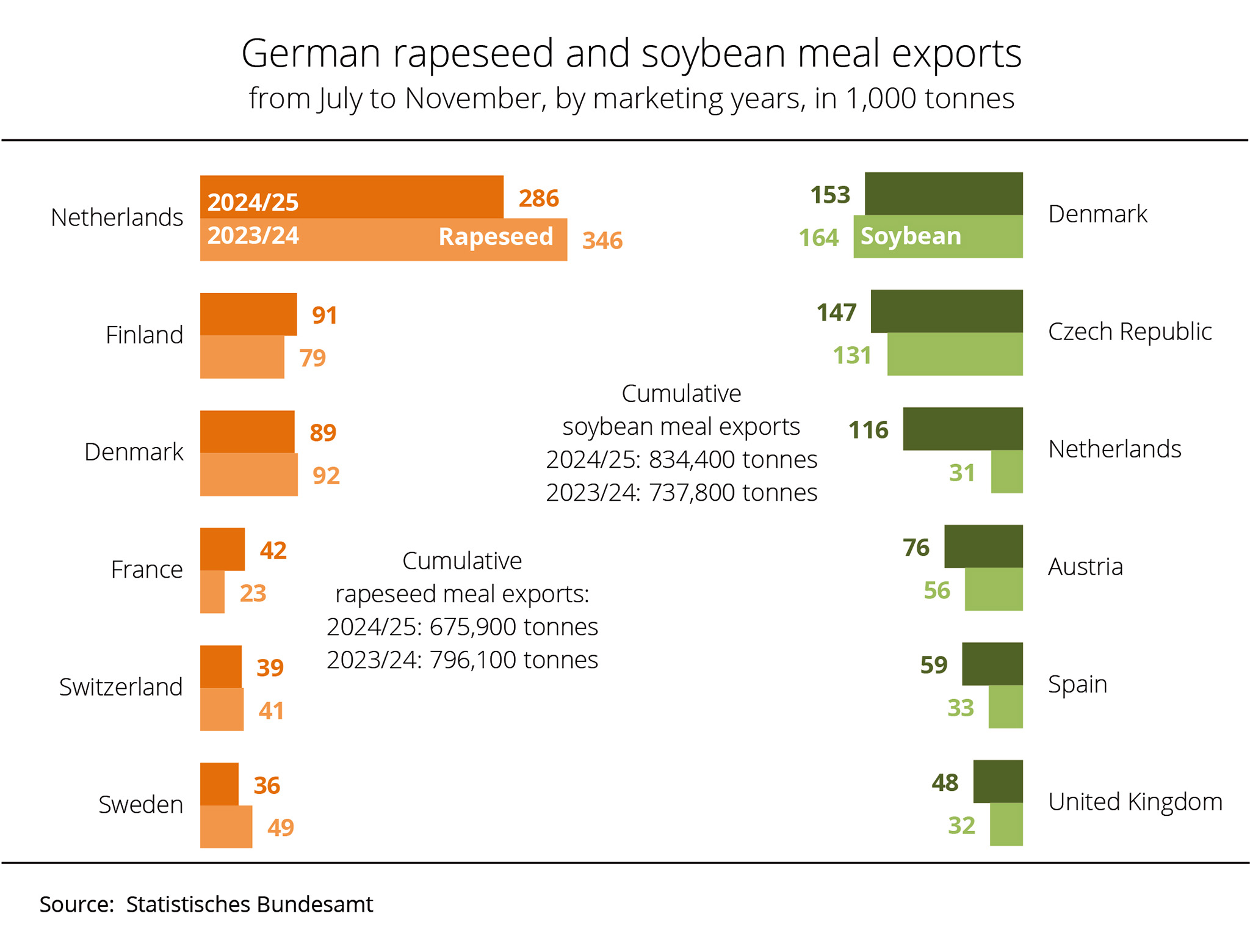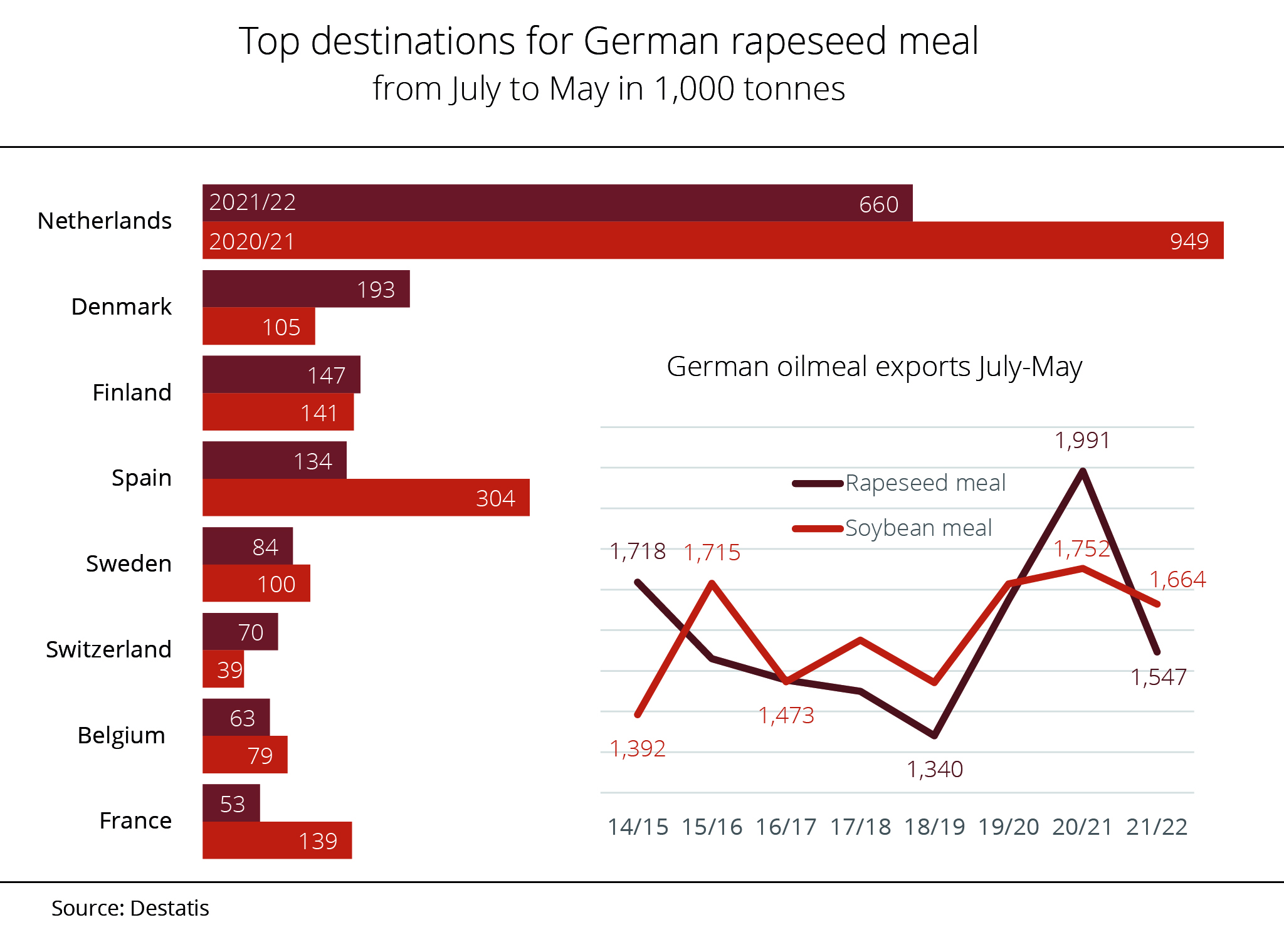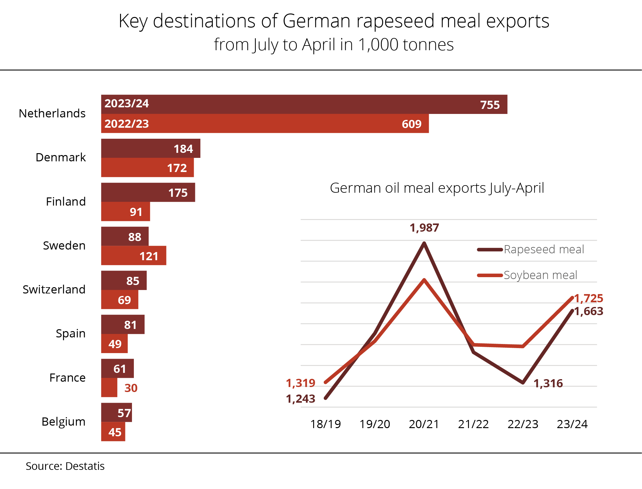 German rapeseed meal exports fell 22 per cent short of the previous year's record volume. Main buyers, such as the Netherlands, Spain and France, imported considerably less, whereas Denmark, Finland and Switzerland ordered more.