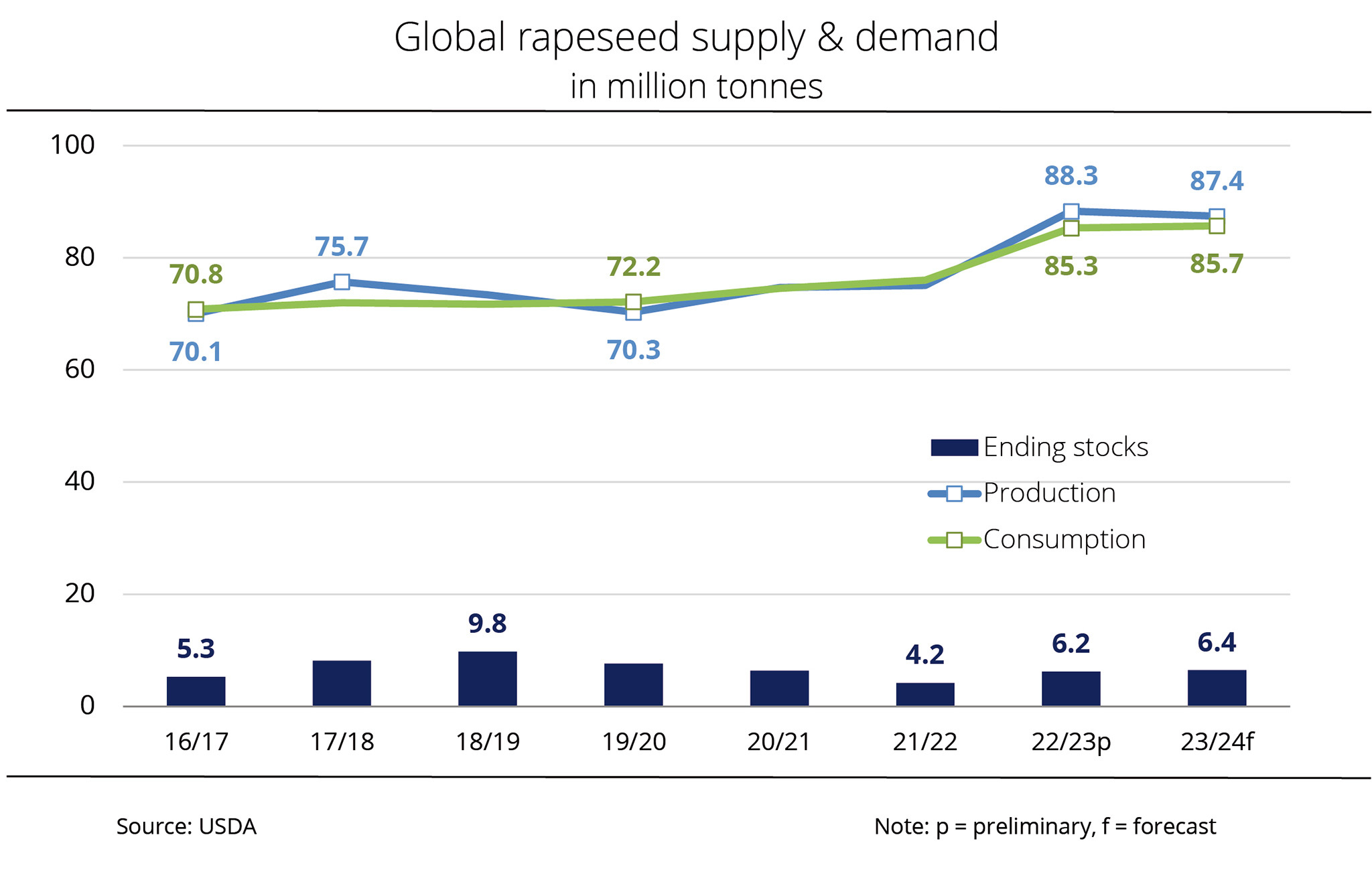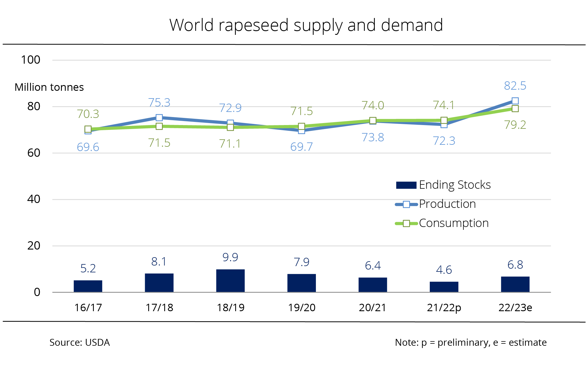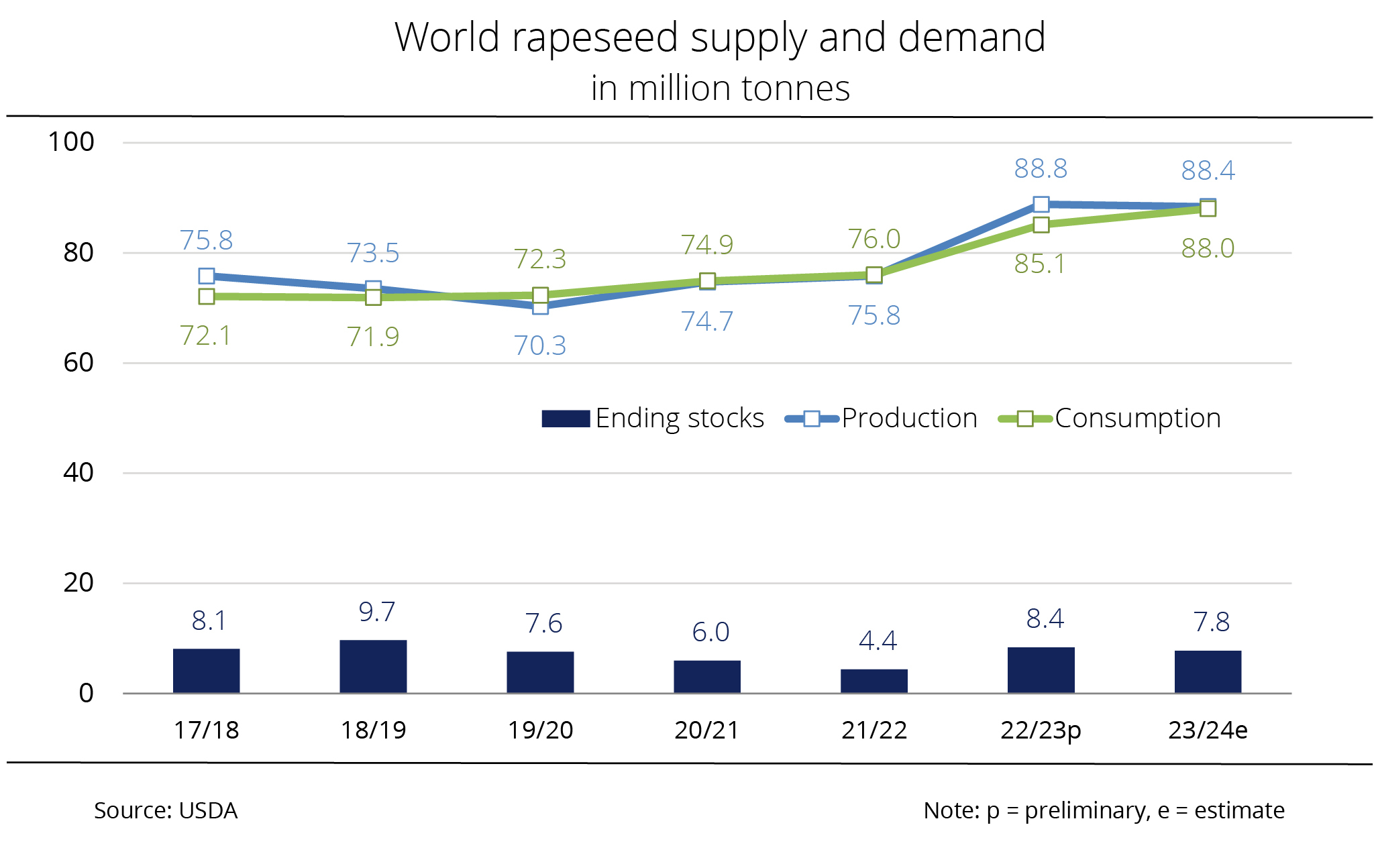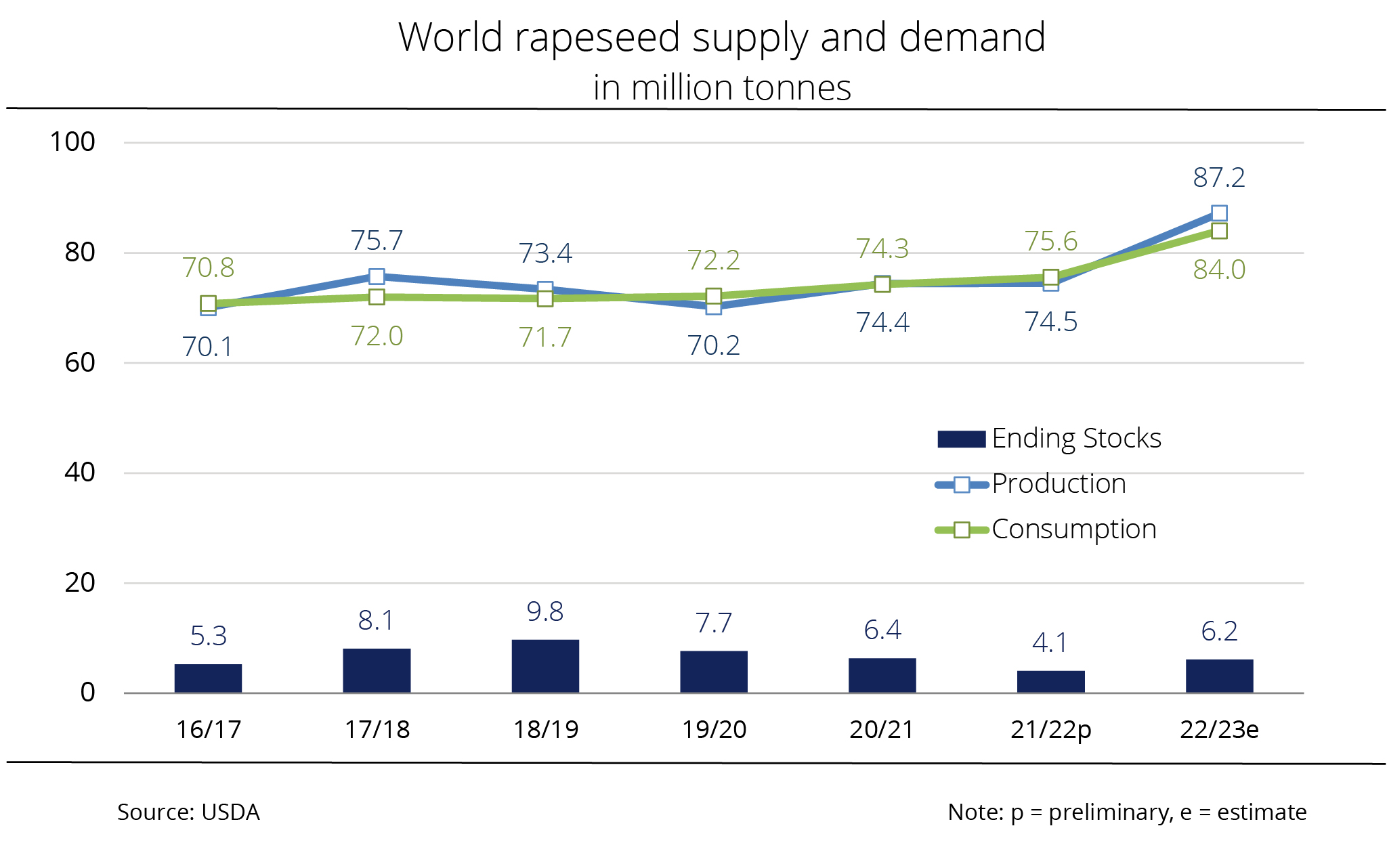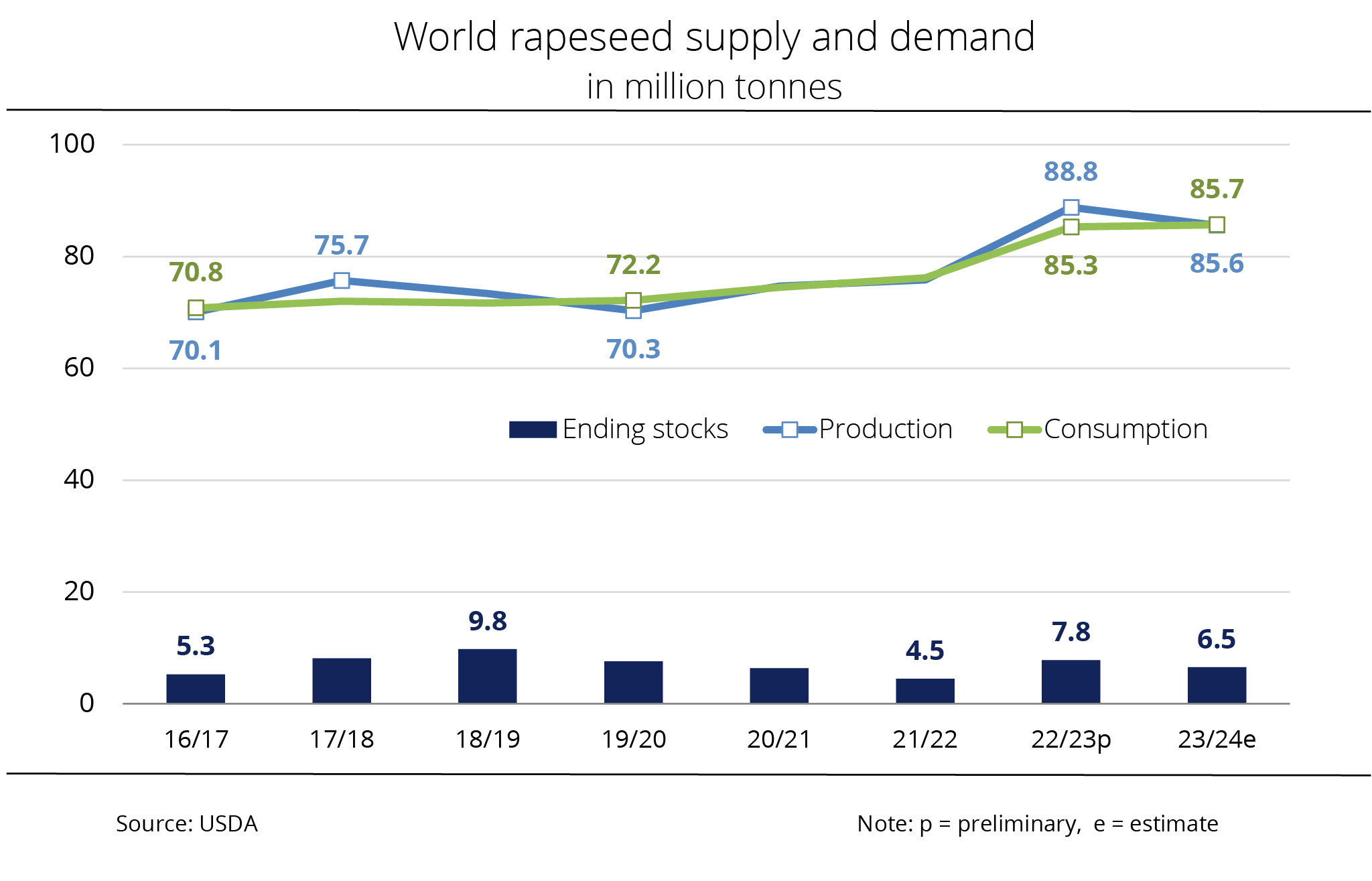 Given the presumably larger rapeseed production, global 2022/23 ending stocks are likely to increase significantly. At 6.8 million tonnes, the USDA not only sees stocks just less than 900,000 tonnes higher than in the previous month's estimate, but also up 47.5 per cent from the previous year's figure. These would be the largest ending stocks in three years.
