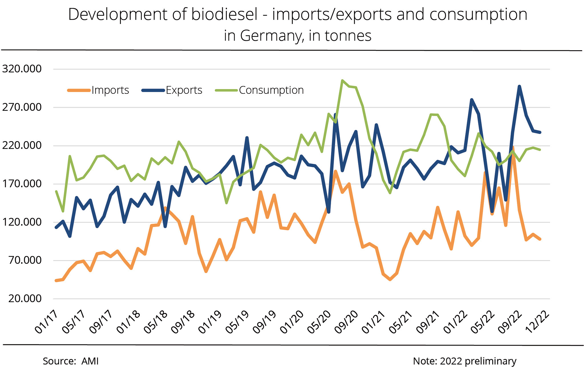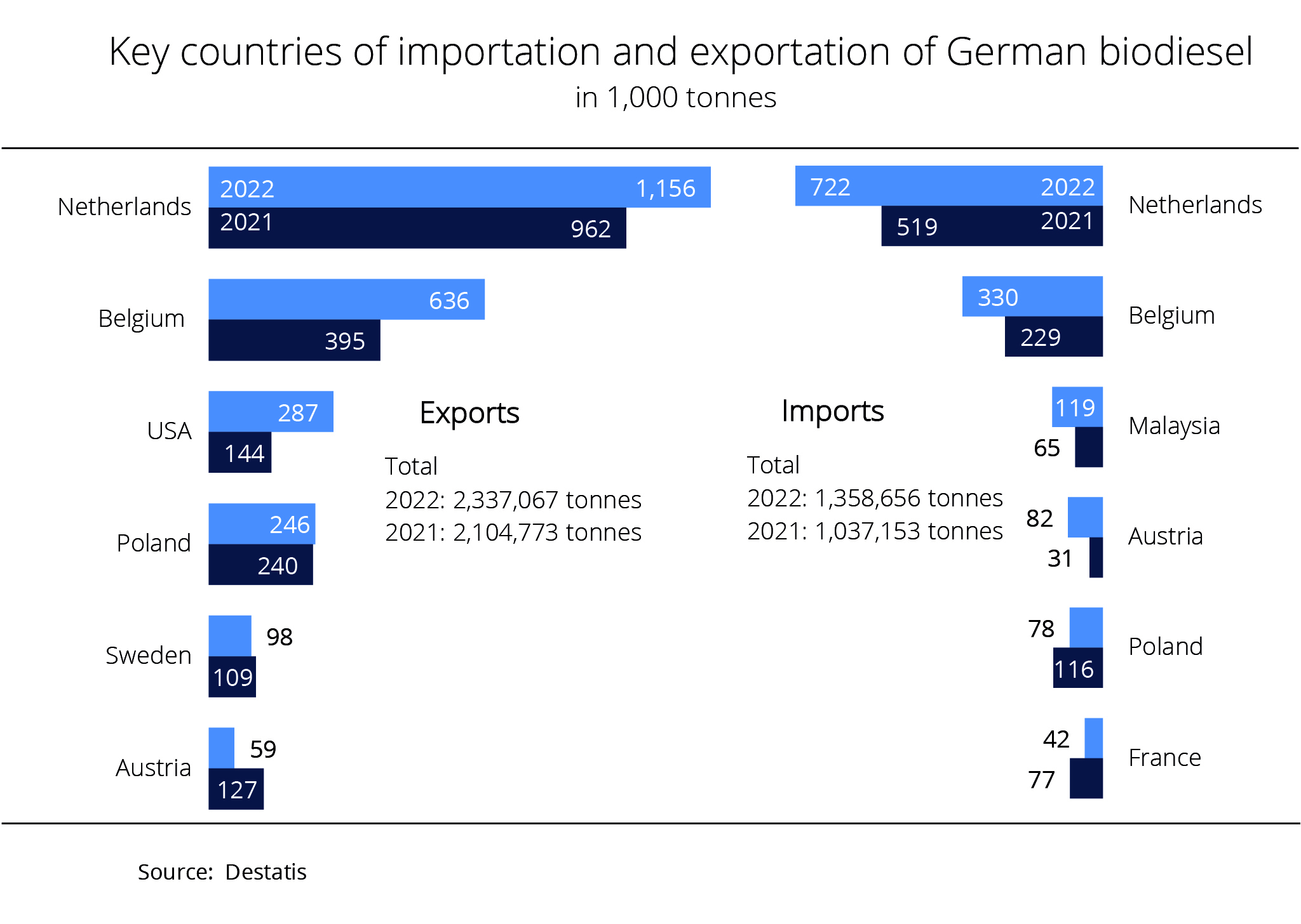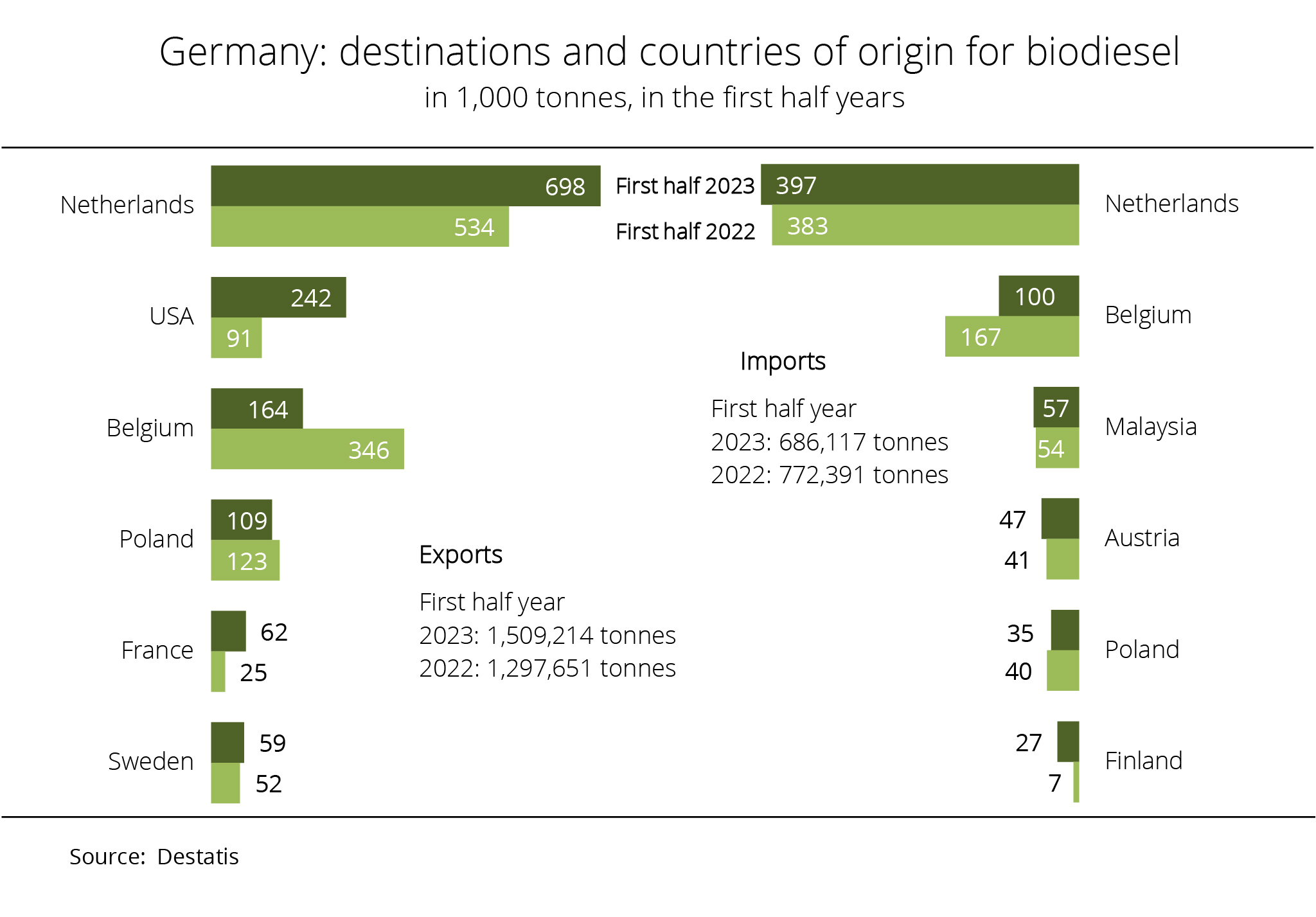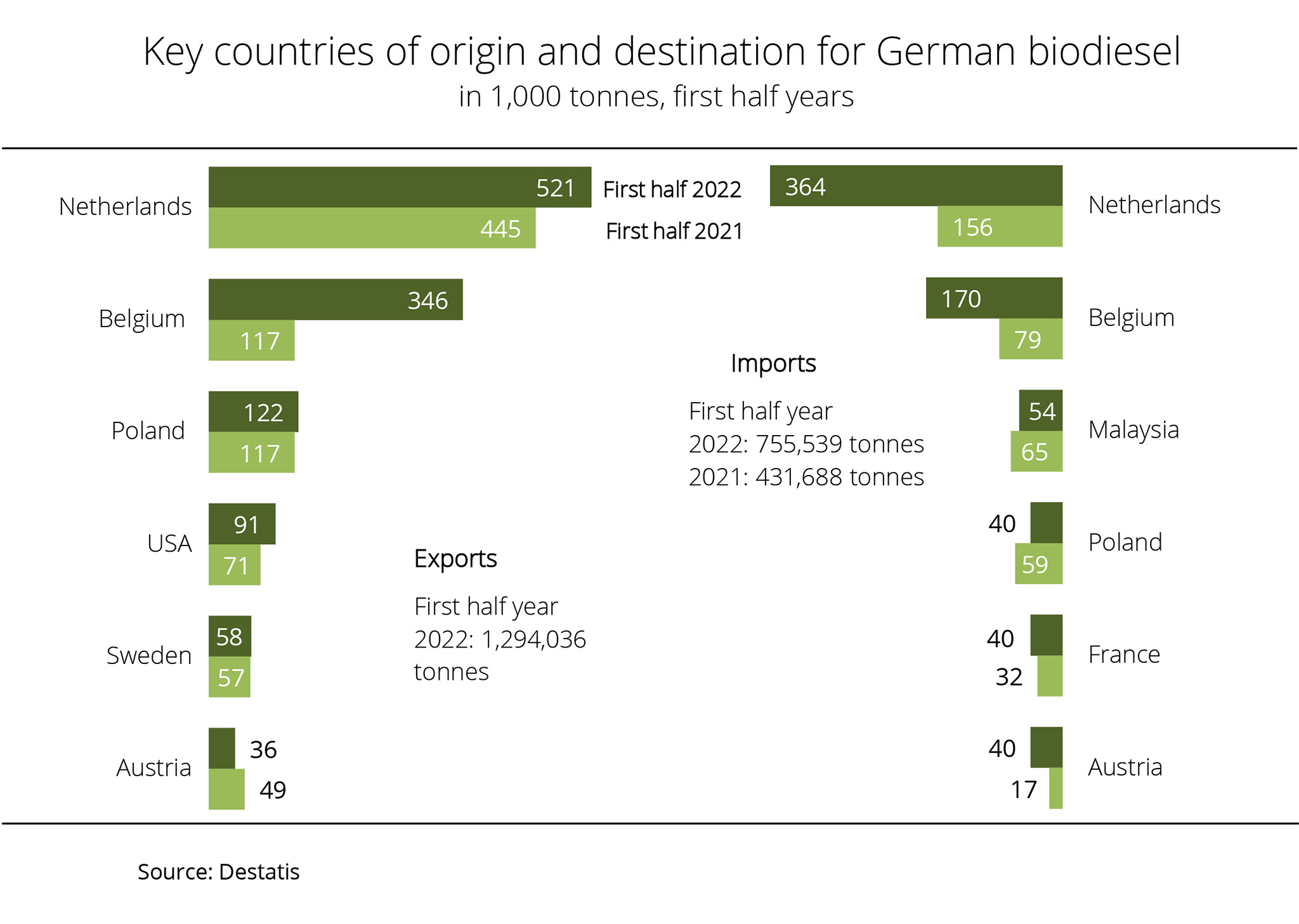 According to figures published by the German Federal Statistical Office, Germany exported around 1.3 million tonnes of biodiesel in the first half year of 2022. By contrast, imports amounted to 755,539 tonnes. The Netherlands, the principal EU marketplace for biodiesel, continued to be the primary trading partner, accounting for 40 per cent and 48 per cent of total exports and imports respectively. Imports more than doubled after having declined considerably in the previous year. According to investigations conducted by Agrarmarkt Informations-Gesellschaft (mbH), larger shipments also came from Belgium, Malaysia and Poland. Whereas imports from Belgium also more than doubled, imports coming directly from Malaysia decreased around 17 per cent.