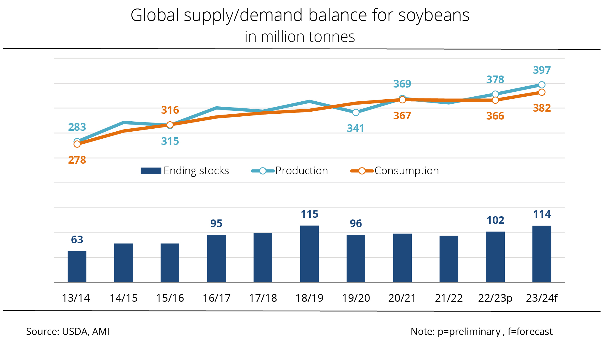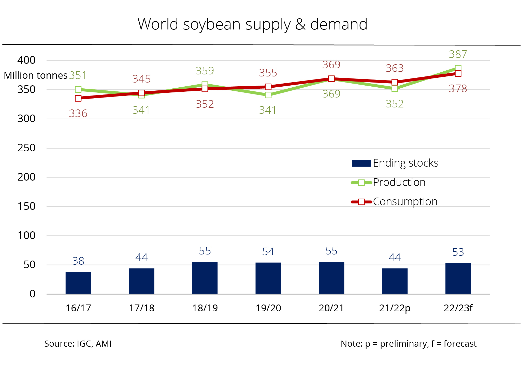 Global soybean consumption is currently estimated at 378 million tonnes. This is down 1 million tonnes on the August outlook, but 4.3 per cent higher than 2021/22. Demand is expected to see a sharp increase, especially in China, but equally in Bangladesh and Pakistan.