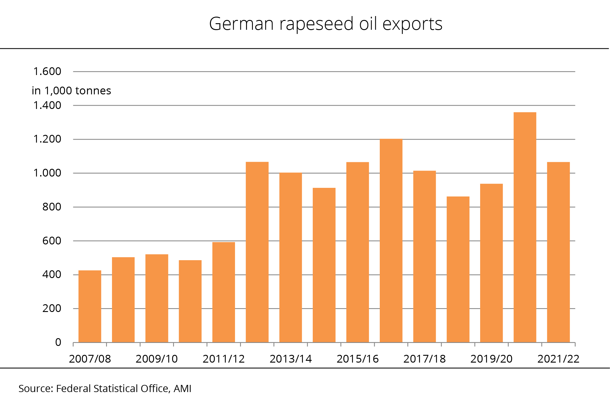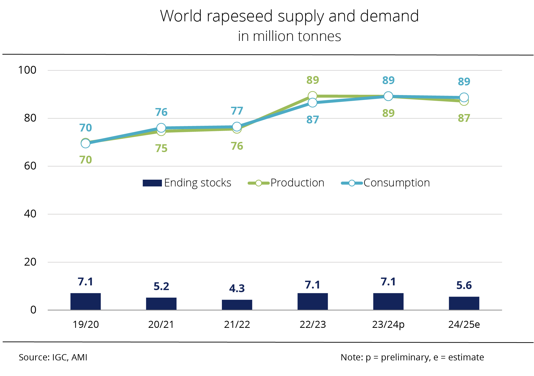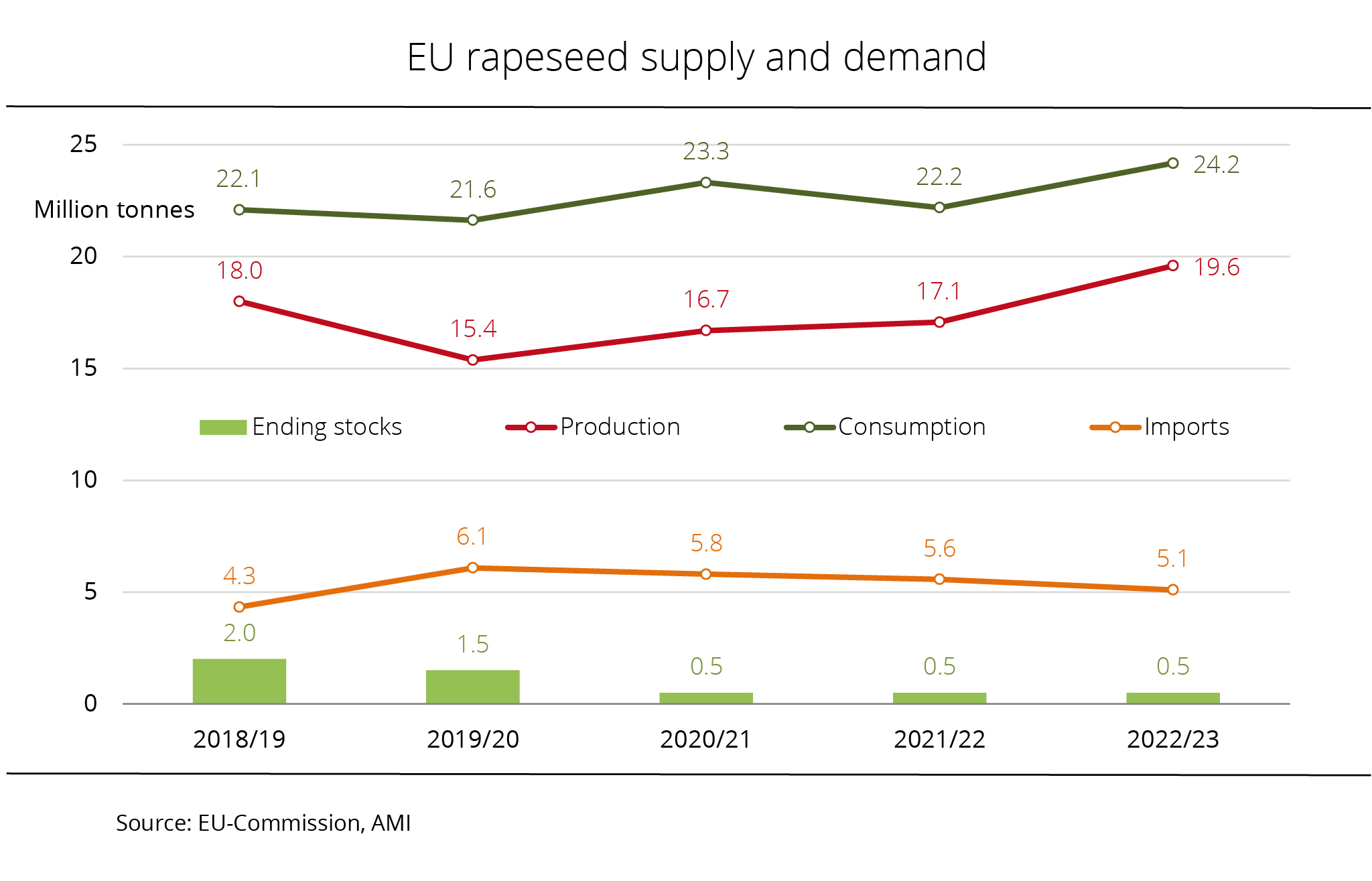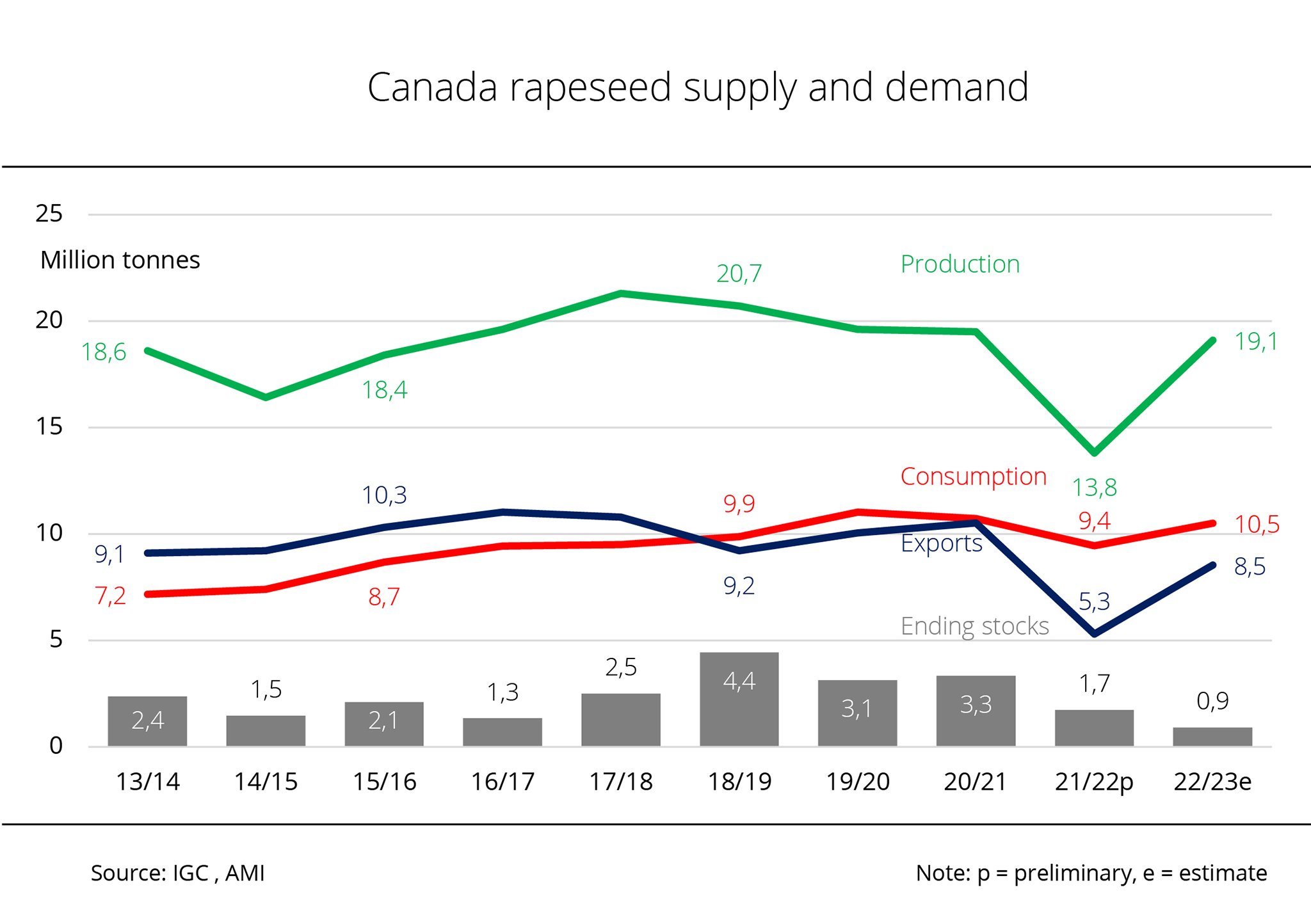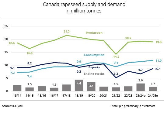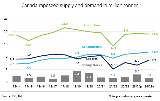 Based on a domestic rapeseed consumption of 10.5 million tonnes, around 1.1 million tonnes more than the past crop year, there will be a surplus of 8.6 million tonnes. Nevertheless, in view of low beginning stocks, supplies - at 900,000 tonnes - will likely fall short of the previous year's volume of 1.7 million tonnes. AMI believes that due to larger Canadian production, rapeseed exports will presumably rise significantly to around 8.5 million tonnes. This would translate to a 60.3 per cent rise year-on-year. Domestic consumption could also increase. Forecast at 10 million tonnes, it would exceed the previous year's volume by 16.3 per cent.