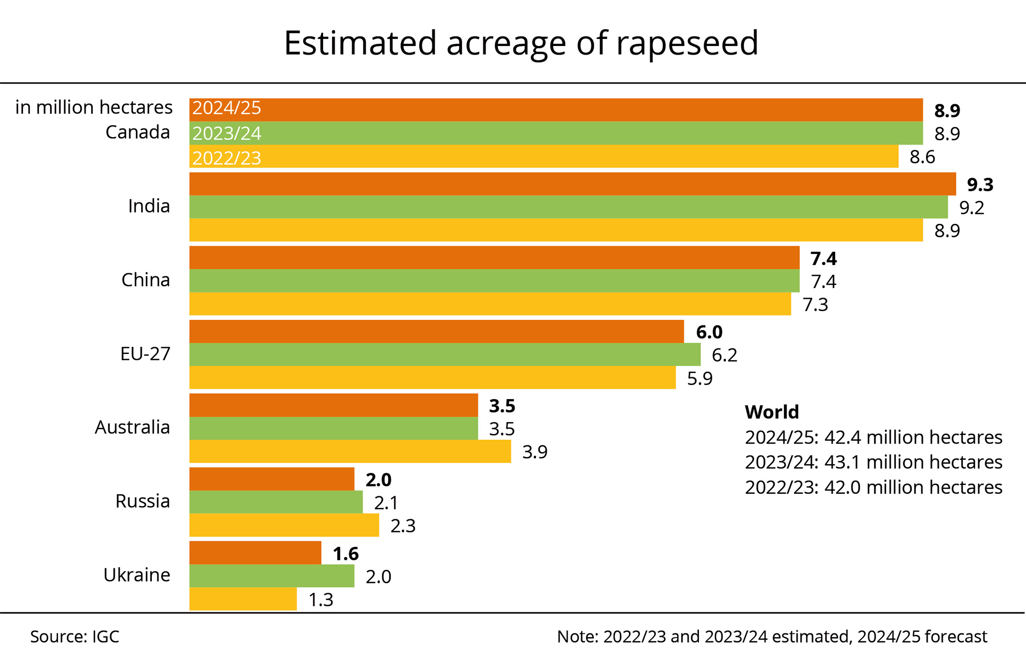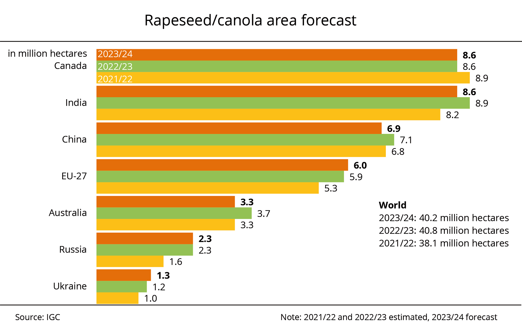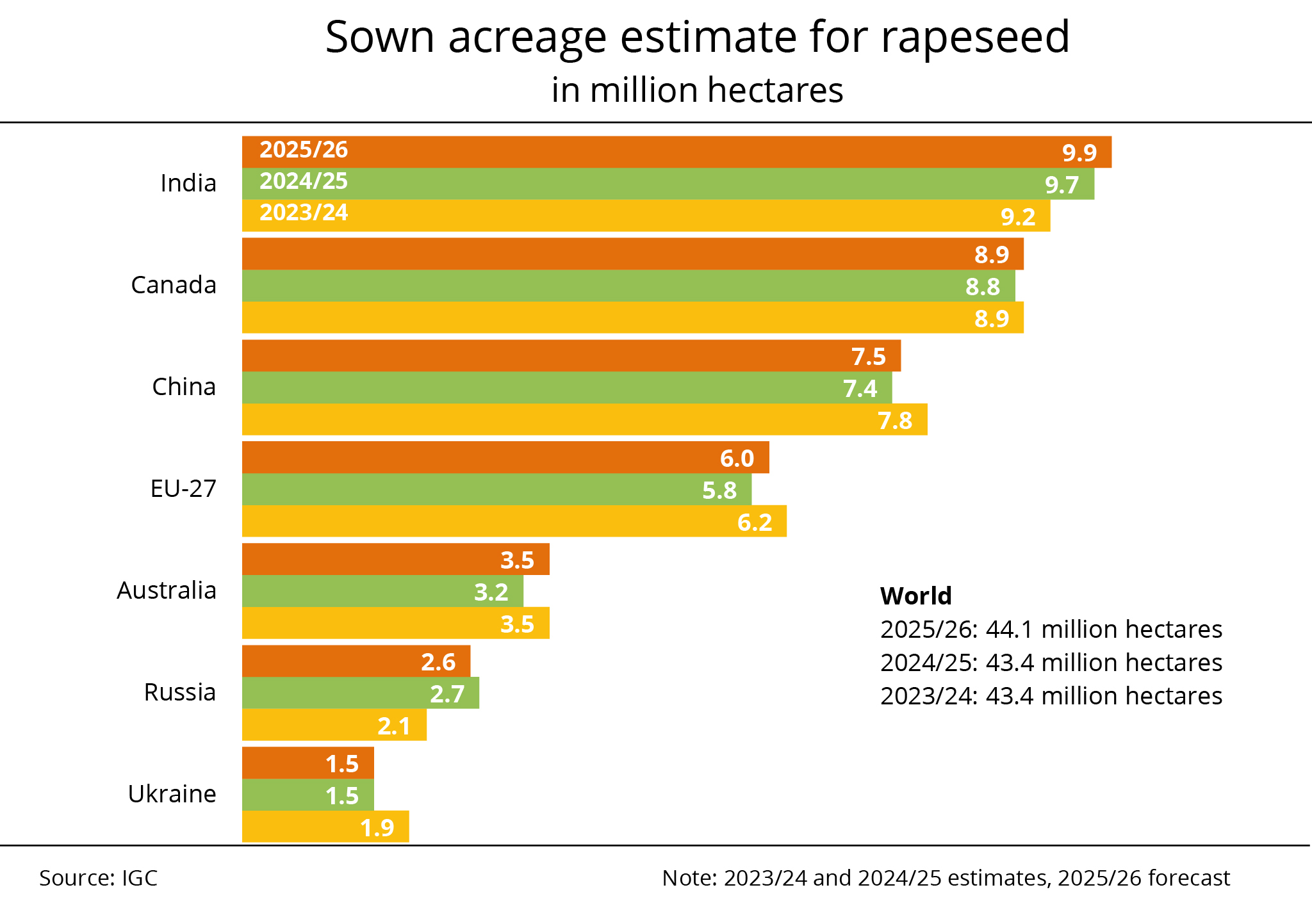 France, Germany, Poland and Romania together account for around three quarters of total EU production. The FAS expects the rapeseed area to increase in all these countries. The International Grains Council (IGC) recently published a slightly more cautious outlook, expecting the rapeseed area to remain stable at around 6.1 million hectares.