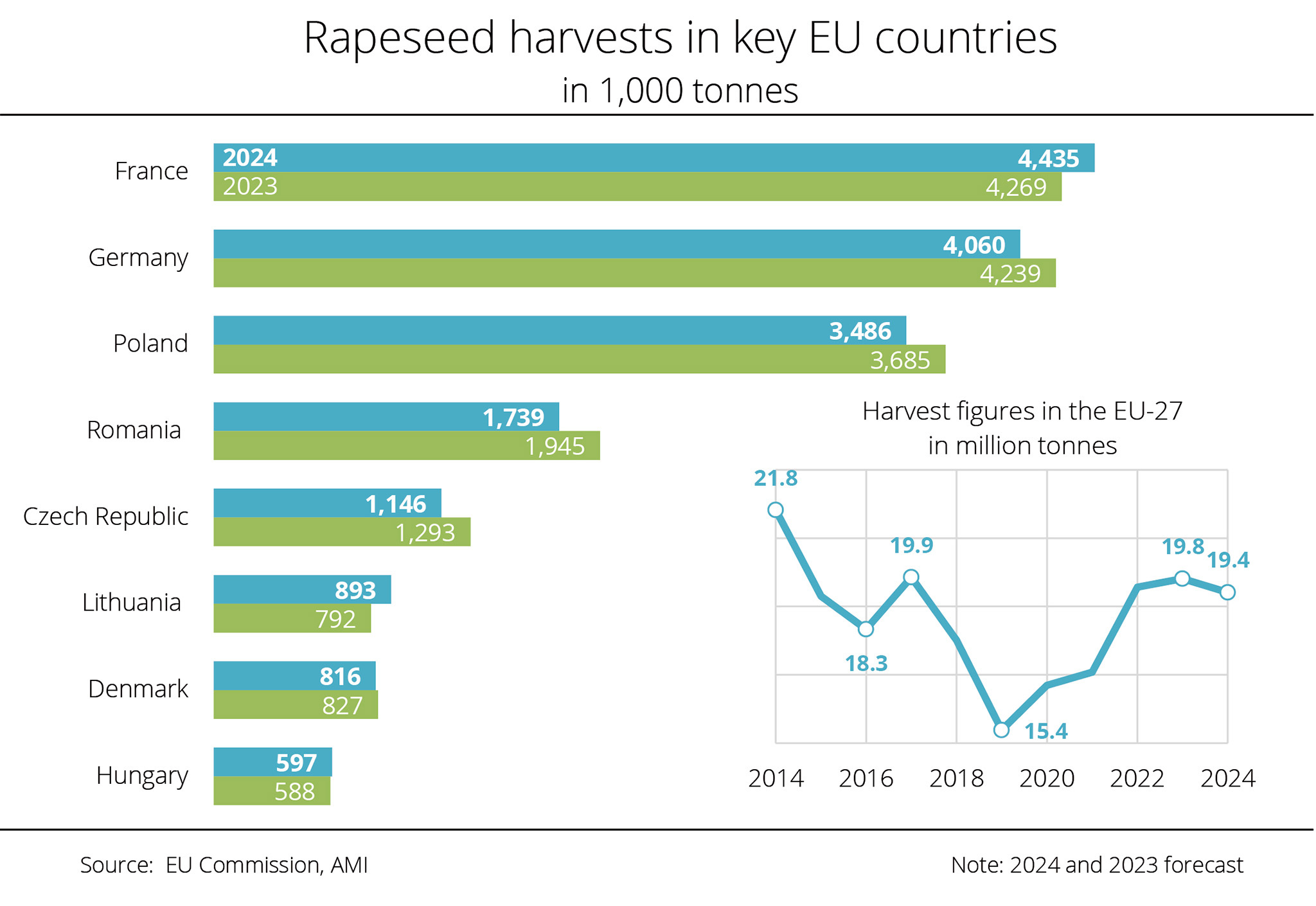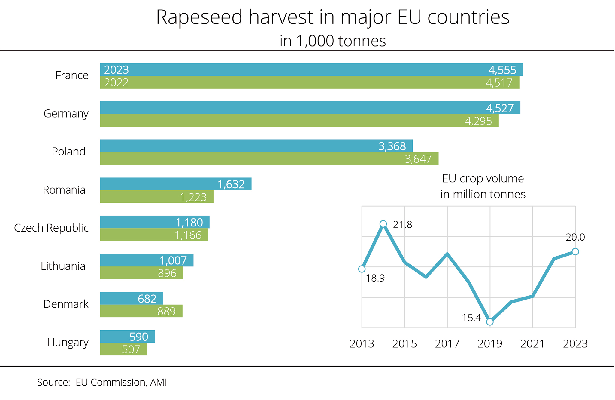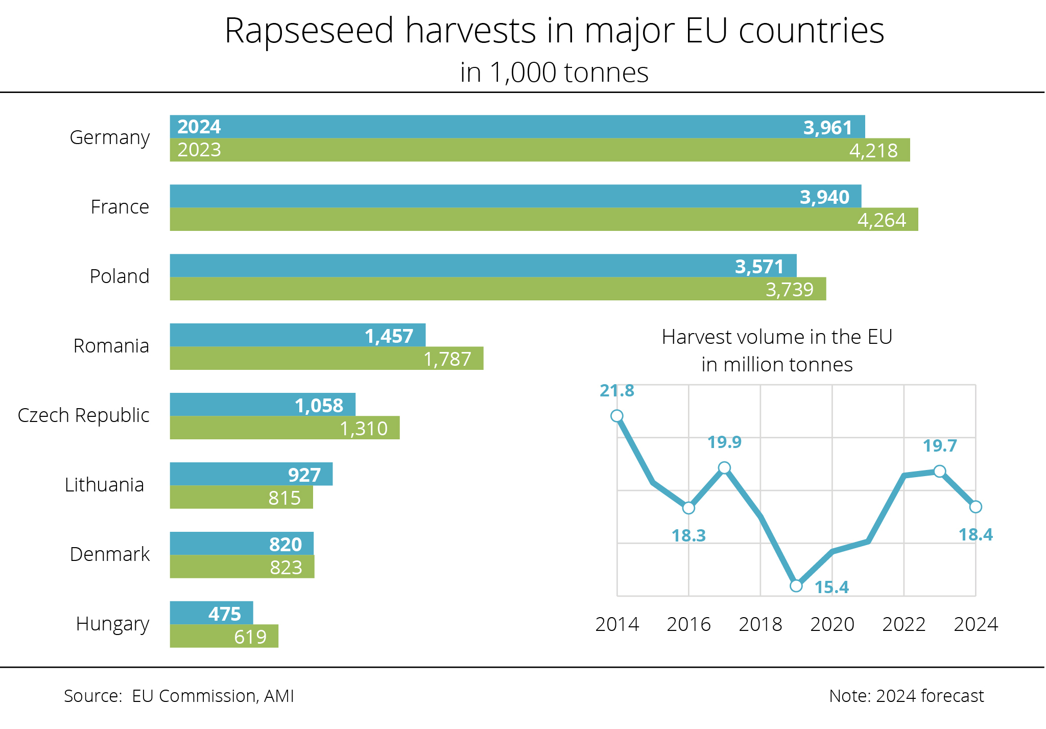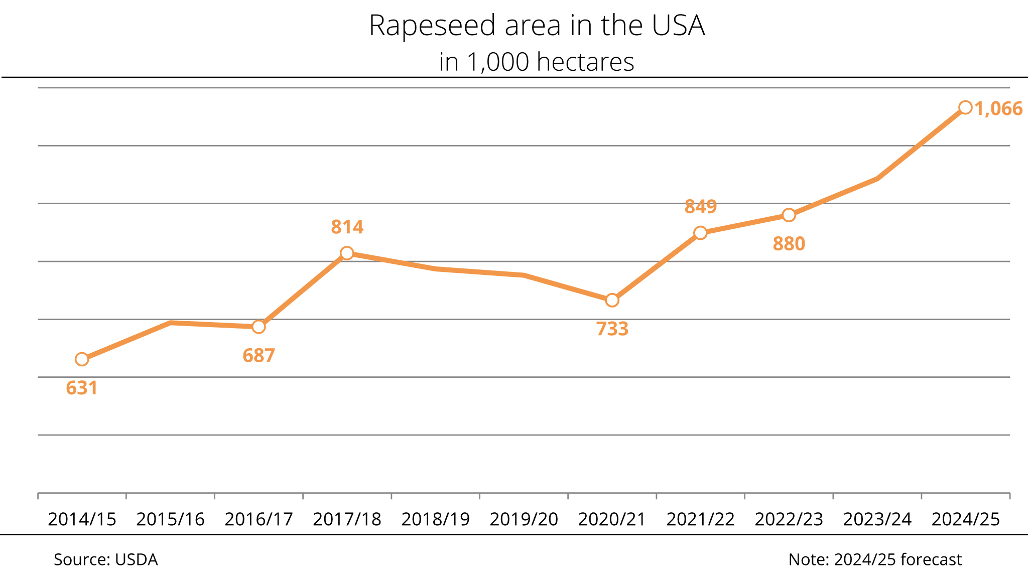 France, Germany, Poland and Romania together account for around three quarters of total EU production. The FAS expects the rapeseed area to increase in all these countries. The International Grains Council (IGC) recently published a slightly more cautious outlook, expecting the rapeseed area to remain stable at around 6.1 million hectares.