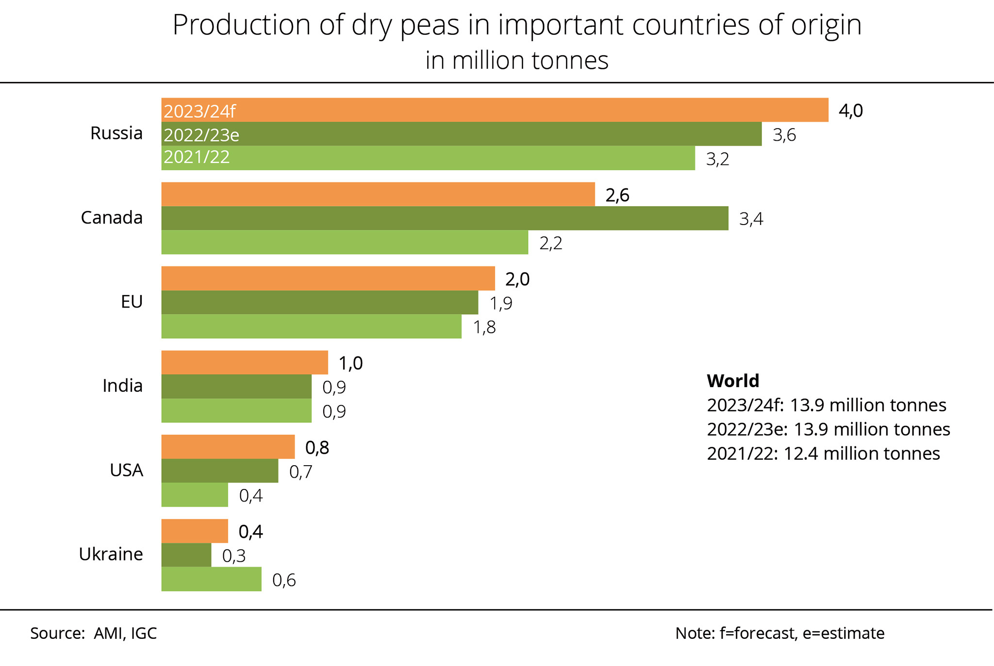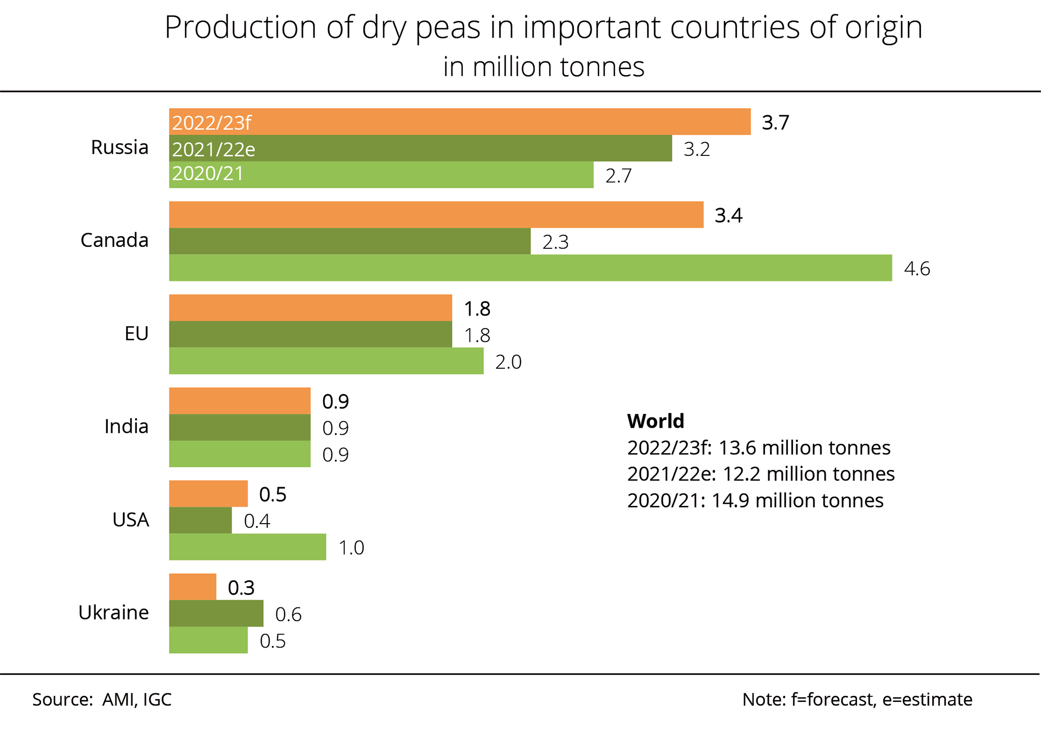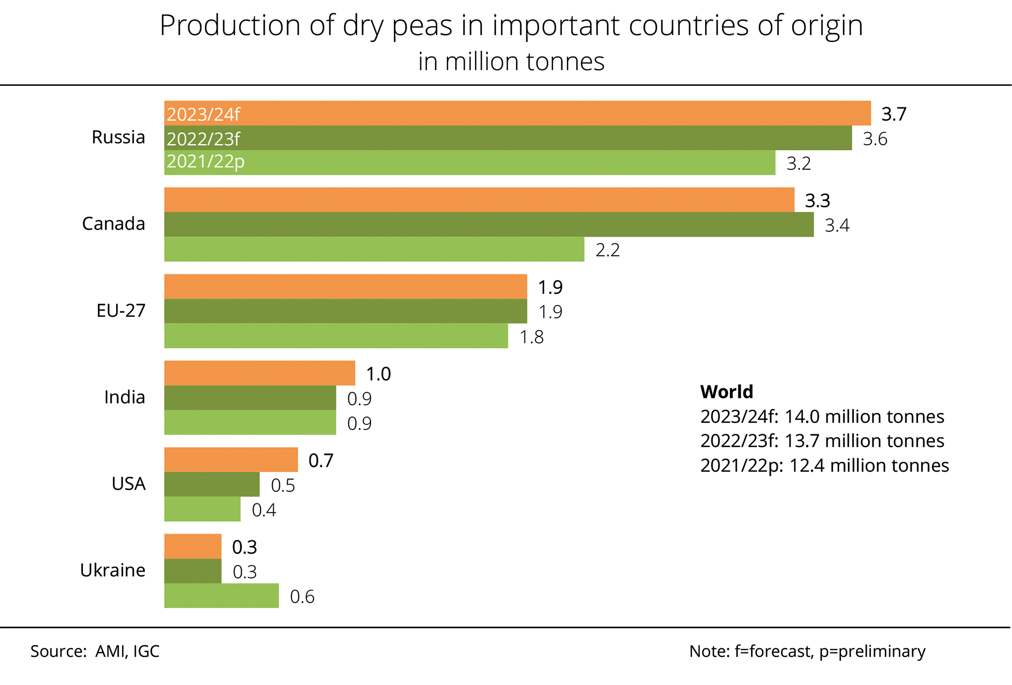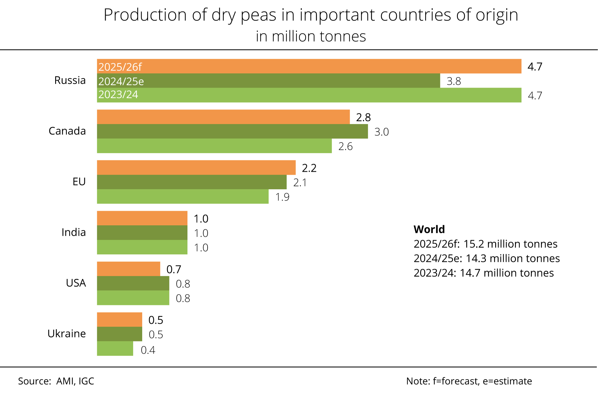 According to estimates by the International Grains Council (IGC), dry pea production in Russia, the world's largest producer of this crop, jumped almost 40 per cent to a record 5.3 million tonnes in 2025, despite a reduction in area planted. According to investigations conducted by Agrarmarkt Informations-Gesellschaft mbH, the increase is mainly due to very high yields. The IGC projects Canada's marketable crop at 3.9 million tonnes, which is up one third compared to 2024/25. The rise is due to an 8 per cent expansion in production area, especially in the province of Alberta. In addition, favourable weather conditions in Saskatchewan and Alberta helped boost yields.