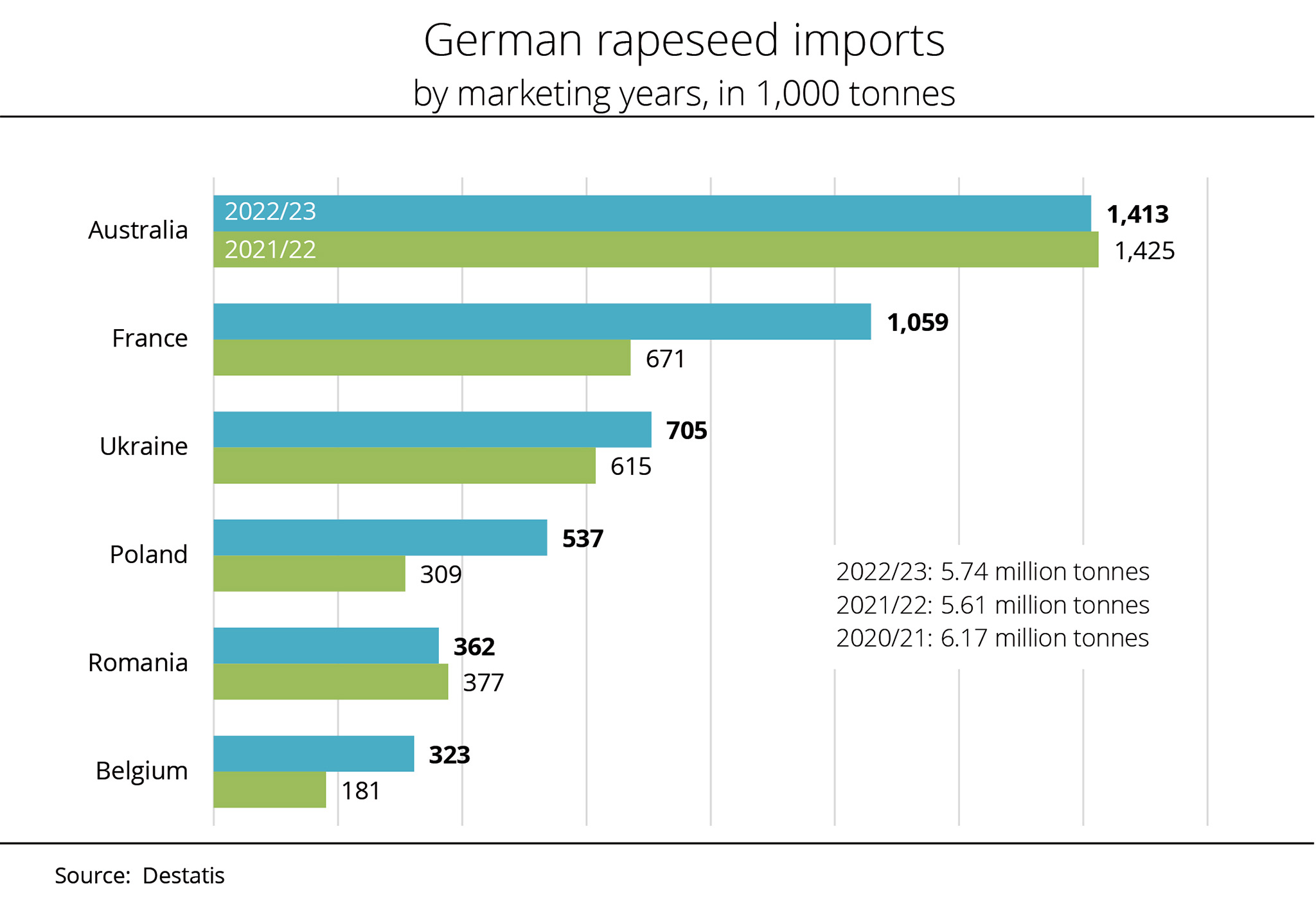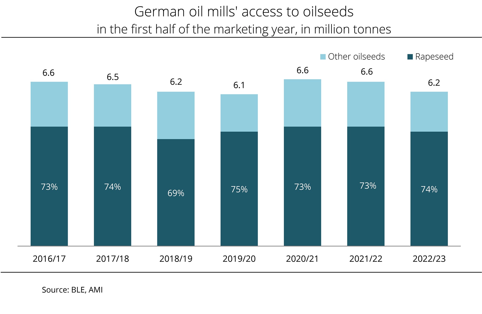 The EU-27 imported just less than 1.7 million tonnes of rapeseed in the first 14 weeks of the 2022/23 season. This translates to a full 40 per cent rise over past marketing year. Compared to the 2020/21 season, the volume is slightly smaller by around 1.5 per cent. Naturally, the main reason for the fluctuations in import volumes is availability in the world market, along with European rapeseed supply. According to investigations conducted by Agrarmarkt Informations-Gesellschaft (mbH), the European rapeseed crop will presumably amount to 18.8 million tonnes in the current marketing year. This is up just less than 11 per cent year-on-year. However, total demand from oil mills in the EU amounts to around 23.3 million tonnes. For this reason, the EU Commission estimates the need for imports from third countries at 4.5 million tonnes, which would be 1.1 million tonnes fewer than 2021/22.