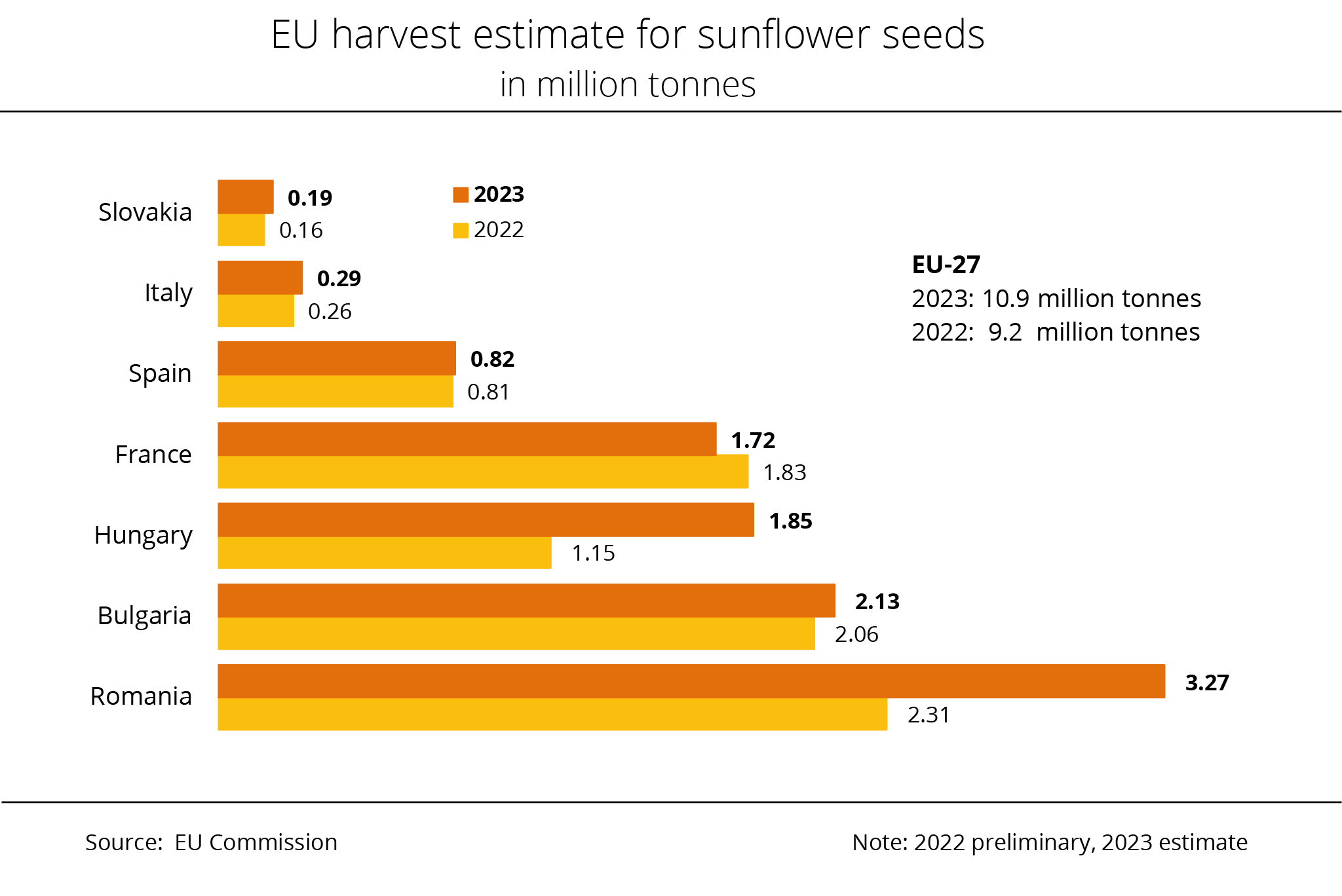 According to the EU Commission's latest forecast, the EU-27 is expecting a sunflower seed harvest of 9.6 million tonnes in 2026. This would be up approximately 1.2 million tonnes year-on-year and represent the largest harvest in three years. The expectation is mainly based on an approximately 5 per cent expansion in EU sunflower area. In particular, in Romania, France and Bulgaria, sunflower seed output is expected to increase significantly.