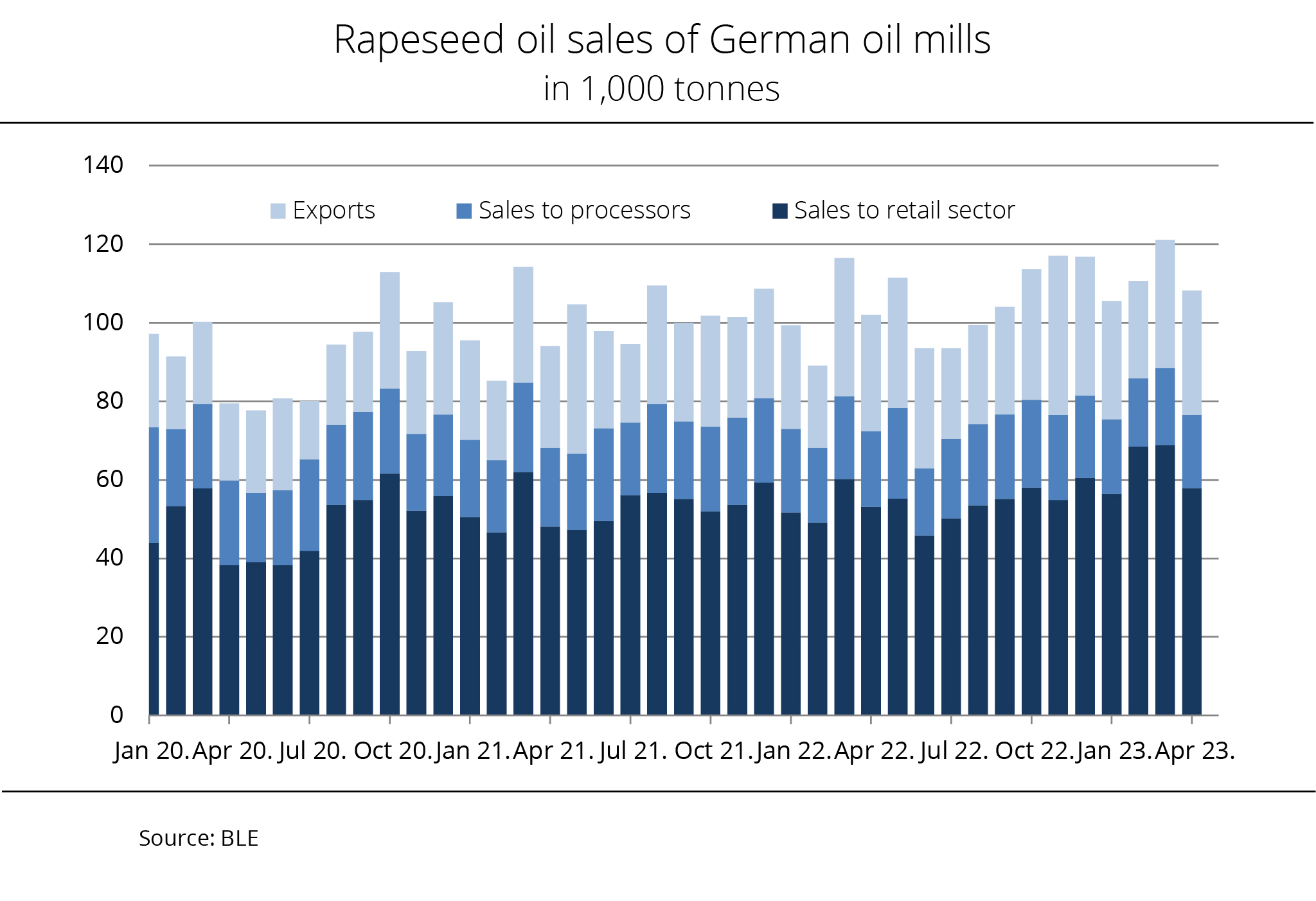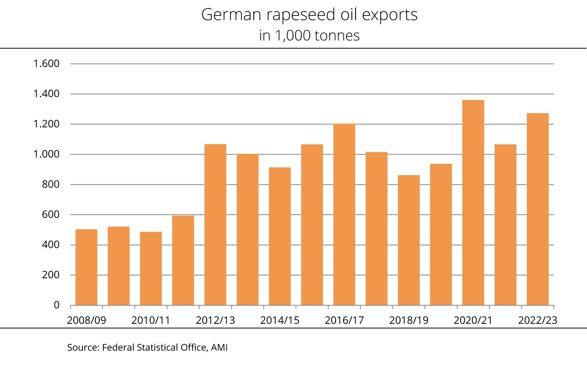 Production of sunflower oil will probably expand around 1 percent to 20.1 million tonnes in 2022/23, although global supply of sunflowerseed is clearly short of the previous year's figure despite an expansion the area planted. The Union zur Förderung von Oel- und Proteinpflanzen e. V. (UFOP) has pointed out that farmers in Germany also expanded their sunflower areas in 2022 because of persistently high prices for sunflower oil. Although not all yield expectations were fulfilled due to the extreme heat, the German sunflower hectarage for the 2023 harvest is expected to remain stable.