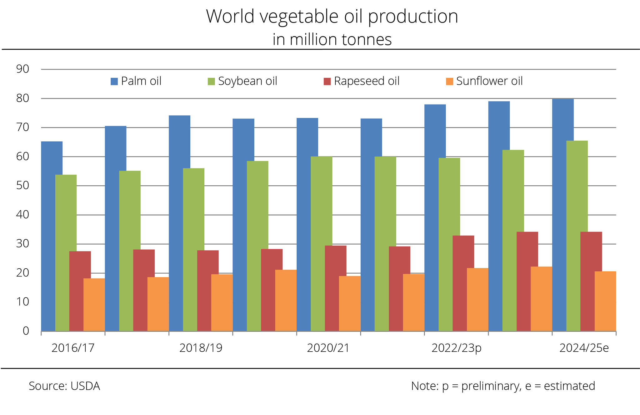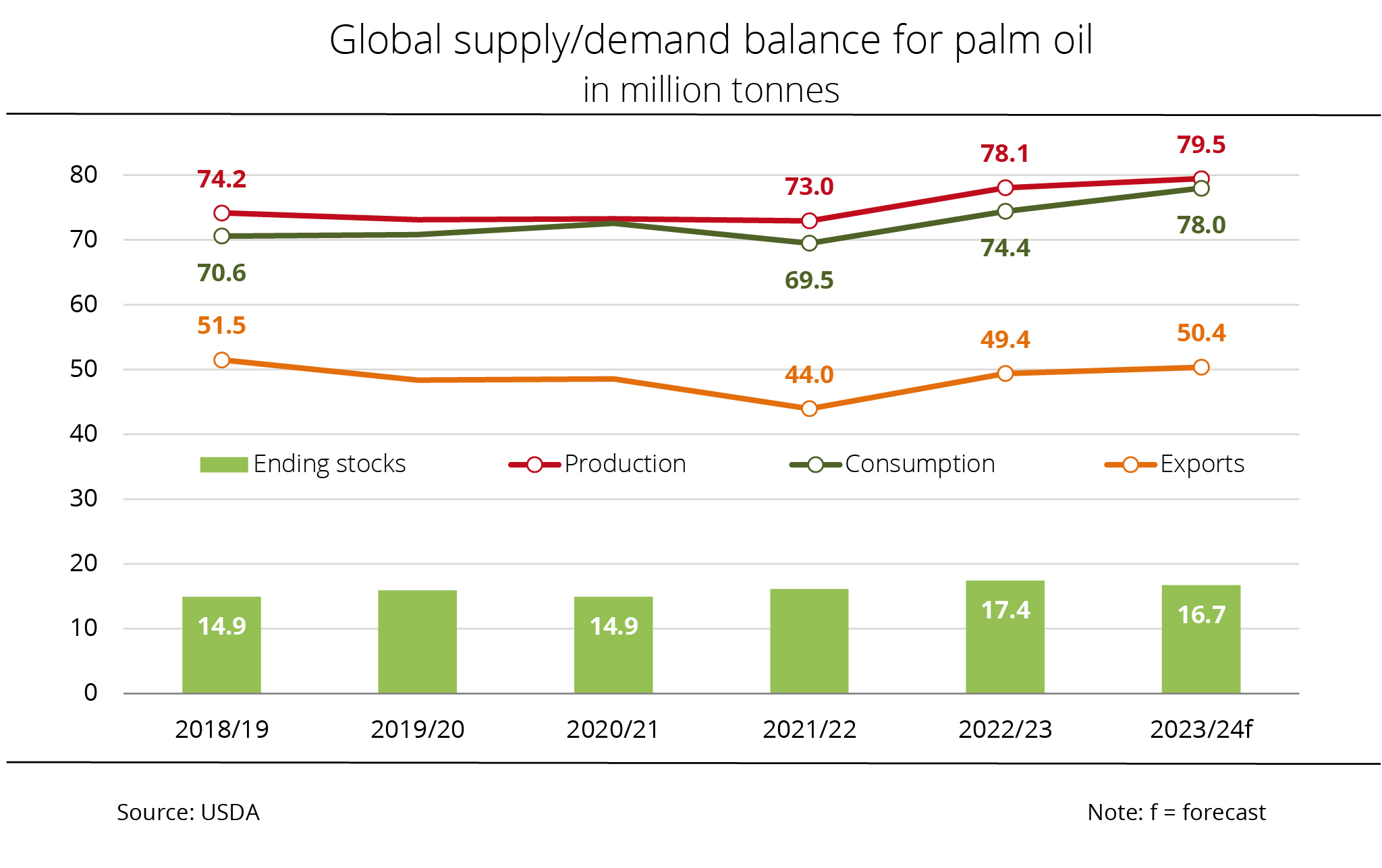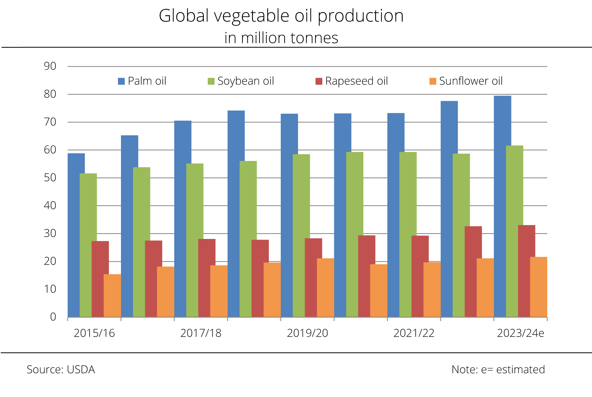 The primary reason for this forecast is anticipated production increases in Malaysia and Indonesia. Although Malaysian production is seasonally strongly curbed, the USDA currently projects output at 20.2 million tonnes, which would be up 820,000 tonnes year on year. Indonesia is expected to increase its production by 1.2 million tonnes to 46.7 million tonnes compared to the previous year.