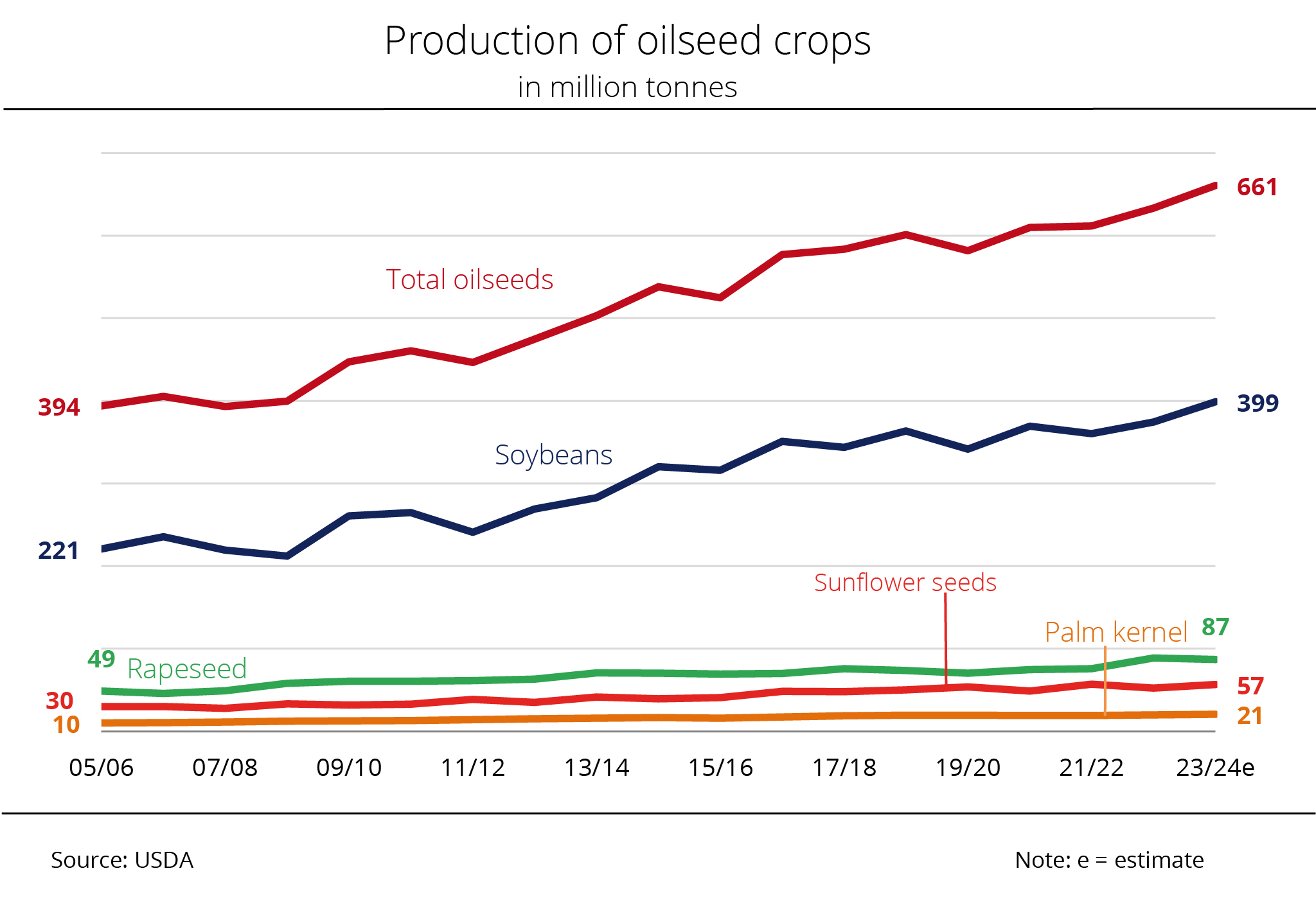 According to the latest outlook published by the US Department of Agriculture (USDA), 2022/23 global production of vegetable oils will amount to 219.8 million tonnes. This would be an 8.3 million tonne rise compared to 2021/22. In other words, production will presumably fully cover demand of 213.6 million tonnes also in the current crop year.