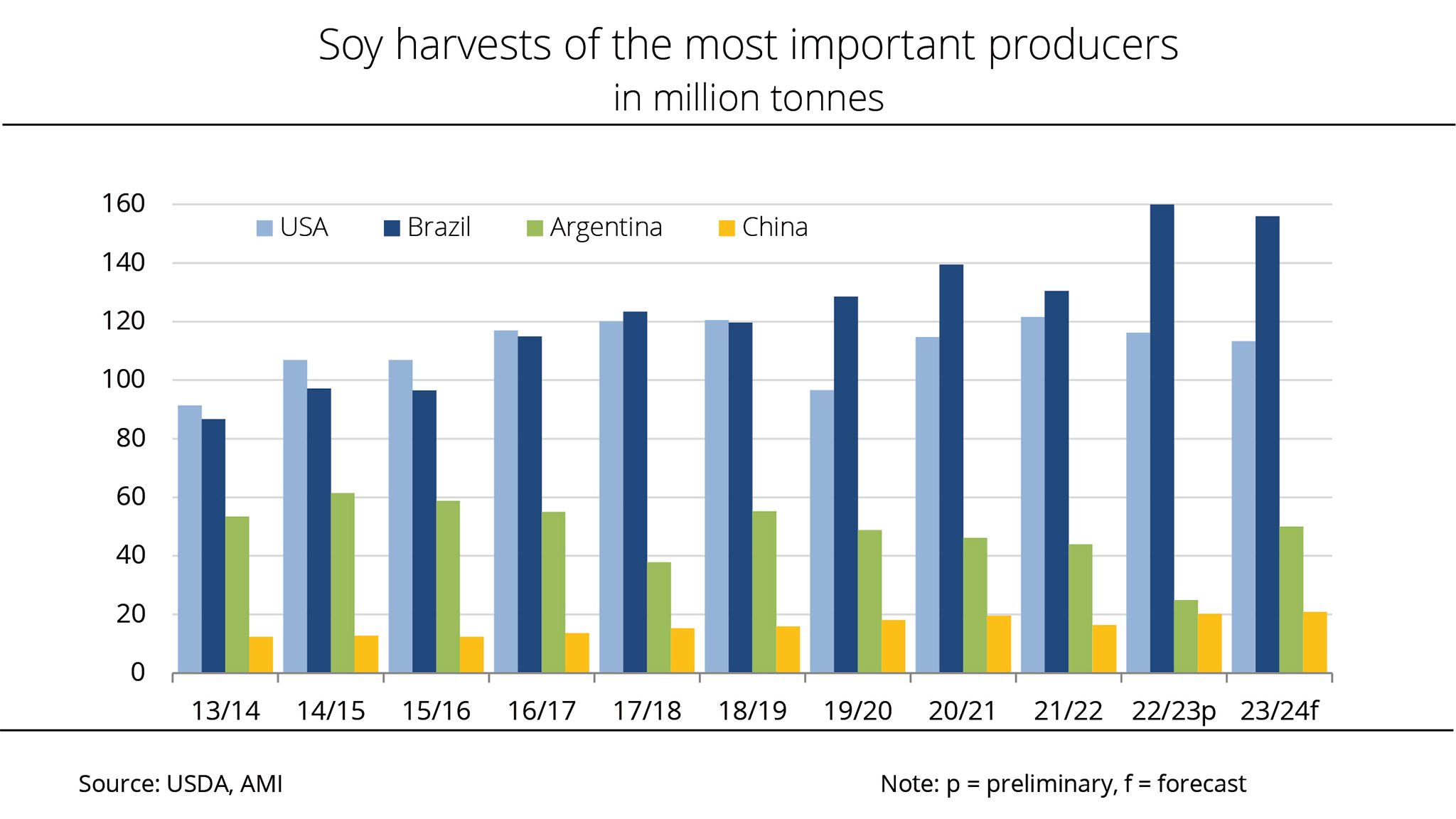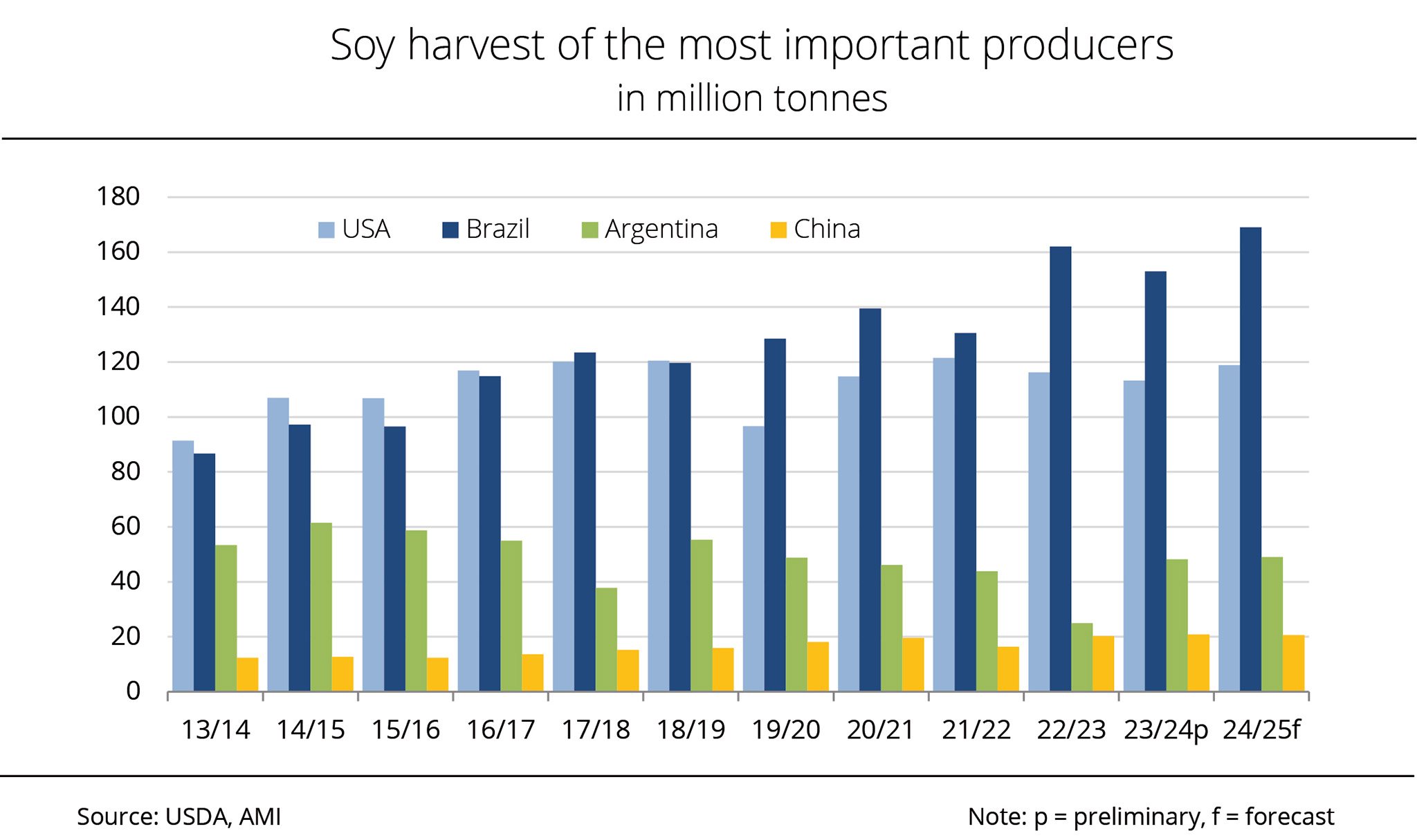 Argentina, which ranks third among the world's most important producers, is also projected to record a slightly smaller harvest than in the previous year. According to Agrarmarkt Informations-Gesellschaft (mbH), the country is expected to harvest 48.5 million tonnes, a decrease of around 2.6 million tonnes compared with the previous year. In contrast, the latest USDA estimates indicate that China's harvest will rise around 0.3 million tonnes from the previous year, reaching 20.9 million tonnes.