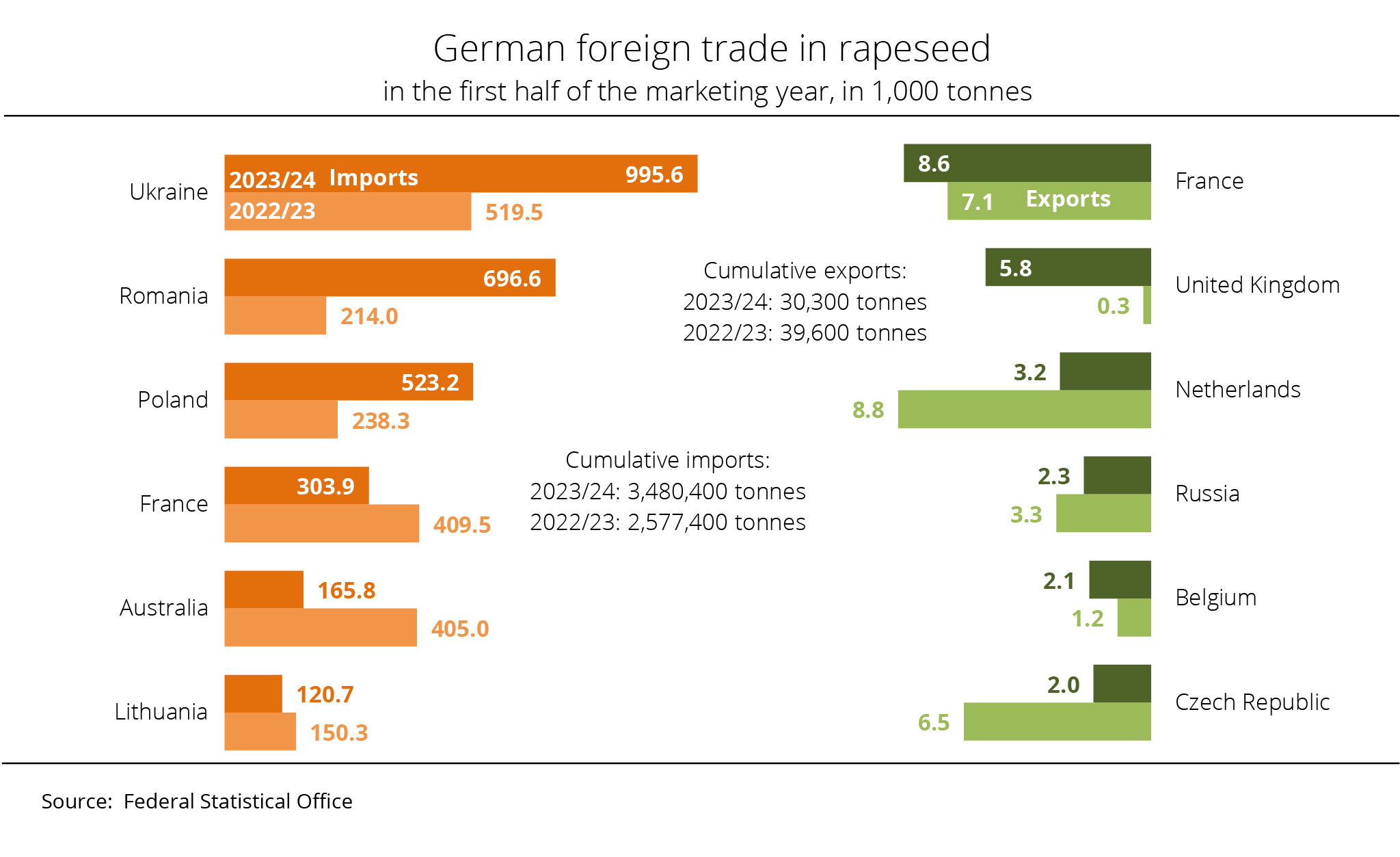 Germany is the largest net importer within the EU so that exports were relatively small despite the larger harvest. In the first six months of the current season, Germany exported only around 64,100 tonnes of rapeseed, which was up 87 per cent on the same period last year. Most German rapeseed exports go to other EU member states, with Poland (around 34,600 tonnes), the Netherlands (7,300 tonnes) and France (5,200 tonnes) as the primary destinations.