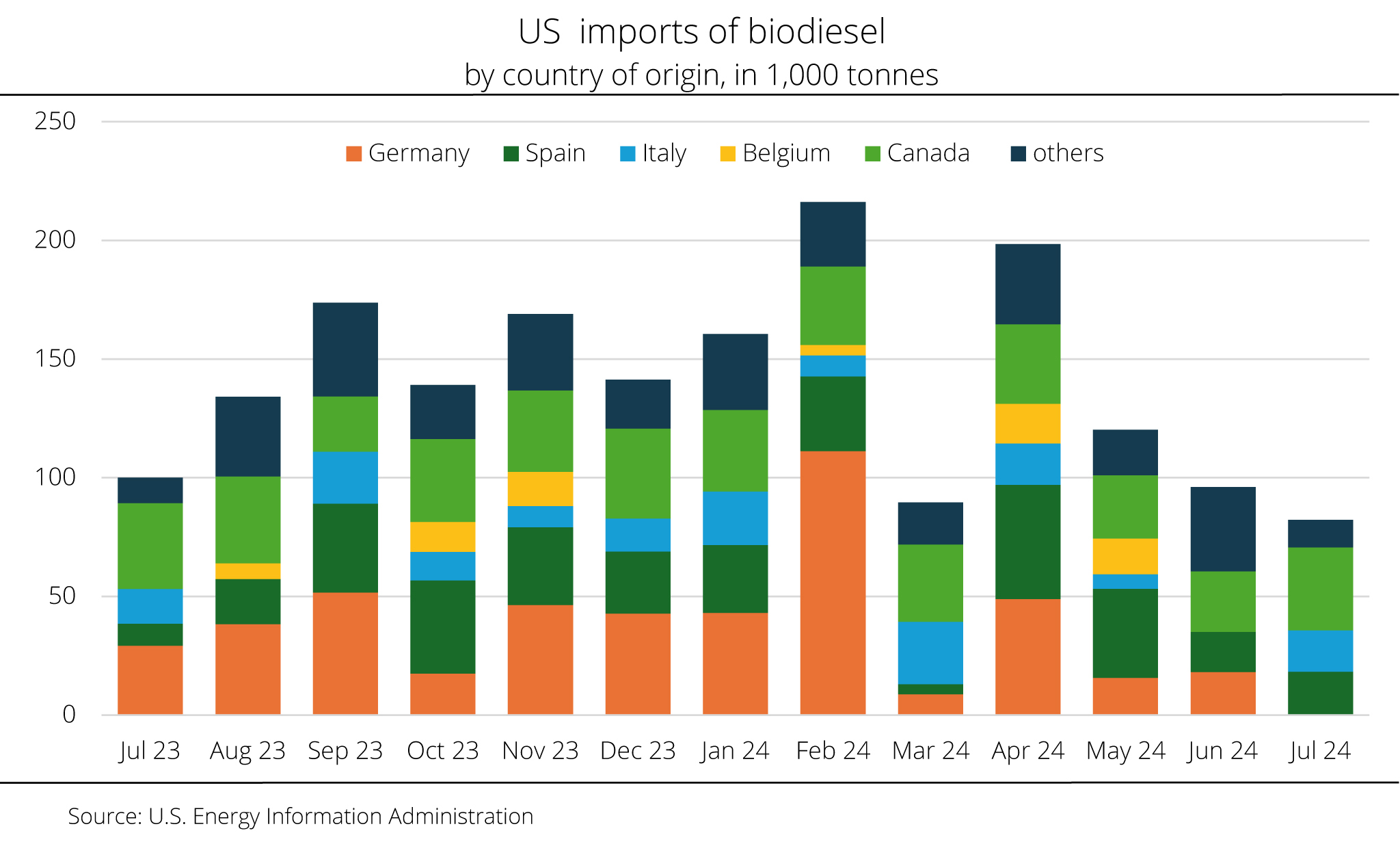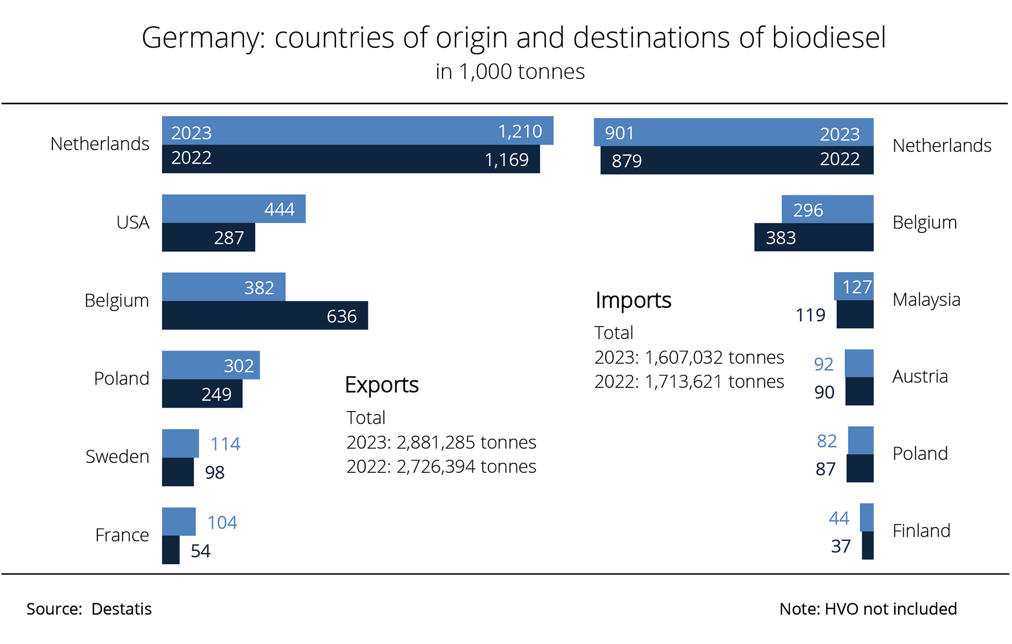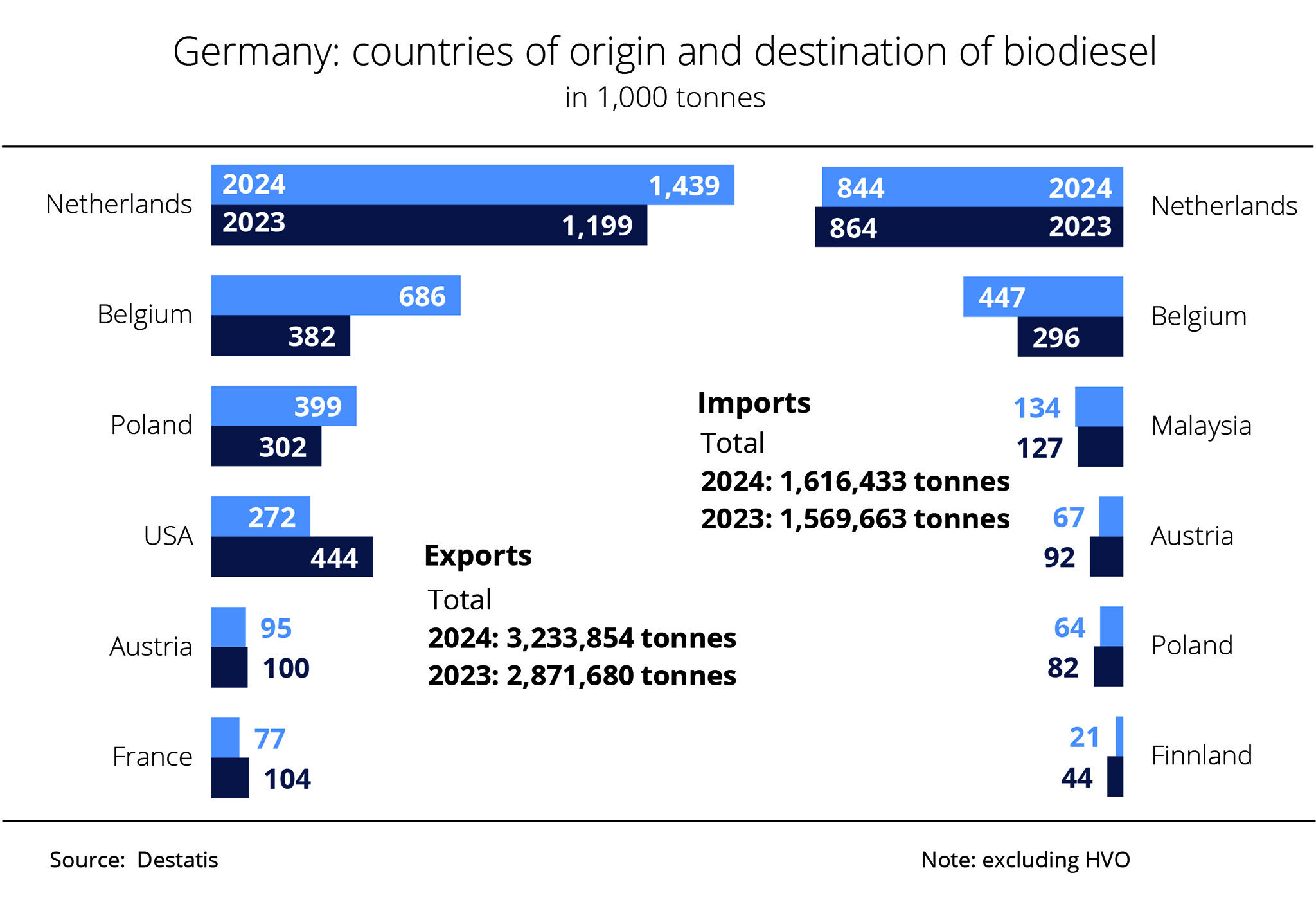 The Netherlands remained by far Germany's most important trading partner, with Rotterdam serving as the central hub in the international trade of biofuels. Delivery volumes remained largely unchanged at 1.4 million tonnes. The same applies to deliveries to Belgium. At 708,700 tonnes and with a 1 per cent year-on-year increase, Belgium ranks second among the most important markets for biodiesel from Germany. Austria received 121,700 tonnes of German biodiesel, representing an increase of roughly 29 per cent. In contrast, exports to Poland dropped 10 per cent to 356,700 tonnes. Exports to Switzerland, France, Latvia, Sweden and other EU countries also declined.