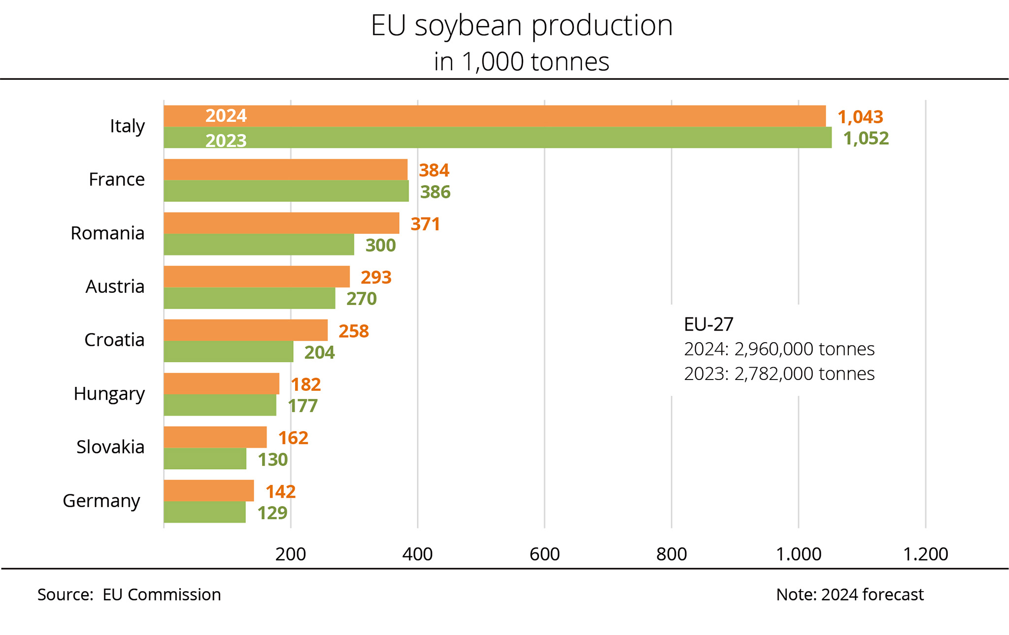 Feed peas are likely to record the sharpest decrease, with production expected to fall 6 per cent compared to the previous year, reaching 2.3 million tonnes. The broad bean harvest is expected to decrease around 3 per cent to 1.4 million tonnes. Soybean remains the most important legume in the EU, accounting for 40 per cent of the total legume crop. The harvest is projected at 2.8 million tonnes, representing a 2 per cent rise on the previous year due to an expansion in soybean area. Production of sweet lupins is expected to reach 486,000 tonnes, exceeding last year’s 417,000 tonnes and setting a new record.