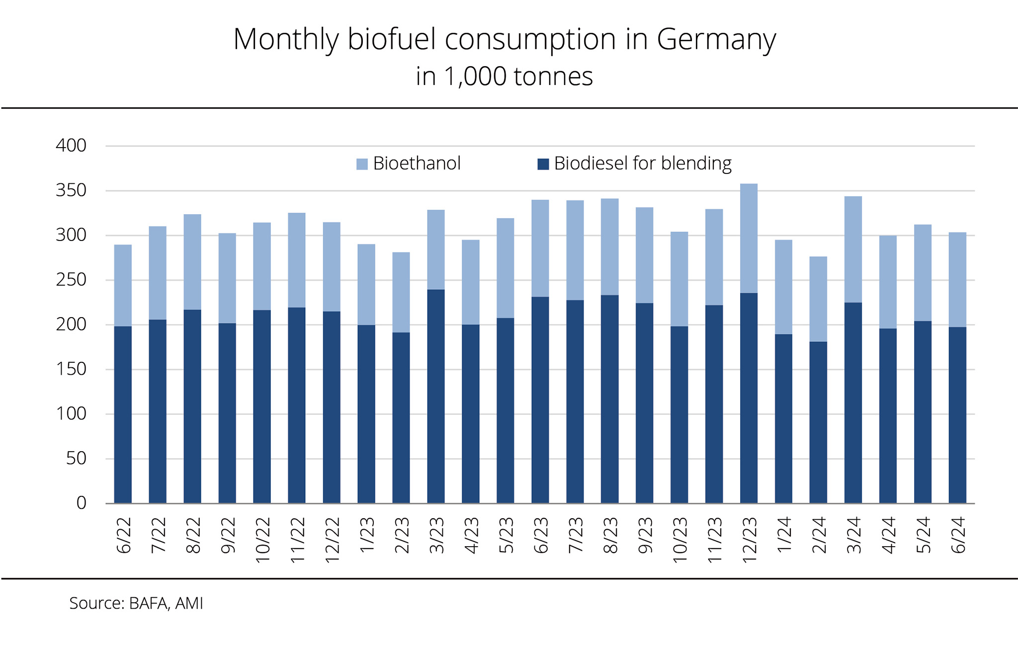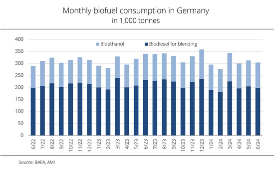 In June 2022, consumption of biodiesel declined 5 per cent on the previous month to 195,000 tonnes. This translates to a sharp decline of 8.7 per cent in the year-on-year comparison. The consumption of diesel reached 2.7 million tonnes in June 2022. This was up 14 per cent on the previous month, but nevertheless fell 6 per cent short of the previous year's volume. As a result, the incorporation rate dipped significantly to 6.7 per cent, a level below the half-year average and clearly below the rate of 8 per cent recorded in June 2021. The use of bioethanol continued to decline in June 2022. At 90,910 tonnes, consumption was down 3.4 per cent on the previous month. The use of bioethanol in blends decreased 5.6 per cent, but remained 2.8 per cent above the level seen in June 2021. On the other hand, the use in ETBE rose 18.3 per cent on the previous month. Nevertheless, it fell 31 per cent short of the previous year's volume.