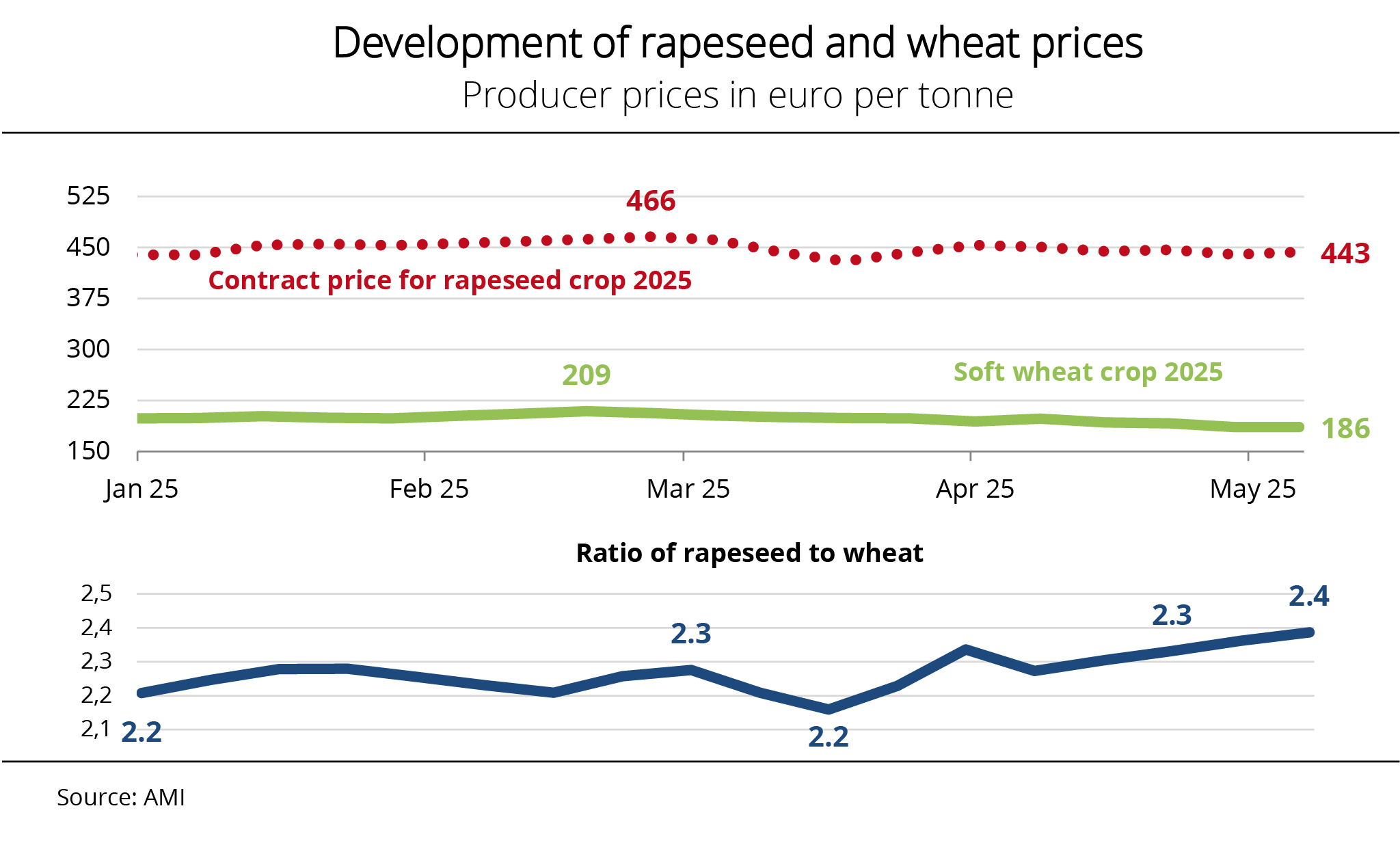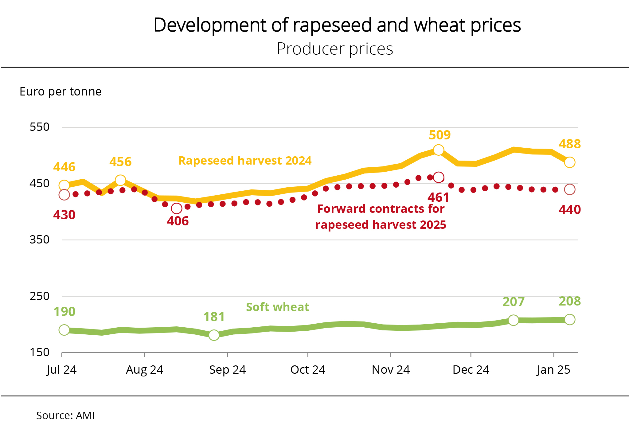 Due to increasing supply from the running harvest, spot prices came under growing seasonal pressure. In some regions, yields for wheat and rapeseed were surprisingly good, steadying the downward slide of producer prices. At the same time, low water surcharges and rail transport made delivery to the oil mills more expensive.