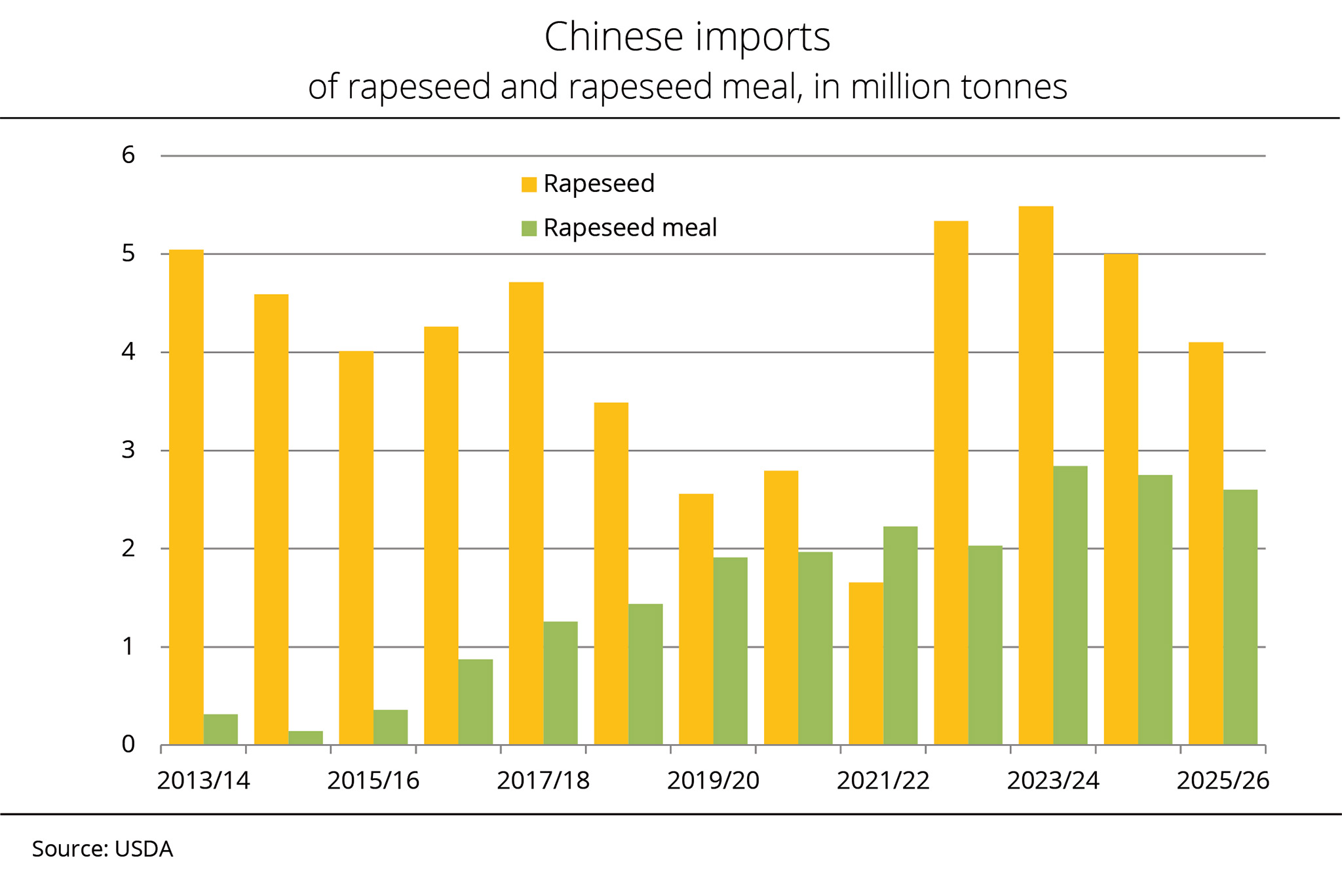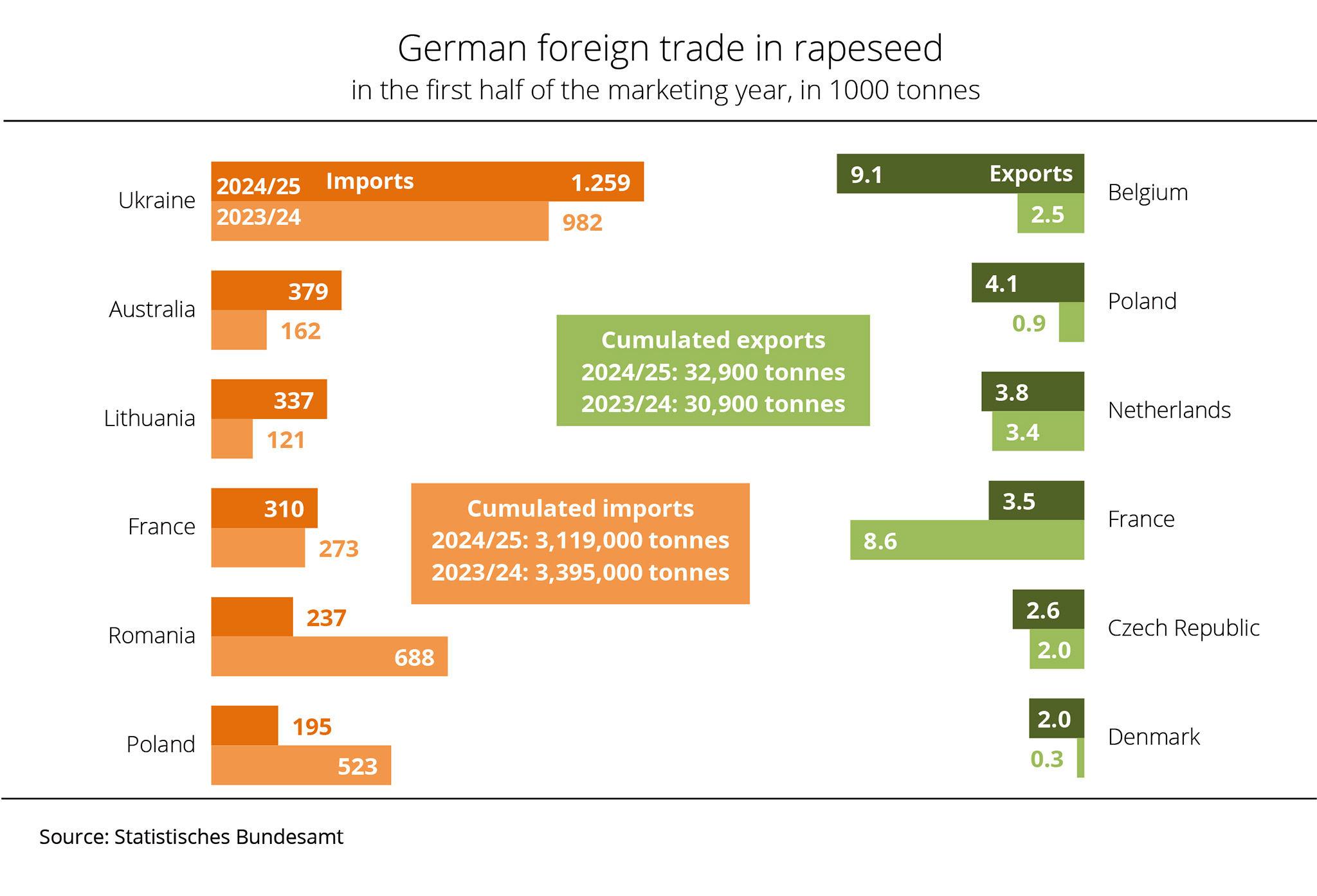 German farmers harvested more rapeseed in 2025 than in 2024. Despite the larger domestic supply, rapeseed imports remained plentiful in the first half of the 2025/26 season. Exports also exceeded the previous year's volume.