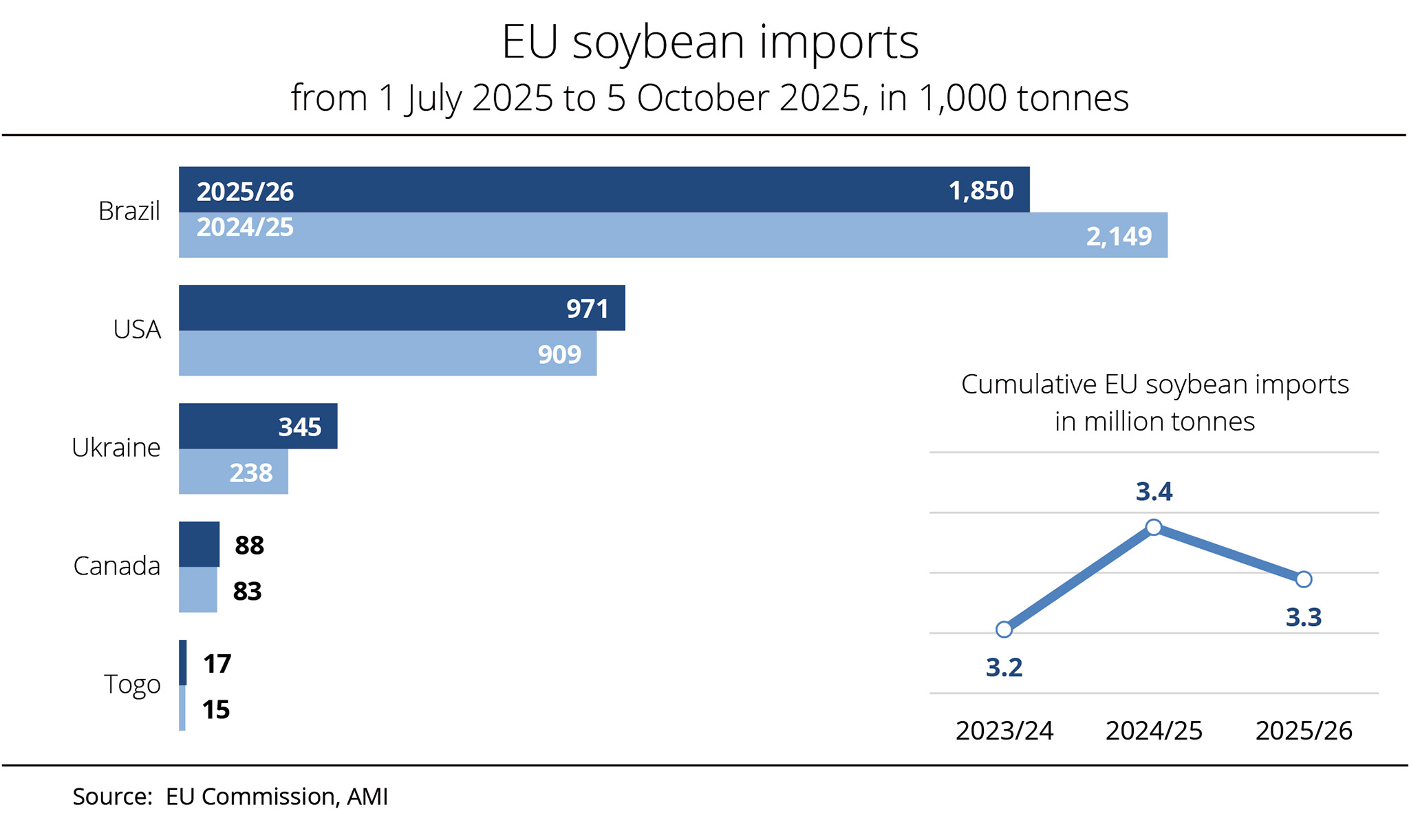 According to data from the European Commission, the European Union purchased just over 8.7 million tonnes of soybeans between 1 July 2025 and 15 March 2026, representing a drop of around 1.1 million tonnes compared to the same period in the 2024/25 season. The US and Brazil remain the most important supplier countries, although neither matched the previous year’s volumes. At 4.1 million tonnes, the EU received a significantly lower volume of soybeans from the US in the first eight and a half months of the current season compared to the year-earlier period (5.2 million tonnes). Consequently, the US share of total imports fell to approximately 47 per cent. Soybean shipments from Brazil, the second-largest supplier to the European market, dropped 2 per cent to approximately 2.7 million tonnes, accounting for just over 32 per cent of total imports.