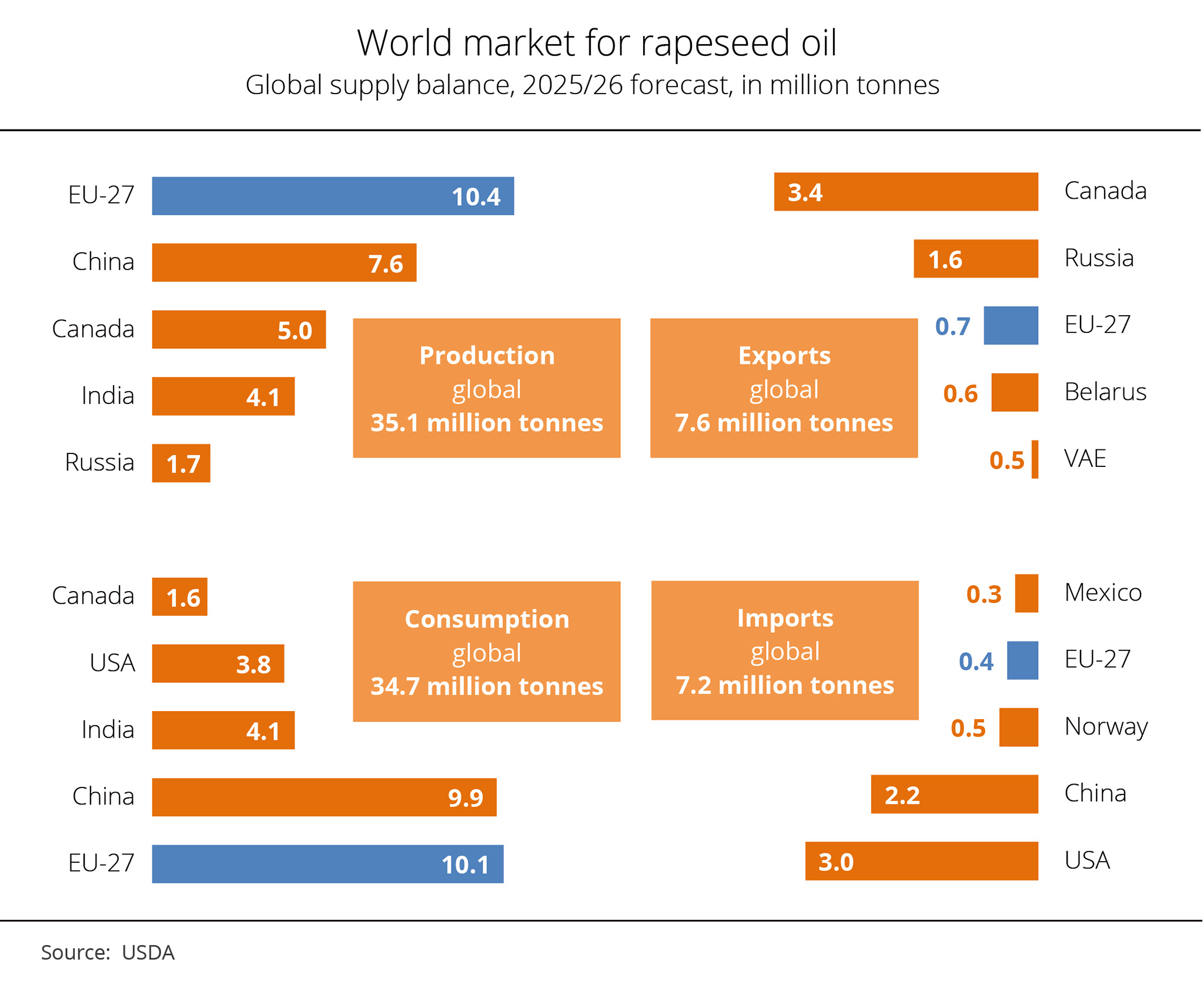 In its recently published initial outlook, the USDA Foreign Agricultural Service (FAS), based in Vienna, estimated the EU rapeseed area for the 2026 harvest at an anticipated 6.3 million hectares. This represents an expansion of approximately 2.7 per cent compared with the previous year. Alongside attractive contract prices at the time of sowing, another factor driving this development is the agronomic significance of rapeseed as a leaf crop that is essential in cereal-dominated crop rotations and that promotes biodiversity. In some regions in Germany, flowering rapeseed fields are currently a typical sight in the countryside, reflecting the importance of this crop in a particularly striking way. These yellow areas are not only a defining feature of the landscape but also reflect a versatile form of land use that combines food production, energy generation and agriculture. Based on expected average yields, the FAS projects the 2026 EU harvest at 20.4 million tonnes, slightly below the previous year's figure of 20.5 million tonnes.