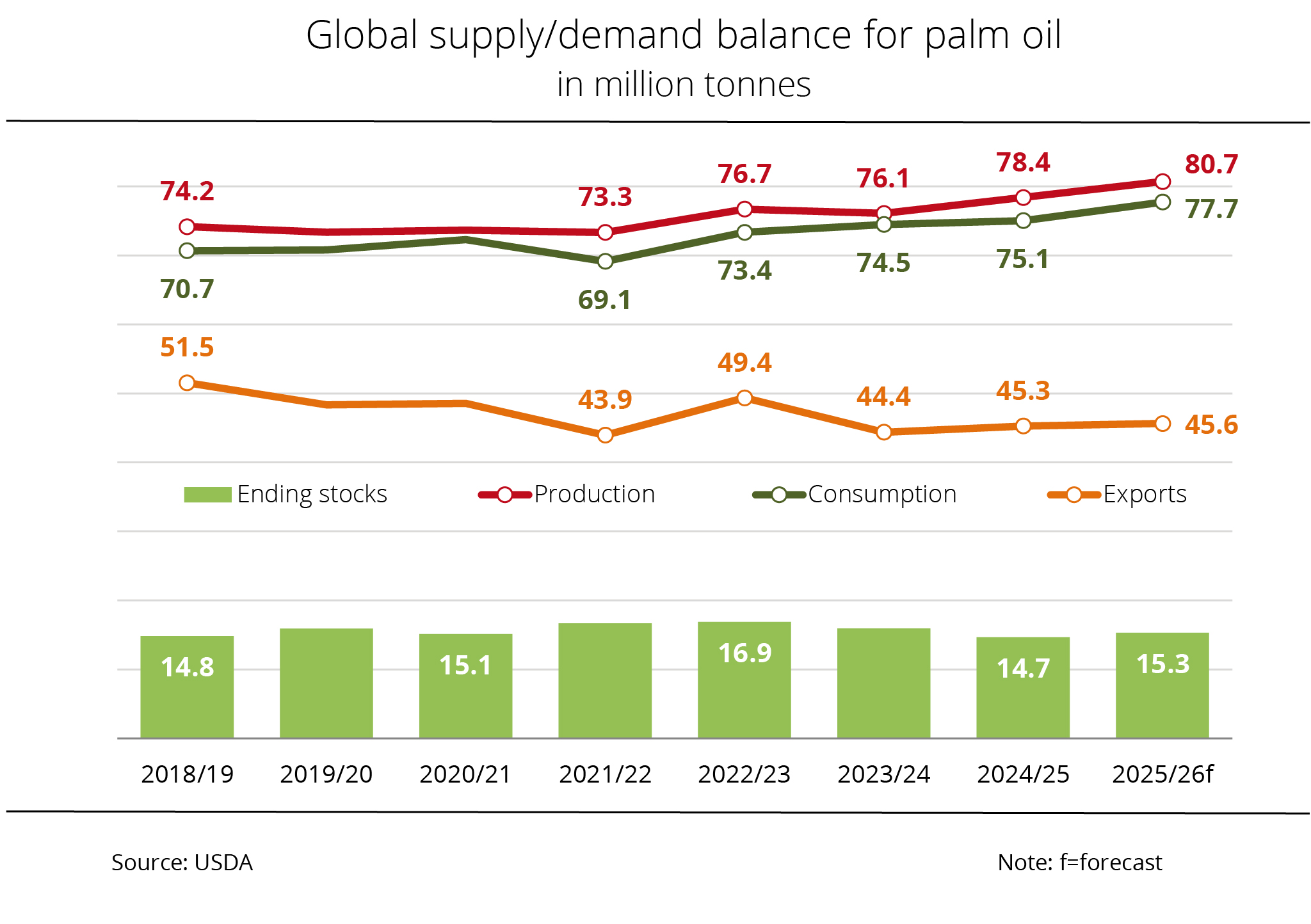 According to recent information from the US Department of Agriculture (USDA), global palm oil production in 2025/26 is set to rise to a record high of 80.7 million tonnes, exceeding the previous year's level by 3 per cent.