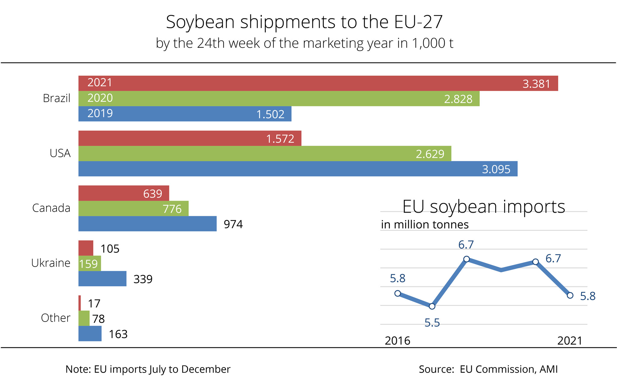 Brazil and the US remained the top soybean suppliers to the EU, with volumes clearly shifting towards South America. Brazil delivered around 3.4 million tonnes in the period 1 July to 12 December 2021, one fifth more than over the same period a year earlier. In other words, 59 per cent of imports were sourced in Brazil. By contrast, the US supplied only just 1.6 million tonnes, which was an 840,000 tonne decline year over year. In other words, the US accounted for 27 per cent of EU-27 soybean imports. According to Agrarmarkt Informations-Gesellschaft (mbH) (AMI), one of the reasons for the sharp drop in US shipments is likely to be the damage Hurricane Ida caused to export terminals in the Gulf of Mexico, which severely hampered exports. Canada remained the third most important supplier, exporting 639,300 tonnes, followed by Ukraine with 104,911 tonnes. This translates to a share of 11 per cent and just less than 2 per cent, respectively. Uruguay ranked fifth with 16,530 tonnes.