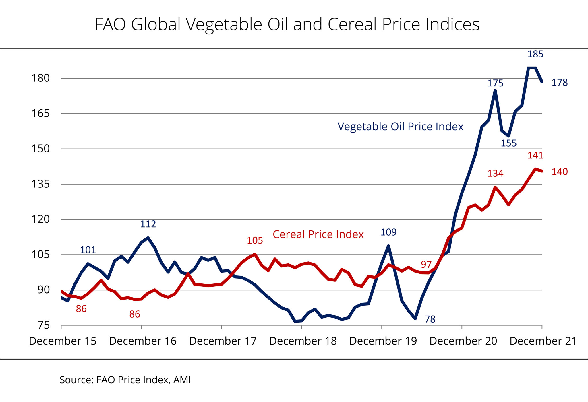 The FAO price indices of vegetable oil and cereals in November 2021 reached an all-time high at 185 and 141 points, respectively. In December, the indices declined slightly.