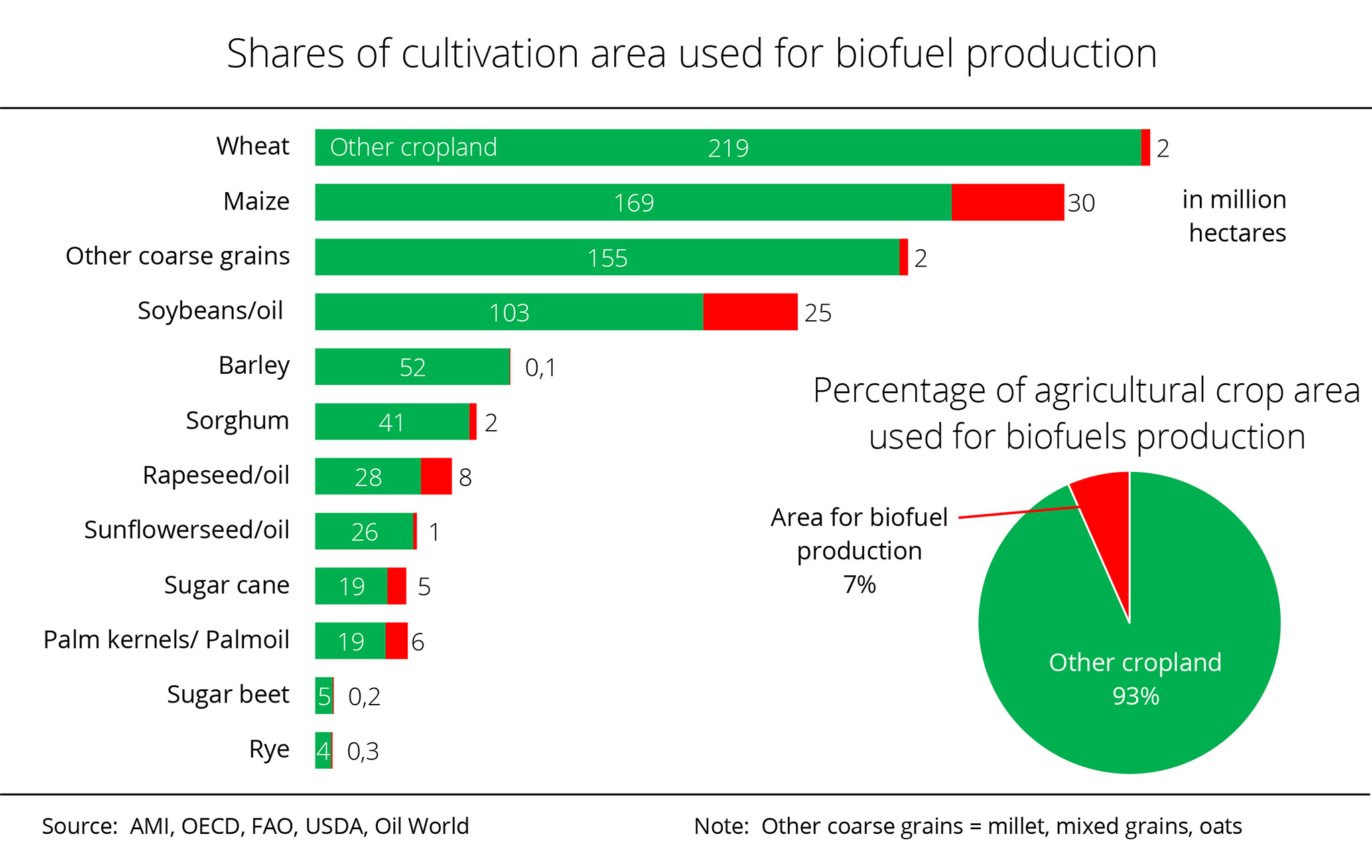In 2020, 1.4 milliards ha of crops such as grain, oilseeds, protein, sugar and fibre plants, fruits, vegetables, nuts and others were grown worldwide. Most of this produce is used as food. Only around 7 per cent go into biofuels production.