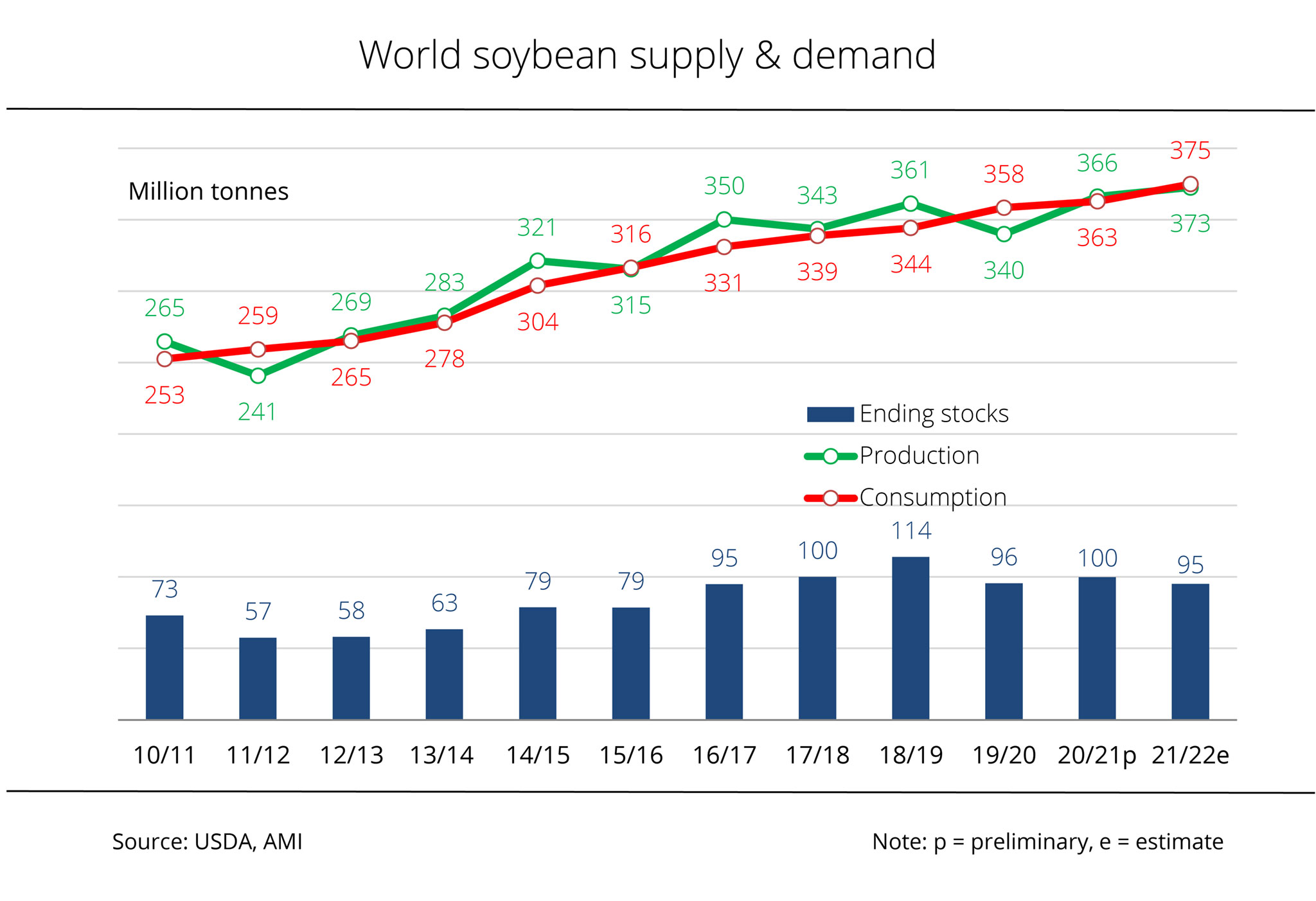 In its latest report, the USDA significantly lowered its forecast of global soybean supply and demand. The biggest adjustment was in global production, which was forecast down 9.22 million tonnes to 372.56 million tonnes. In other words, the running crop year will presumably still exceed the 2020/21 season by 1.7 per cent. The main reason for the reduction was anticipated harvest losses as a consequence of the continued dryness in South America. More specifically, production in Brazil, the world's biggest soybean producer, was lowered 5 million tonnes to 139 million tonnes. According to investigations conducted by Agrarmarkt Informations-Gesellschaft (mbH), the soybean harvest in Argentina is also likely to be smaller at 46.5 million tonnes (down 3 million tonnes). The same applies to Paraguay, where the harvest is expected at 8.5 million tonnes, around 1.5 million tonnes down from the December estimate.