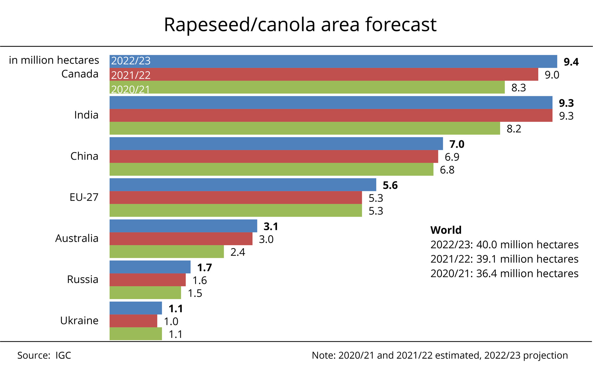 In view of the historically high price level and rising demand, the IGC expects the global rapeseed area to expand to a record of 40 million hectares for the 2022/23 marketing season. This would translate to a more than 2 per cent rise on the running crop year.