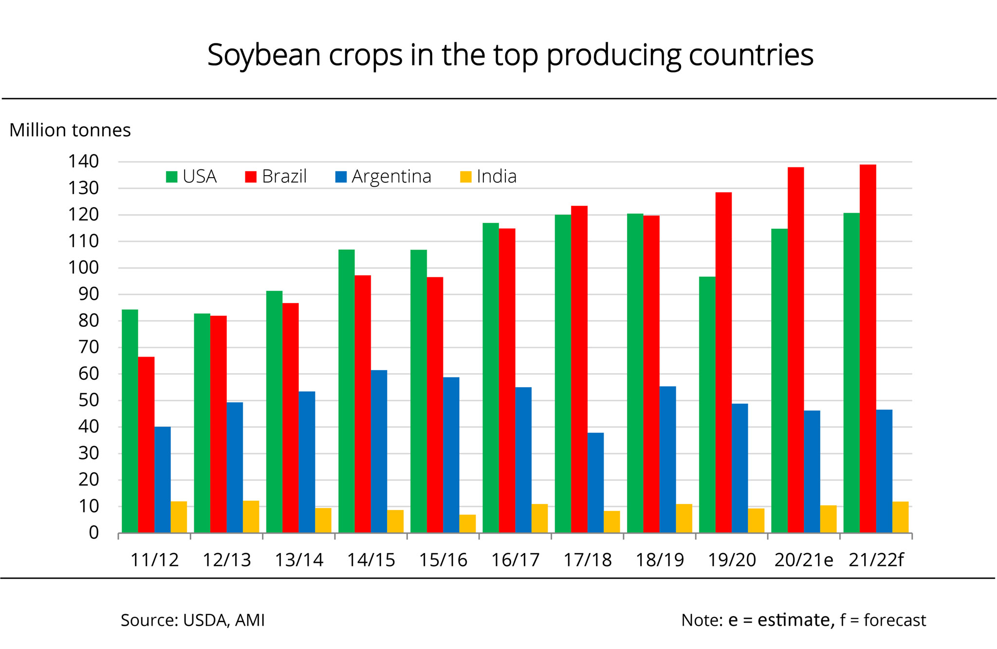 Brazil, the US and Argentina are the main soybean producing countries, collectively accounting for 80 per cent of global soybean output. India follows a long way behind with a share of 12 per cent. According to a USDA report, Brazil is projected to harvest a record soybean crop of 139 million tonnes in the current crop year, which would be up around 1 million tonnes from the previous year. Locally extreme growing conditions with dryness on the one hand and excessive rain on the other hand dampen prospects of a bumper crop which the USDA December outlook put at 144 million tonnes. Brazil is consolidating its number one position ahead of the US based on a 1.5 million hectare expansion in area planted. In the US, the soybean harvest was already complete at the end of the year 2021. The harvest amounted to around 120.7 million tonnes. This translates to a rise of around 6 million tonnes year-on-year.