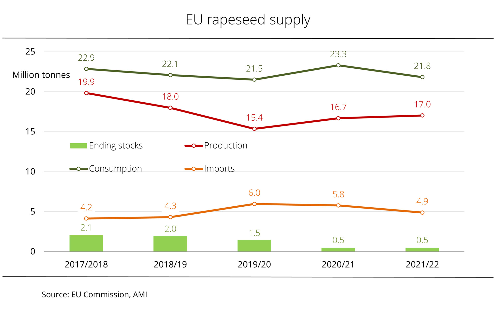 EU-27 rapeseed production in 2021/22 exceeded the previous year's output. Consumption is estimated lower, leading to reduced import demand.