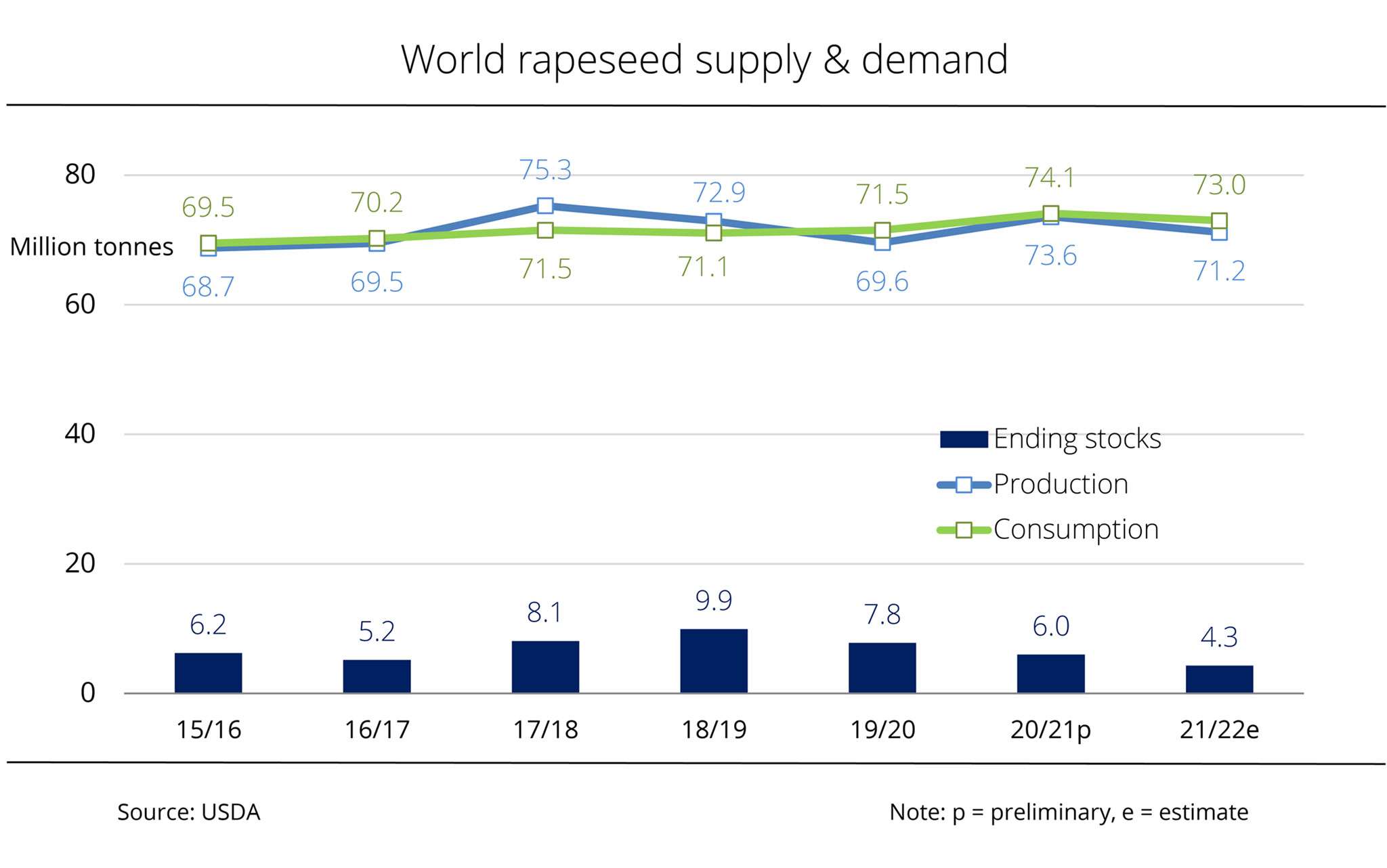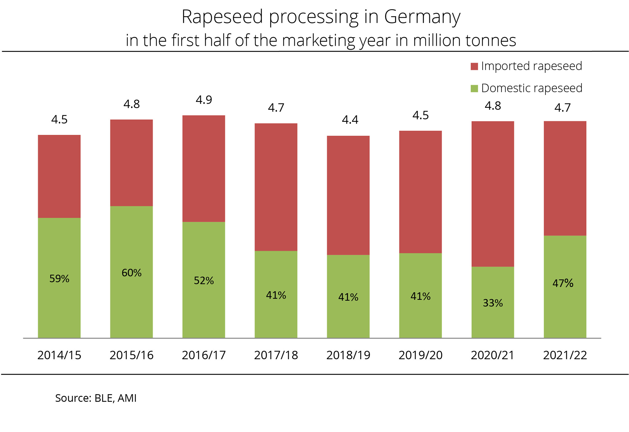 Although the EU rapeseed harvest was somewhat larger in 2021 than 2020, total supply in the EU-27 in the 2021/22 marketing year – estimated at 22.8 million tonnes – was around 1.2 tonnes smaller than that in the 2020/21 marketing year. The drop was due to lower beginning stocks. Demand from oil mills was initially covered by EU production. However, starting in the first half of the marketing year, the rapeseed volumes required to utilise the mills to their full capacity increasingly had to be imported from Australia, Ukraine and Canada.