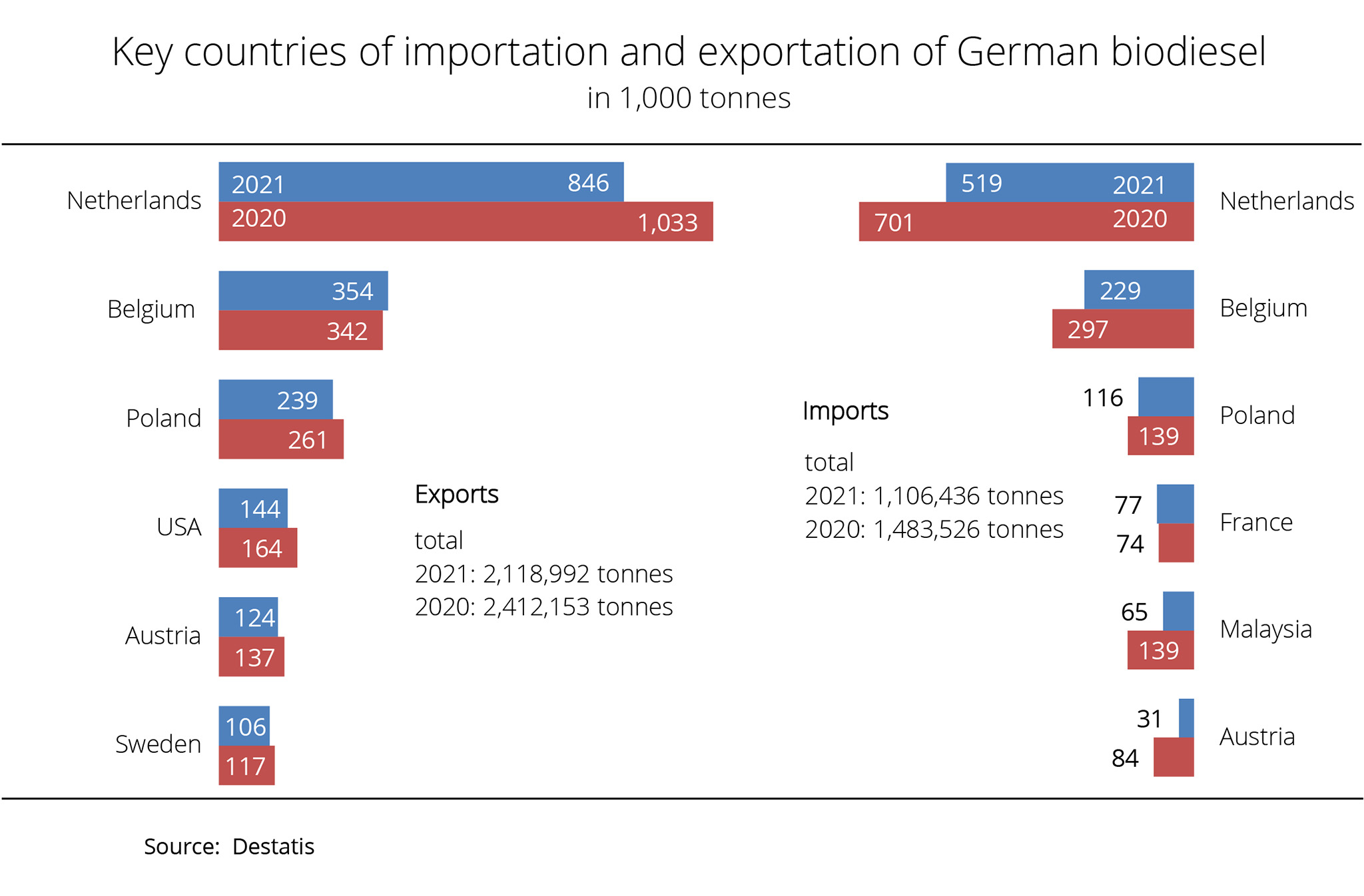 At the same time, Germany delivered around 846,000 tonnes to the Netherlands in 2021, which was 18 per cent less year-on-year. Exports to Poland, the US, Austria and Sweden also decreased. Only Belgium – with 354,000 tonnes the number two of the top five recipient countries – imported 3 per cent more biodiesel from Germany than the previous year.