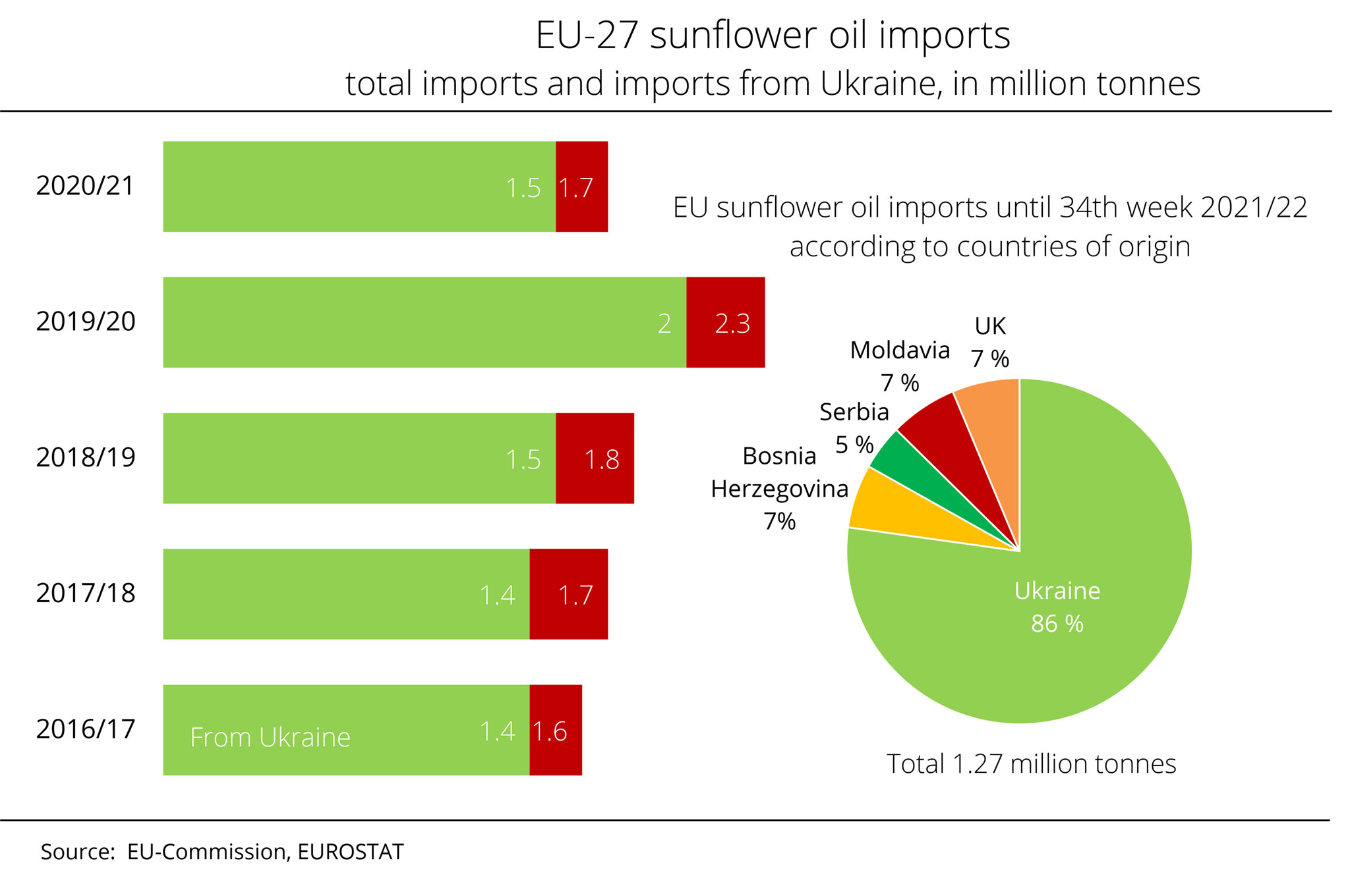 The by far largest supplier of sunflower oil to the EU-27 is Ukraine. Bombed and blockaded ports, an export freeze and failure to make sowings for this year's harvest are likely to cut supply in the current crop year noticeably.