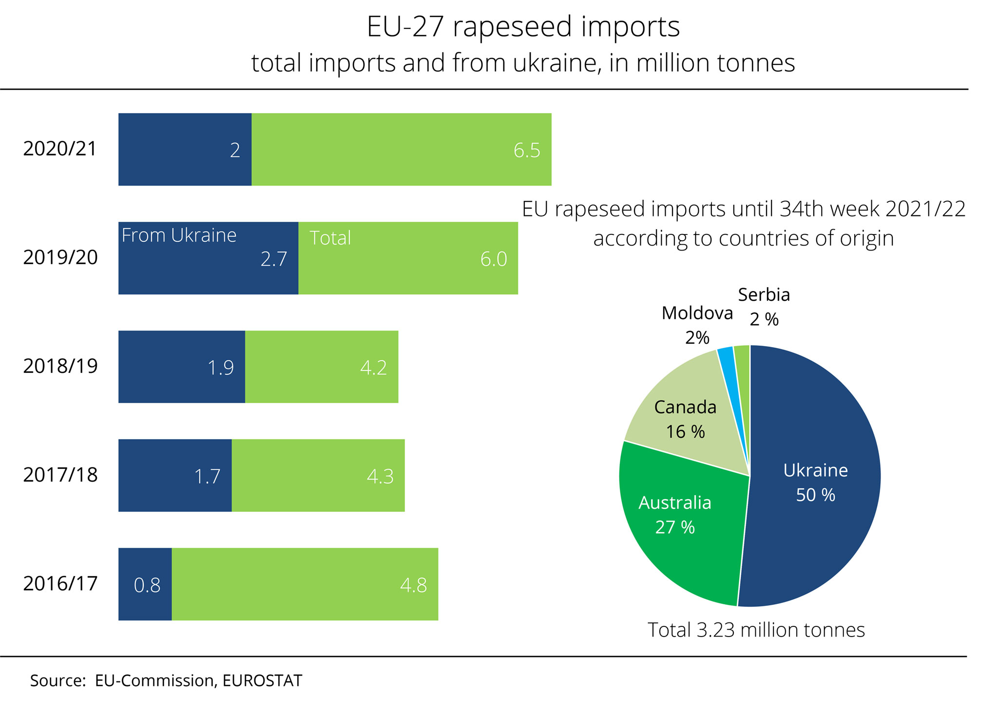The war in Ukraine is having an increasing impact on world trade, as Ukraine is one of the largest suppliers of rapeseed, along with Canada and Australia. The war will significantly affect global rapeseed supply, which is characterised by tight availability even now. Rapeseed imports to the European Union in the 2019/20 season totalled 6 million tonnes. Of this quantity, 45 per cent (around 2.7 million tonnes) came from Ukraine. According to information published by Eurostat, in the past crop year the share of imports fell to 31 per cent (2 million tonnes). This was virtually at the same level as imports from Canada, which accounted for around 32 per cent of European imports.