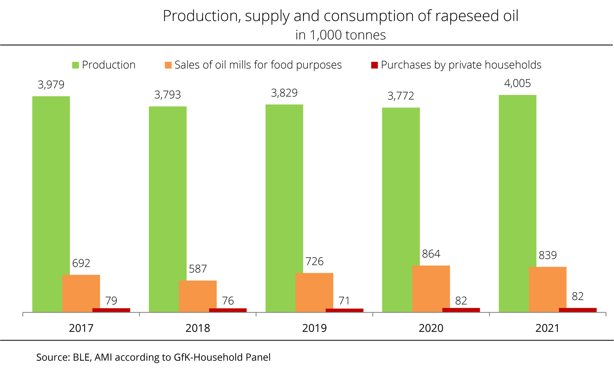 According to the German Federal Office for Agriculture and Food (BLE), German oil mills produced just over 4.7 million tonnes of vegetable oil in 2021, including just over 4 million tonnes of rapeseed oil. This was around 234,000 tonnes more than the previous year. About 839,000 tonnes of the rapeseed oil produced went into the production of food (edible oil, mayonnaise etc.). Rapeseed oil was also used to produce animal feedstuff, as well as in the oleochemical industry and energy sector.