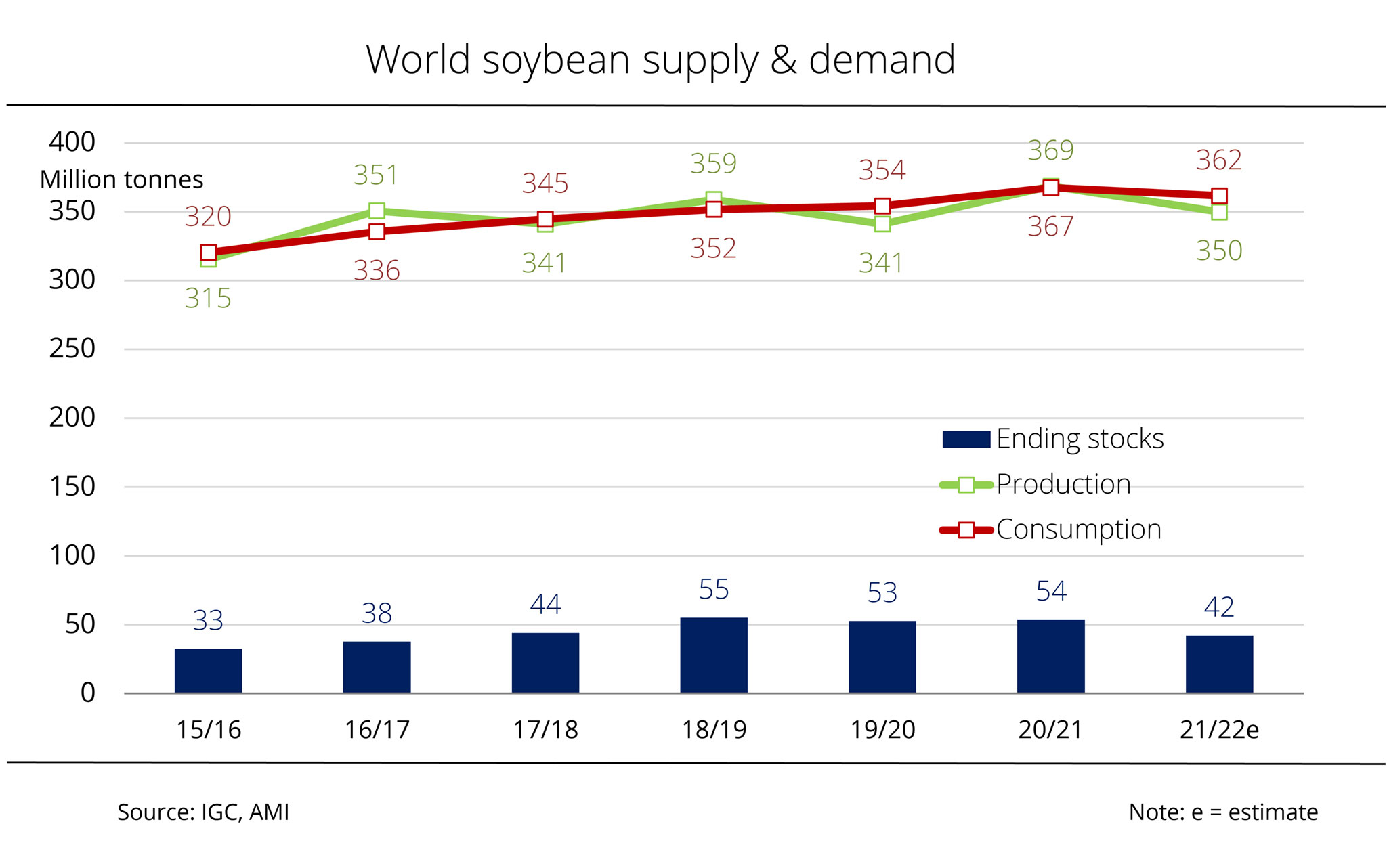 The International Grains Council (IGC) lowered its estimate of global soybean production in the current crop year significantly in its latest monthly report. Production is expected at 350 million tonnes, which is down just over 3 million tonnes from the previous month's estimate and just less than 19 million tonnes from the previous year's volume. The main reason for the cut was lower harvest outlooks for Argentina and Brazil. which will considerably reduce the availability. Continued hot and dry growing conditions led the IGC to make this adjustment, although harvests in the northern hemisphere were abundant, with the US recording a record crop.