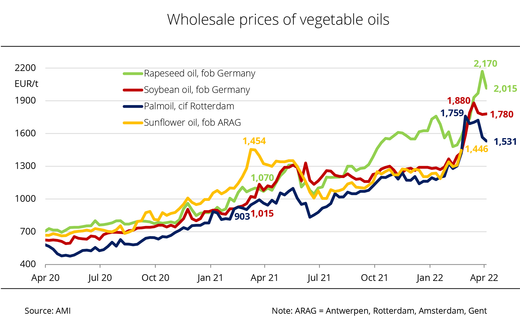 Prices in the rapeseed oil market also escalated nearly unabated in March. Tight supply of feedstock, historic record levels in the futures markets and spiking demand caused asking prices to explode. This was also reflected in premiums of up to EUR 288 per tonne for rapeseed oil raffinate. More specifically, prices of EUR 2,170 per tonne fob German mill were reported for prompt batches at the end of March. This was more than twice the amount asked the same time a year earlier. Given the high volatility of the markets, the value could not be maintained at that level.