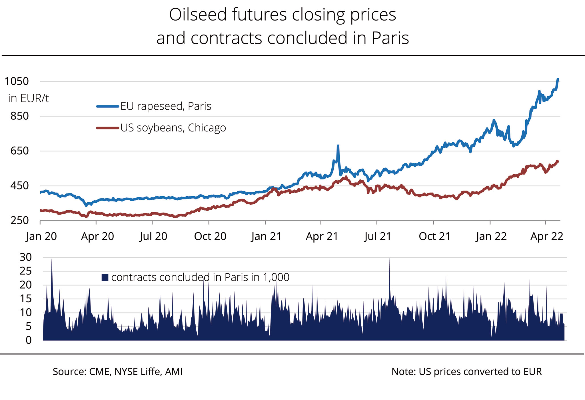 Paris futures market quotations for rapeseed have been climbing virtually unchecked for several months. The main reason for the strong price surge over the past few weeks is the crisis in the Black Sea region which was sparked by the Russian invasion in February 2022. Reports about the war in Eastern Europe fuelled prices at the international futures markets every minute at a time when prices were rising anyway due to tight supply to the market. Shortages in supply due to the absence of contractual delivery volumes from Ukrainian ports of export are now having a bearing on the entire global market. Concerns about global supply bottlenecks have also led to export restrictions or even bans, like the one the Indonesian government imposed on 28 April 2022. This situation caused rapeseed prices at the Paris stock exchange to explode. According to investigations conducted by Agrarmarkt Informations-Gesellschaft (mbH), price fluctuations of up to EUR 68 per tonne in one day were the order of the day in March 2022. Currently, stock exchange prices are driven by snow and cold spells in Canada, where rapeseed sowings should be underway. Prices exceeded the level of EUR 1,000 per tonne for the first time. More specifically, the May 2022 nearby closed at EUR 1,064.50 per tonne on 21 April 2022. The close compares to EUR 561.75 per tonne at the same time a year earlier and as little as EUR 366.75 per tonne in April 2020. This means that stock exchange prices almost tripled within two years.