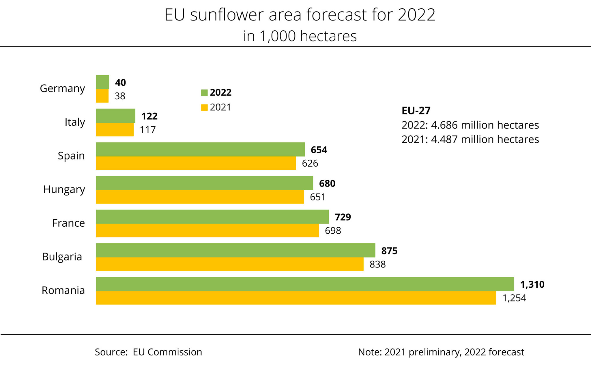 The EU Commission anticipates a significant increase in area for the 2022 harvest to a potential new record. The main reason is the expected expansion in production area in the most important sunflower-producing countries in the EU.