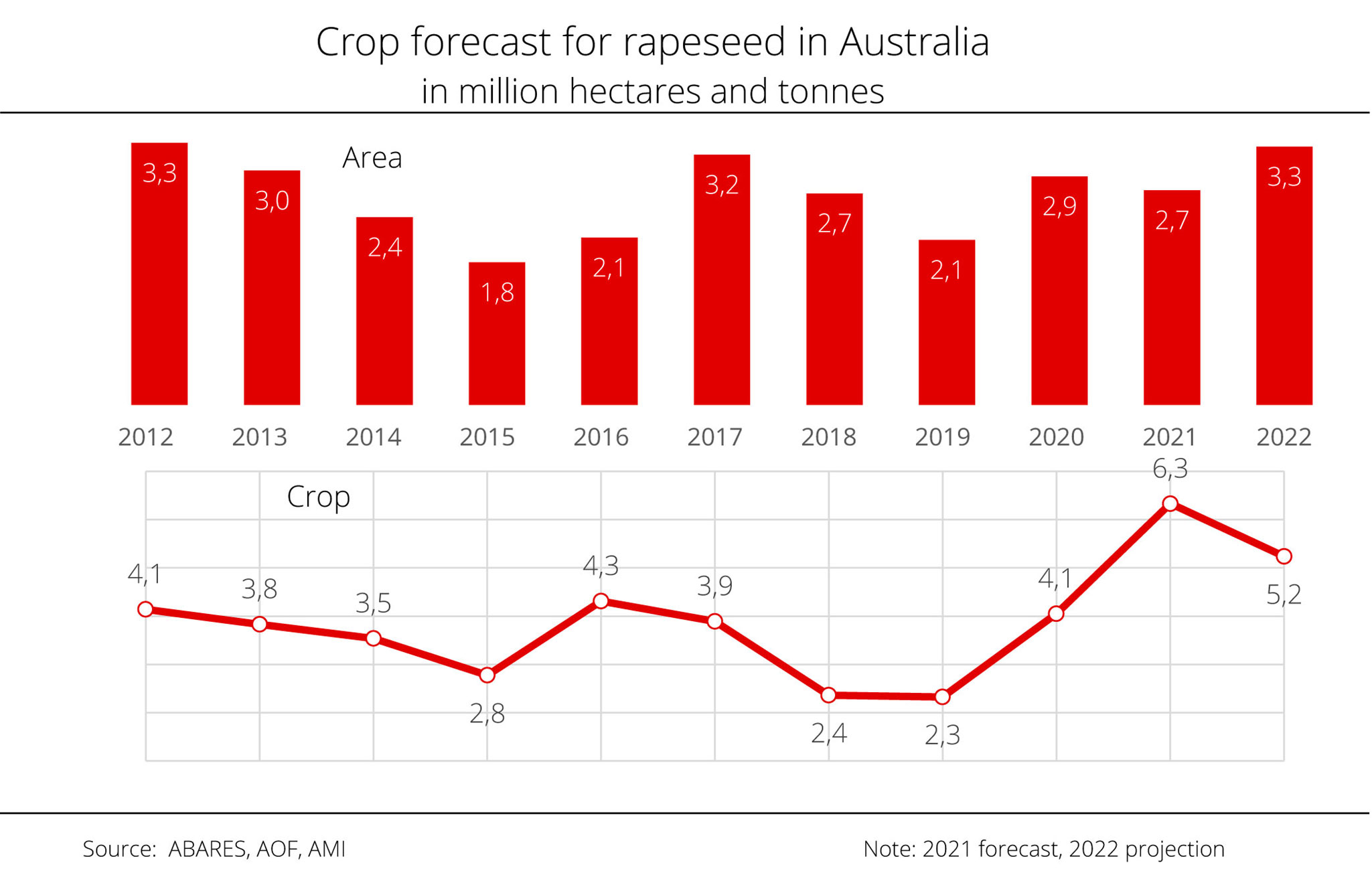 Previously good seeding conditions in many parts of the Australian production regions have allowed producers to expand the rapeseed area essentially as planned. The AOF expects the rapeseed area to reach 3.3 million hectares. This would translate to a 12 per cent rise year-on-year. However, 2022 yields are not expected to hit new record highs. In other words, the harvest could even be smaller than in the previous year. The 2021 yield amounted to 21.3 decitonnes per hectare. The 2022 rapeseed harvest is currently forecast at 5.2 million tonnes, which is down 17 per cent compared to the previous year's figure. According to the AOF, this would be an average yield.