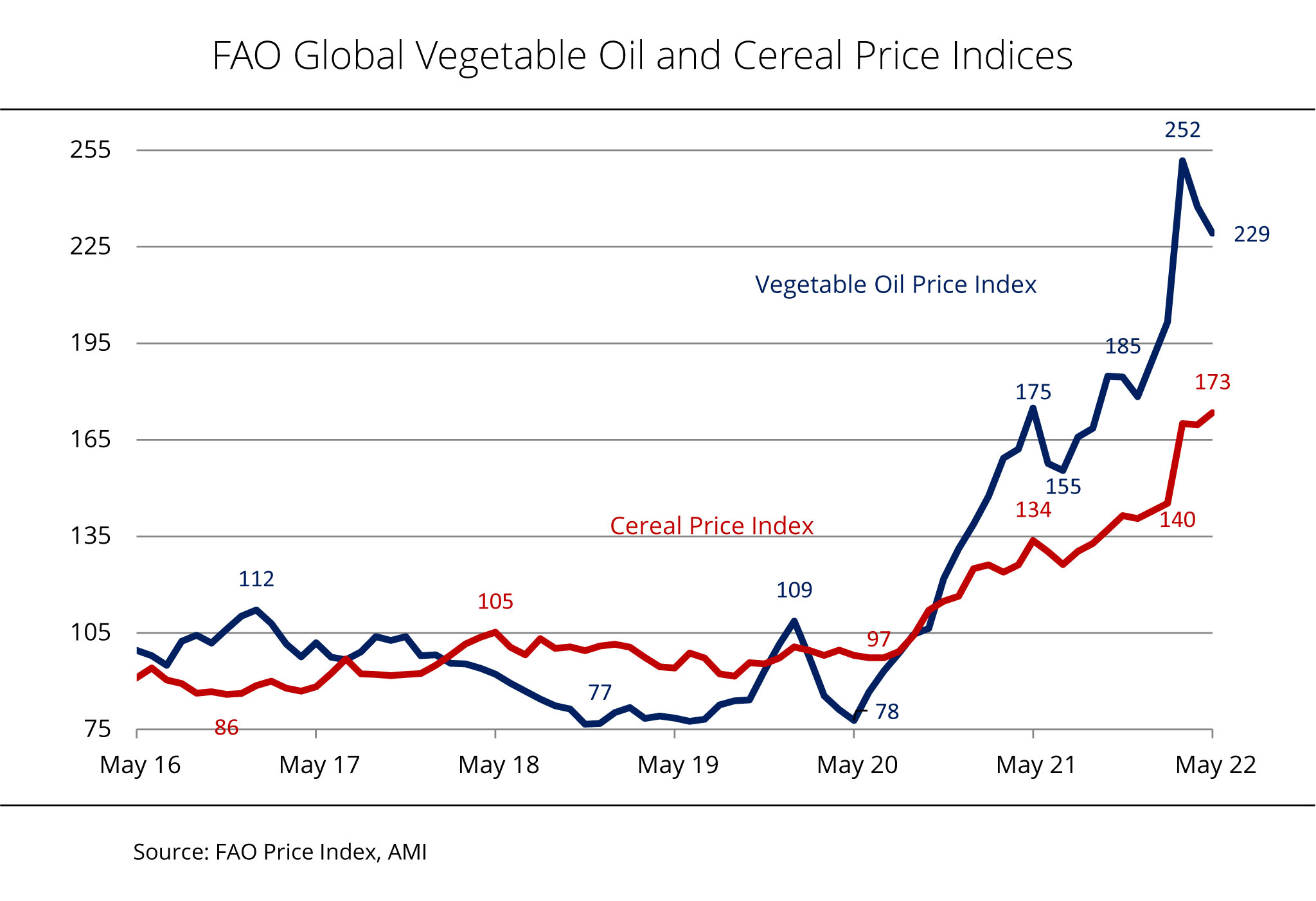The FAO vegetable oil price index decreased 8.3 points or 3.5 per cent to, on average, 229.3 points in May, but was still clearly above its year-earlier level. The decline was mainly caused by falling prices for palm, sunflower, soybean and rapeseed oil. Such falling prices, in turn, were partly due to the end of the Indonesian ban on exports of refined palm oil. Other reasons included the drop in world market sunflower oil prices from a record high level and reduced asking prices for soybean and rapeseed oil in response to waning demand. In the case of palm oil, prices were driven up by the persistent labour bottlenecks in Malaysia and the associated limited supply of palm oil.