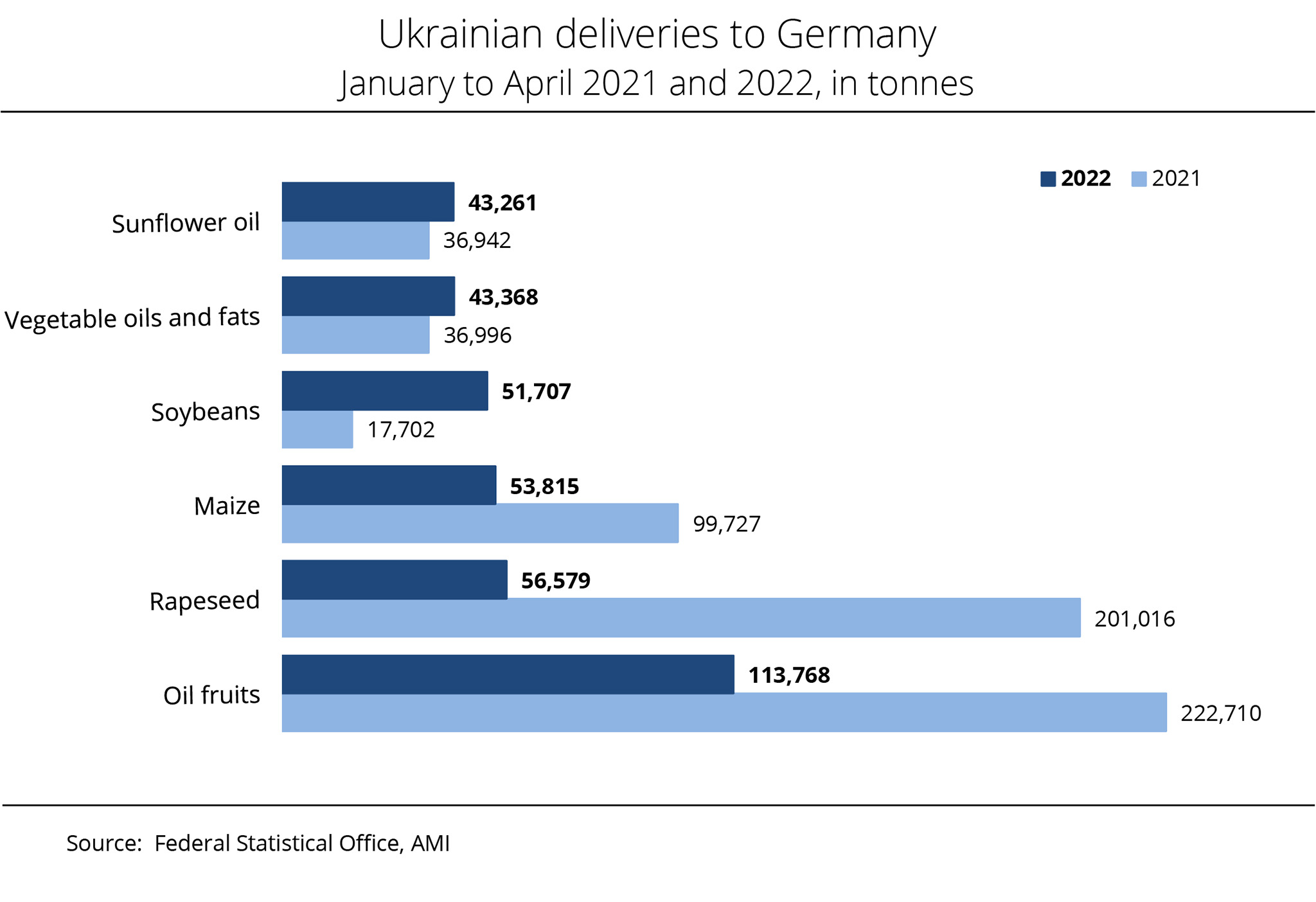 The picture was different for products of which smaller batches had generally been exported already in the past. More specifically, the amount of GMO-free soybeans Germany received directly from Ukraine between January and April almost tripled to 51,707 tonnes in 2022. Contrary to what some market participants feared, shipments of sunflower oil, which amounted to 43,261 tonnes, also exceeded the previous year's volume, of 36,942 tonnes, by 17 per cent.