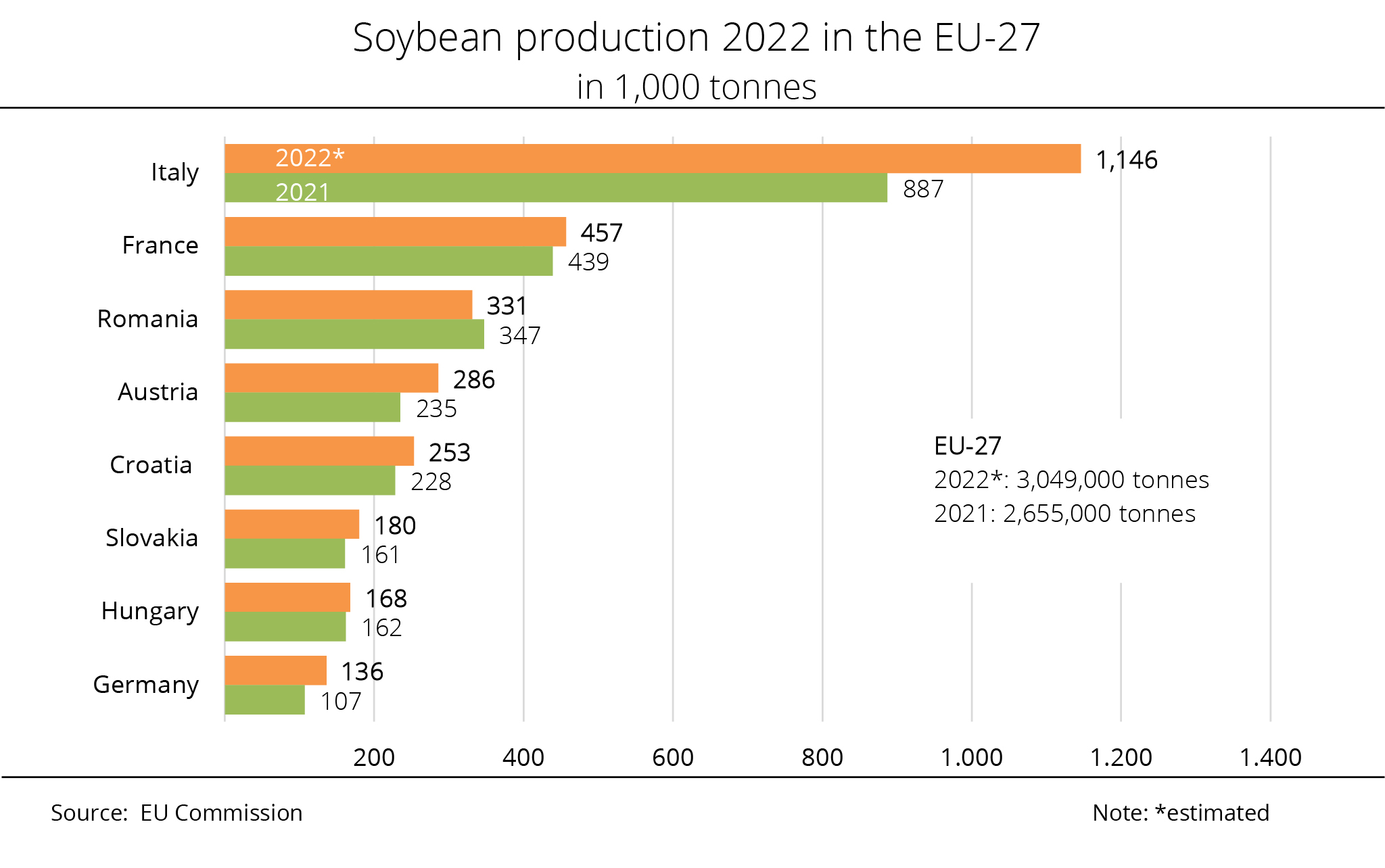 According to investigations conducted by Agrarmarkt Informations-Gesellschaft (mbH), the main reason for the growth in soy supply in the EU-27 is an expansion in area planted. The European Commission currently estimates the 2022 soybean area at around 1 million hectares. This translates to an expected rise in area of just less than 9 per cent on the previous year and would set a new record.