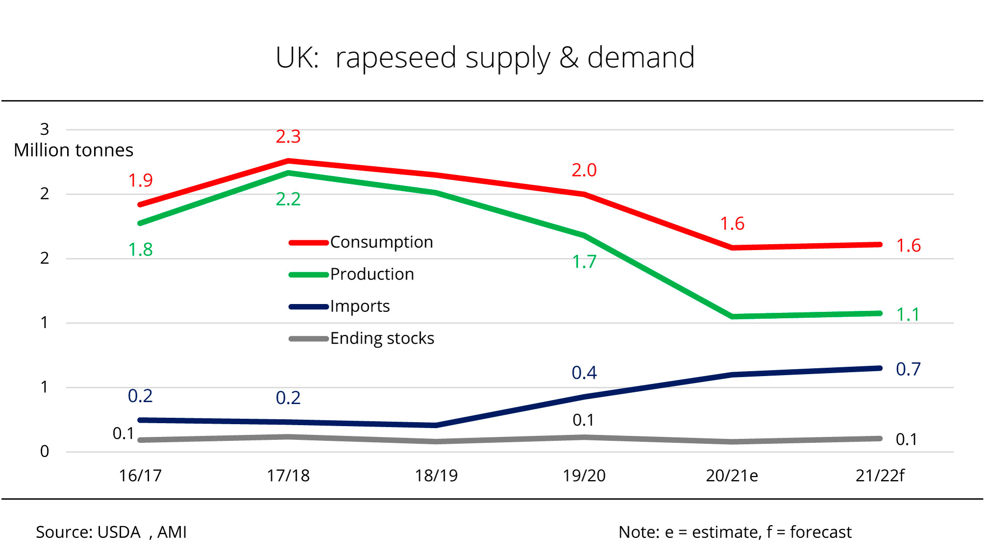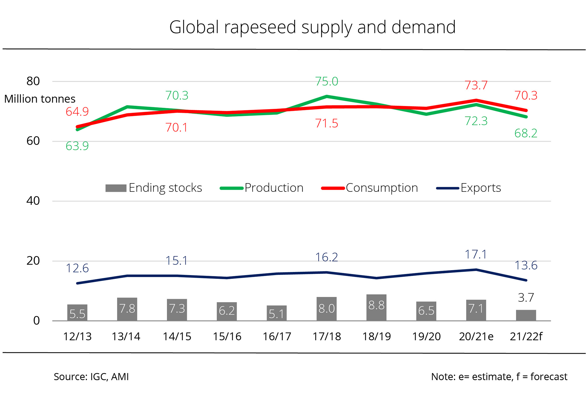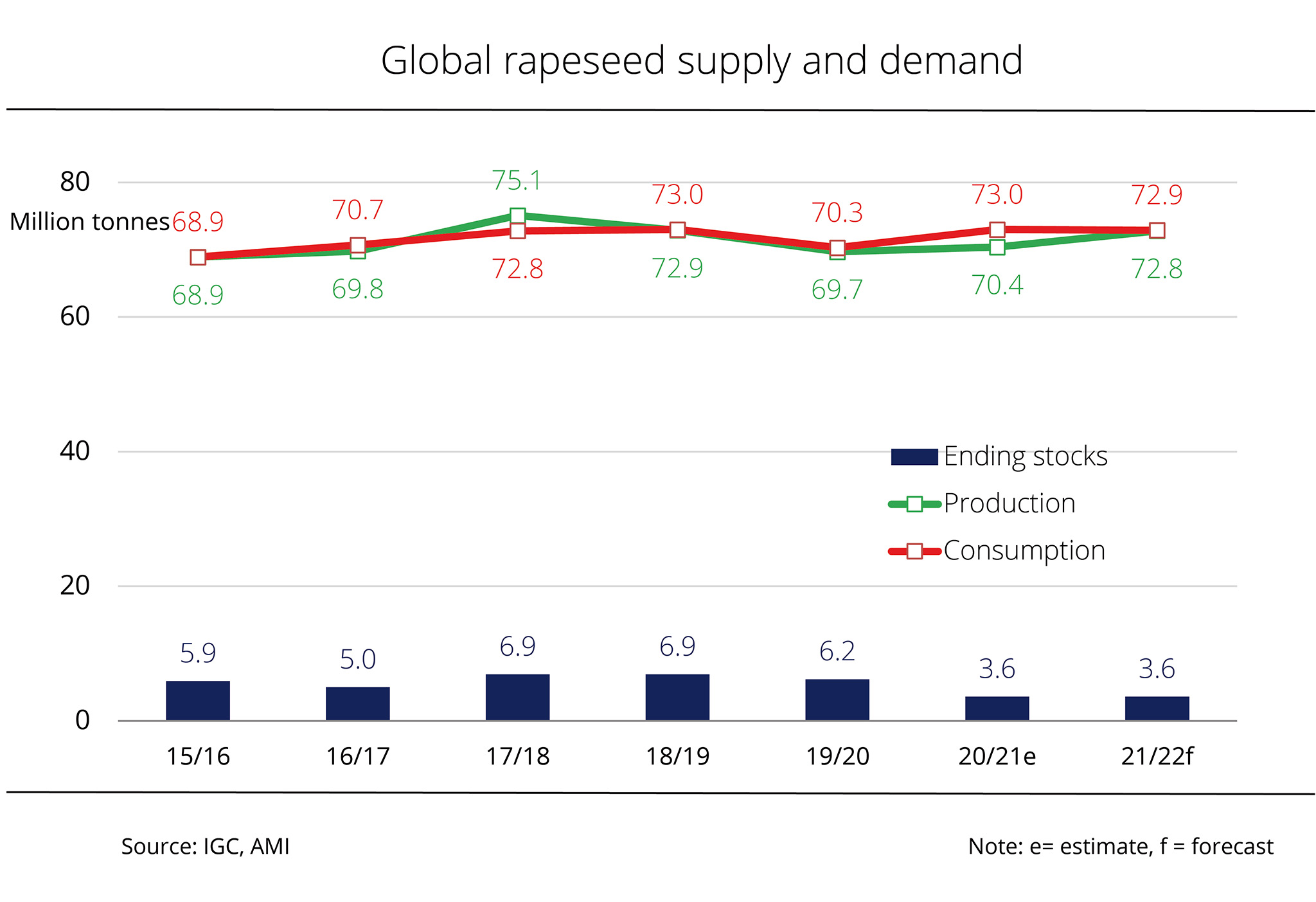 Prospects for a bounceback in global rapeseed supply in 2021/22 appear to be poor considering the expected low level of beginning stocks and moderate growth in production. 2021/22 ending stocks are therefore forecast at the previous year's level of 3.6 million tonnes. Stocks of the three big exporters, Australia, Canada and Ukraine, are anticipated to shrink to 1 million tonnes (from 1.2 million tonnes the previous year). This is mainly due to the decline in stocks in Canada.