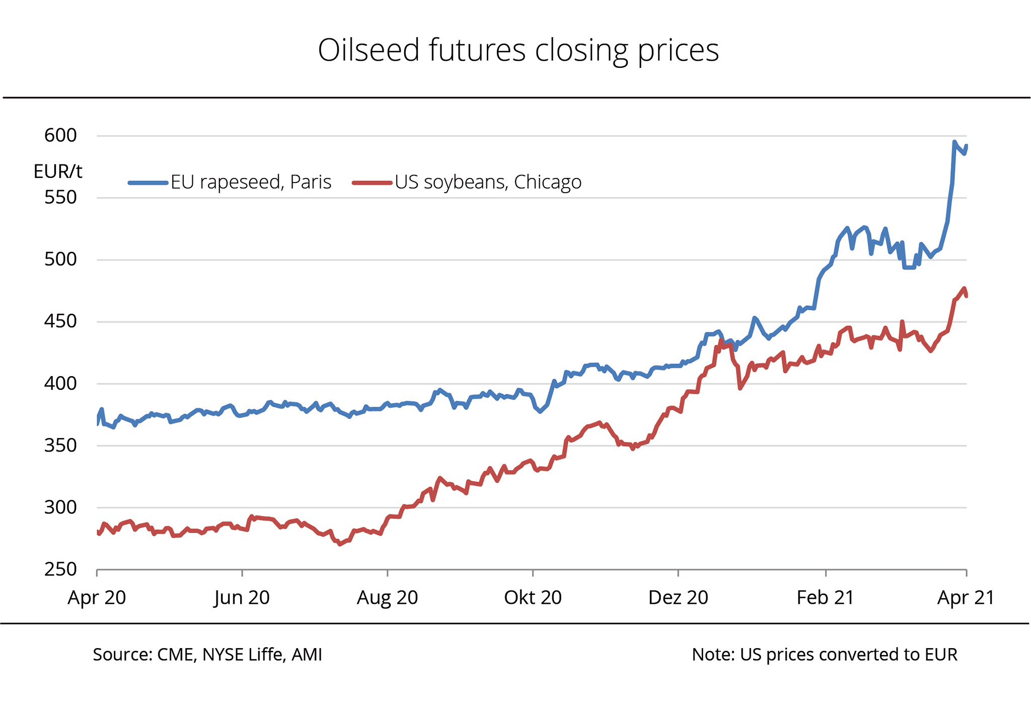 Limited supply of rapeseed both in Germany and abroad continued to drive prices up. Rapeseed prices in Germany have been on the increase almost continuously since the crop year began. In February 2021, their rise was especially sharp.