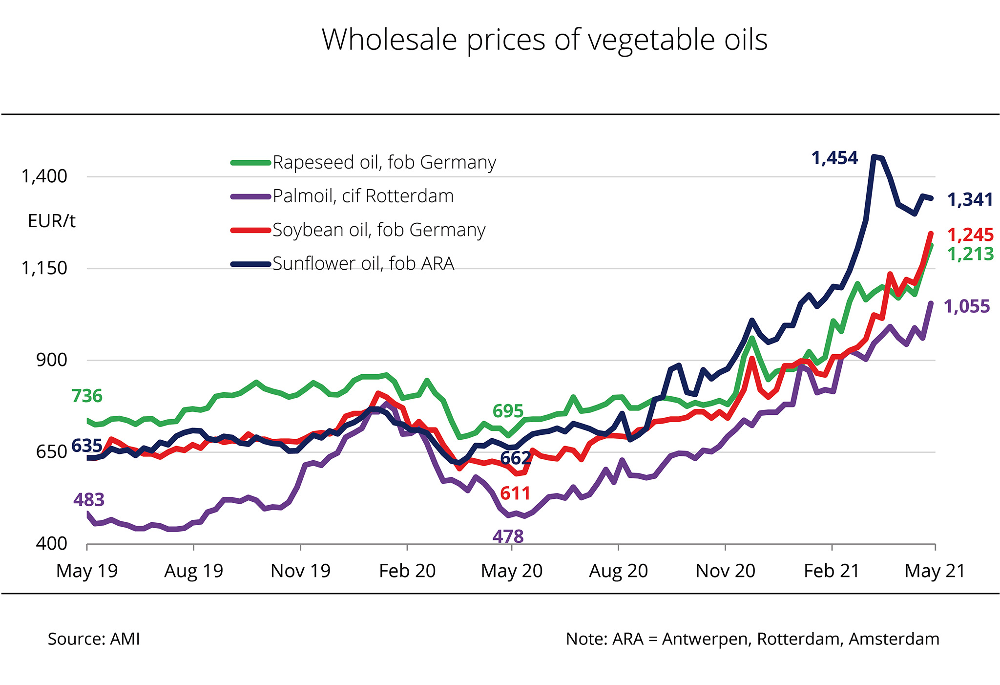 Both the FAO vegetable oil index and the cereal price index have risen sharply since mid-2020. The FAO's vegetable oil price index illustrates the changes in international prices of the ten most important vegetable oils in world trade. It reached 147 points in February 2021, which translates to a rise of around 6 per cent month-on-month and is the highest level since April 2012. The index has nearly doubled since May 2020. The sharp rise was sparked by the continued strong prices for palm, soybean, rapeseed and sunflower oil. Palm oil prices increased the ninth month running in February, driven by concerns about declining stocks in major export countries.